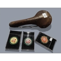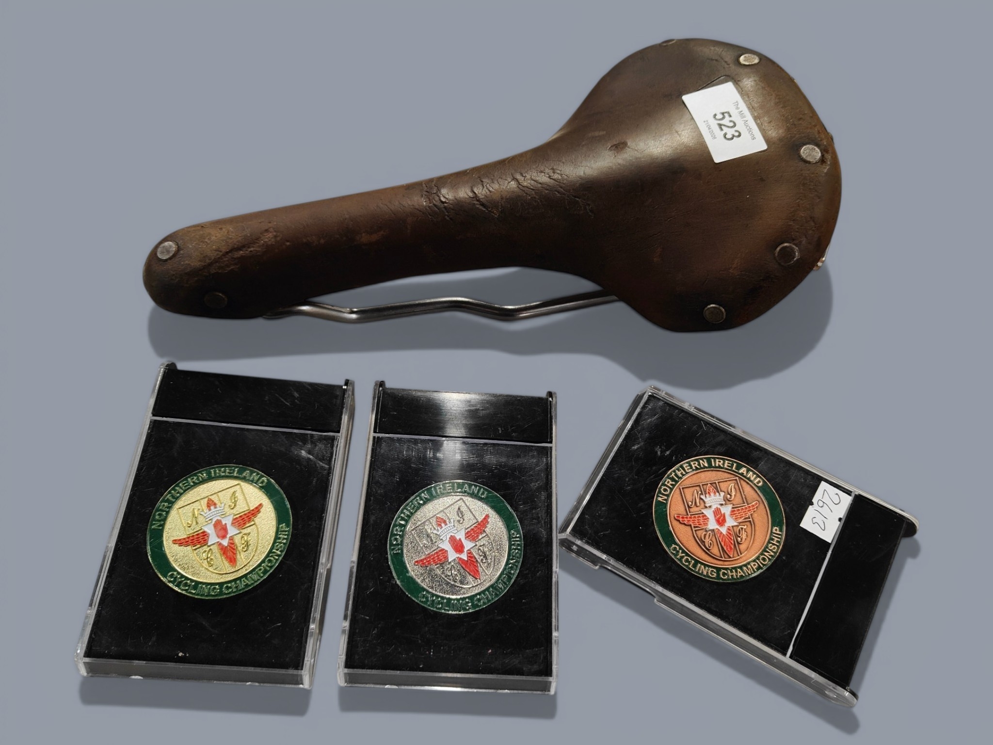 3 NORHTERN IRELAND CYCLING MEDALS AND BROOKES SEAT