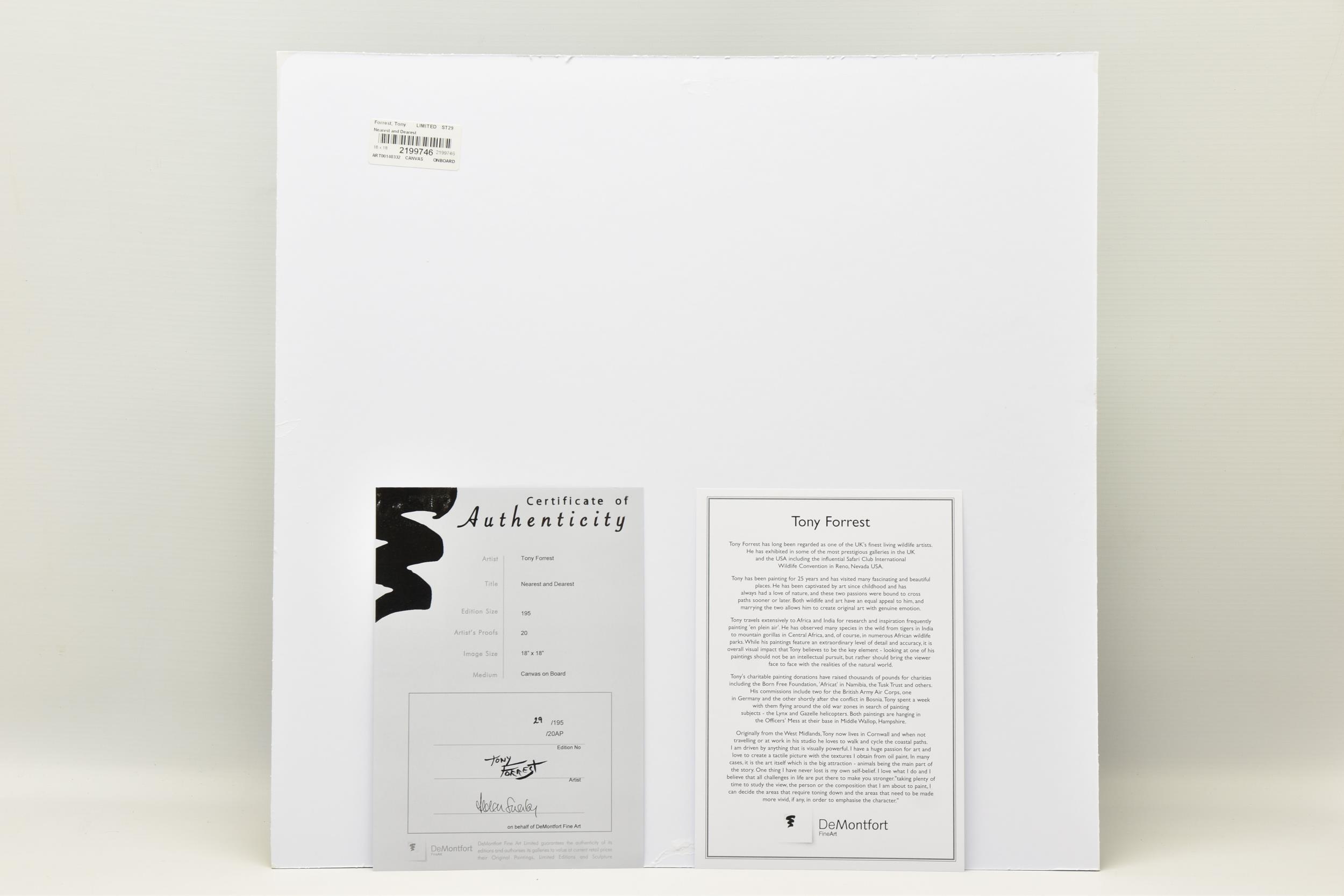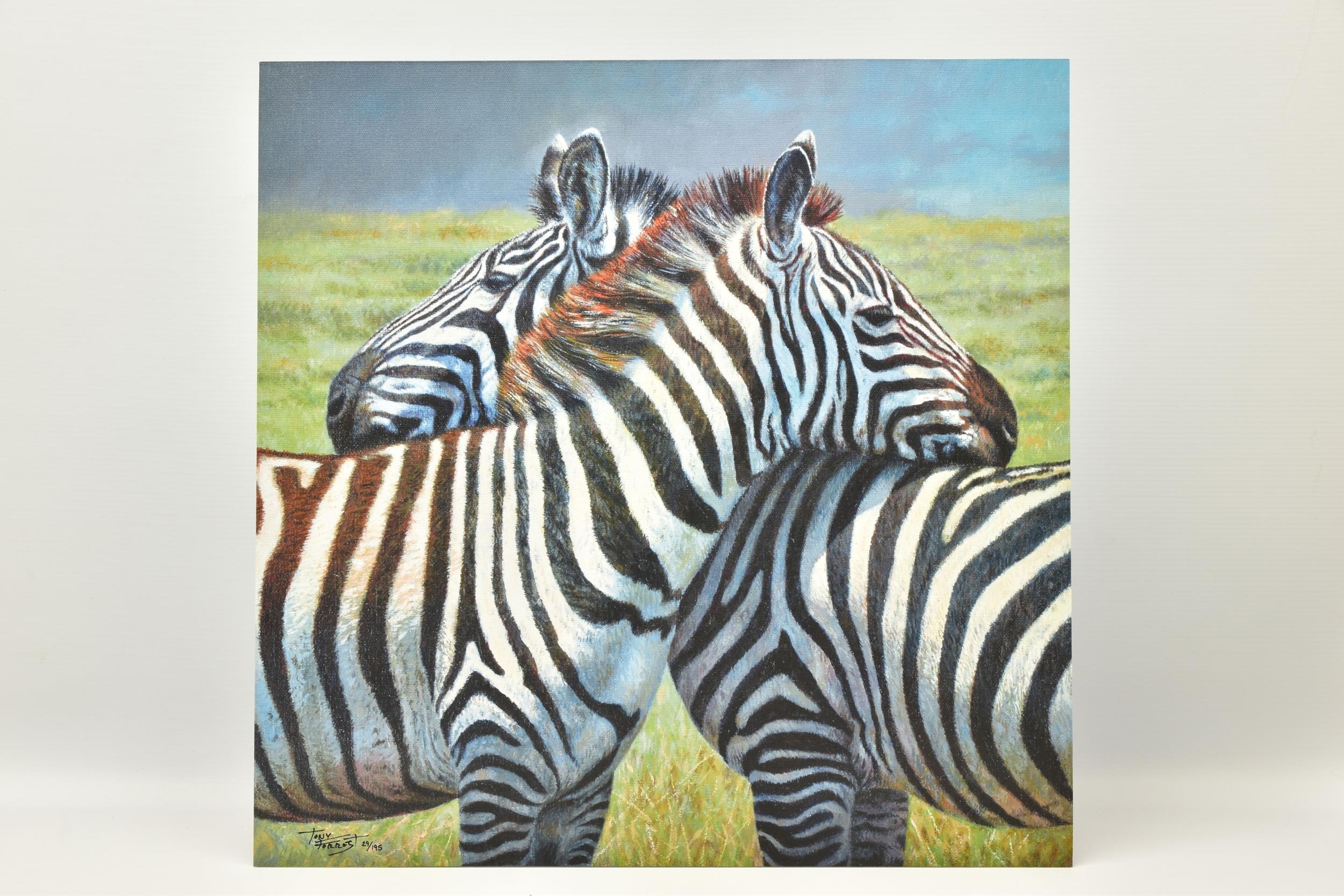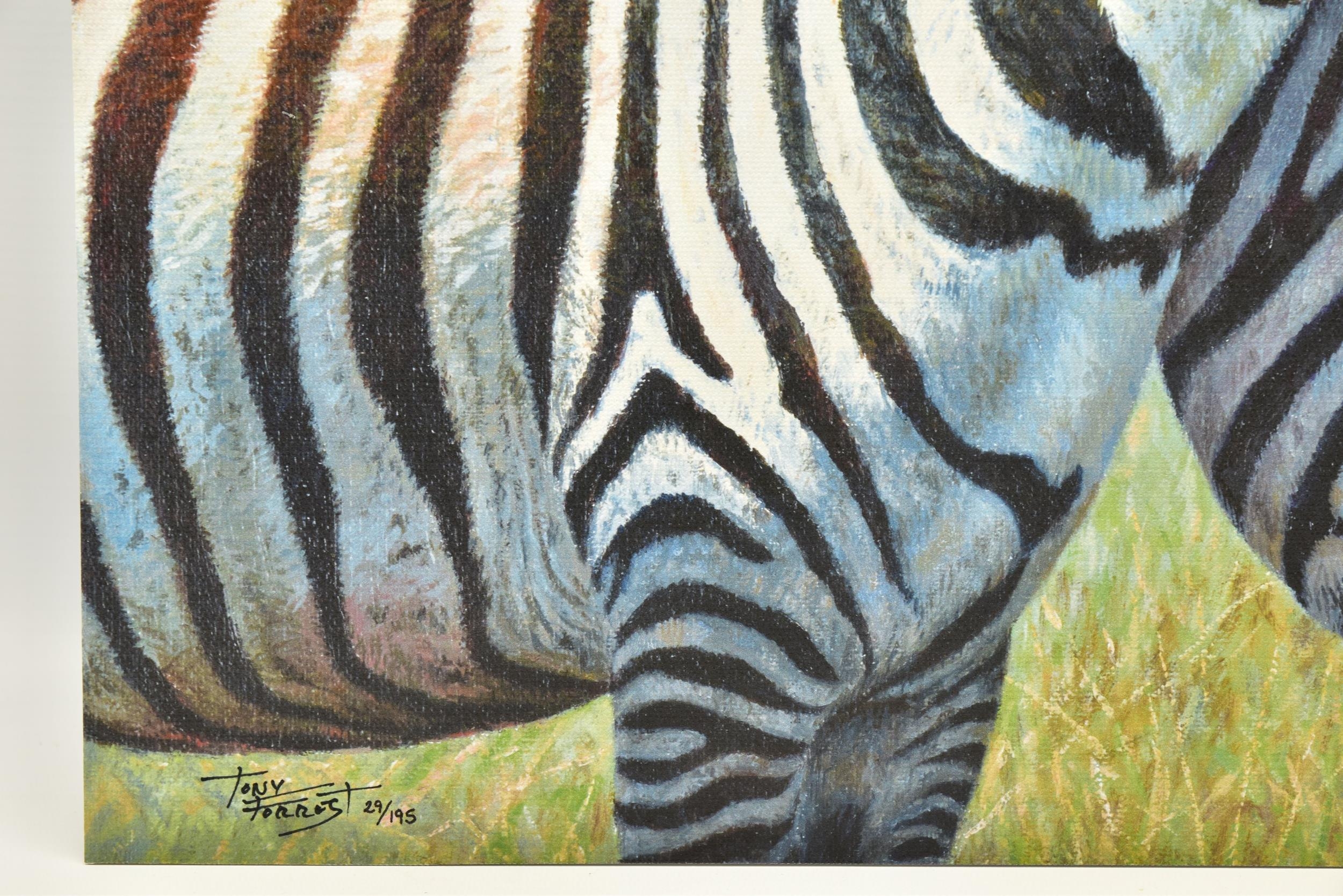 TONY FORREST (BRITISH 1961) 'NEAREST AND DEAREST', a signed limited edition print depicting zebras, 29/195 with certificate, approximate unmounted size 46cm x 46cm, Condition: no obvious damage (artist resale rights apply)