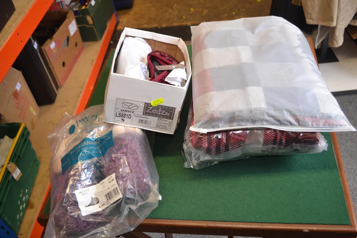 Pair of size 6 slippers & pair of size 5 slippers plus various blankets. All appear new.