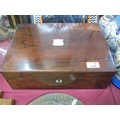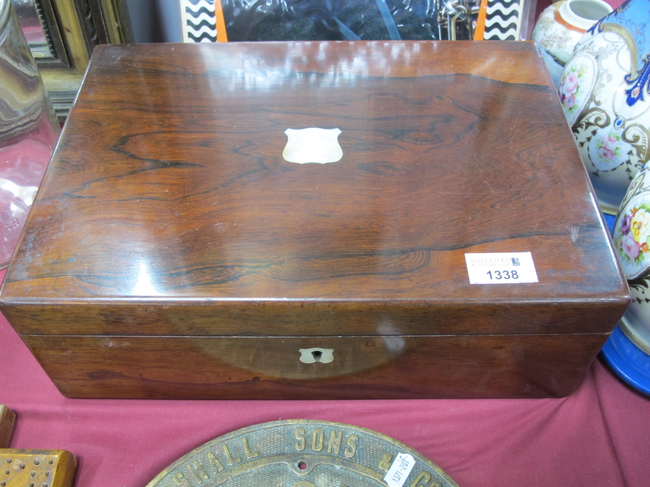 A XIX Century Rosewood Writing Box, with mother of pearl blank shield nameplate and escutcheon, morocco toole slope and fitted interior, 35.5cm wide.
