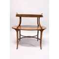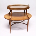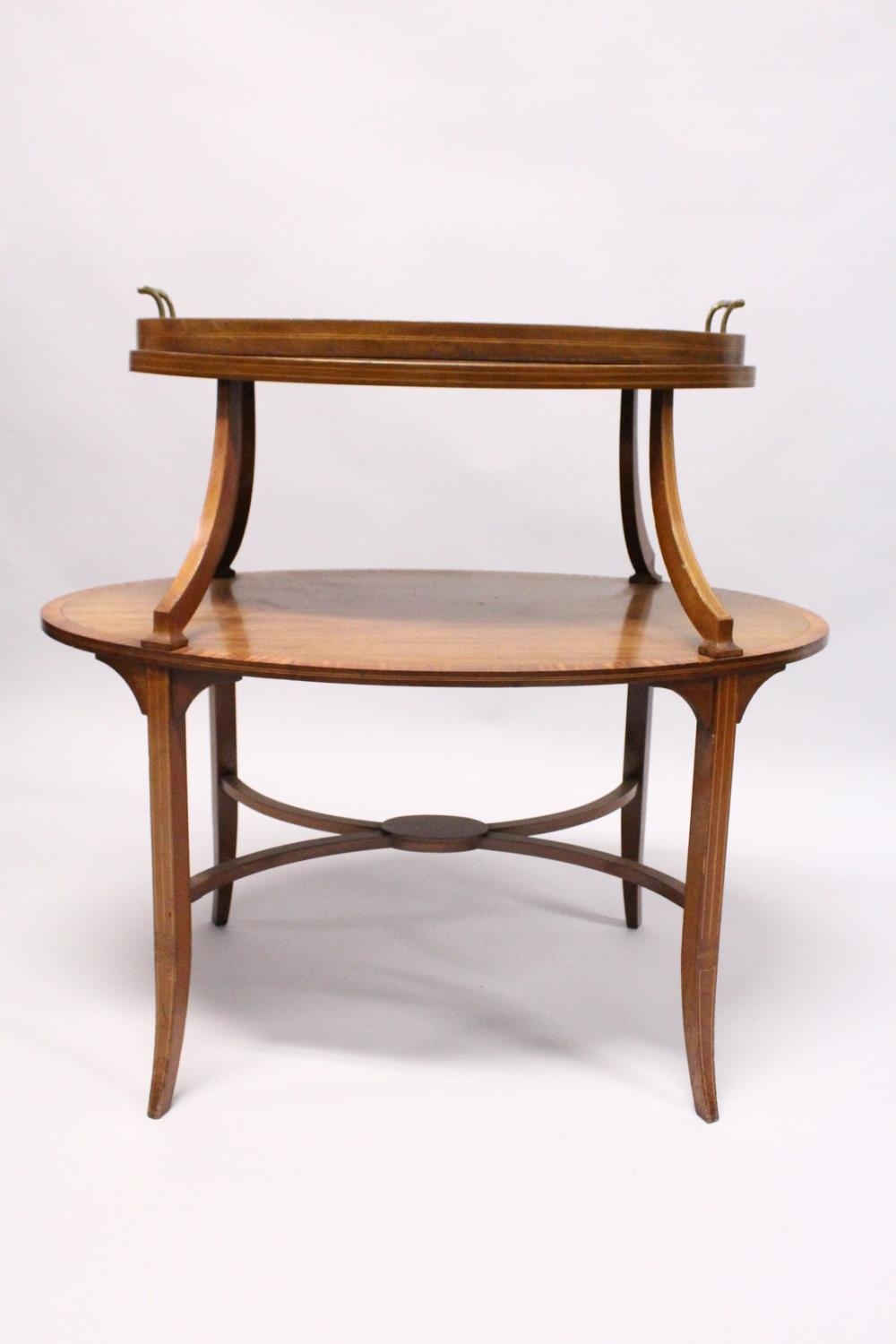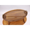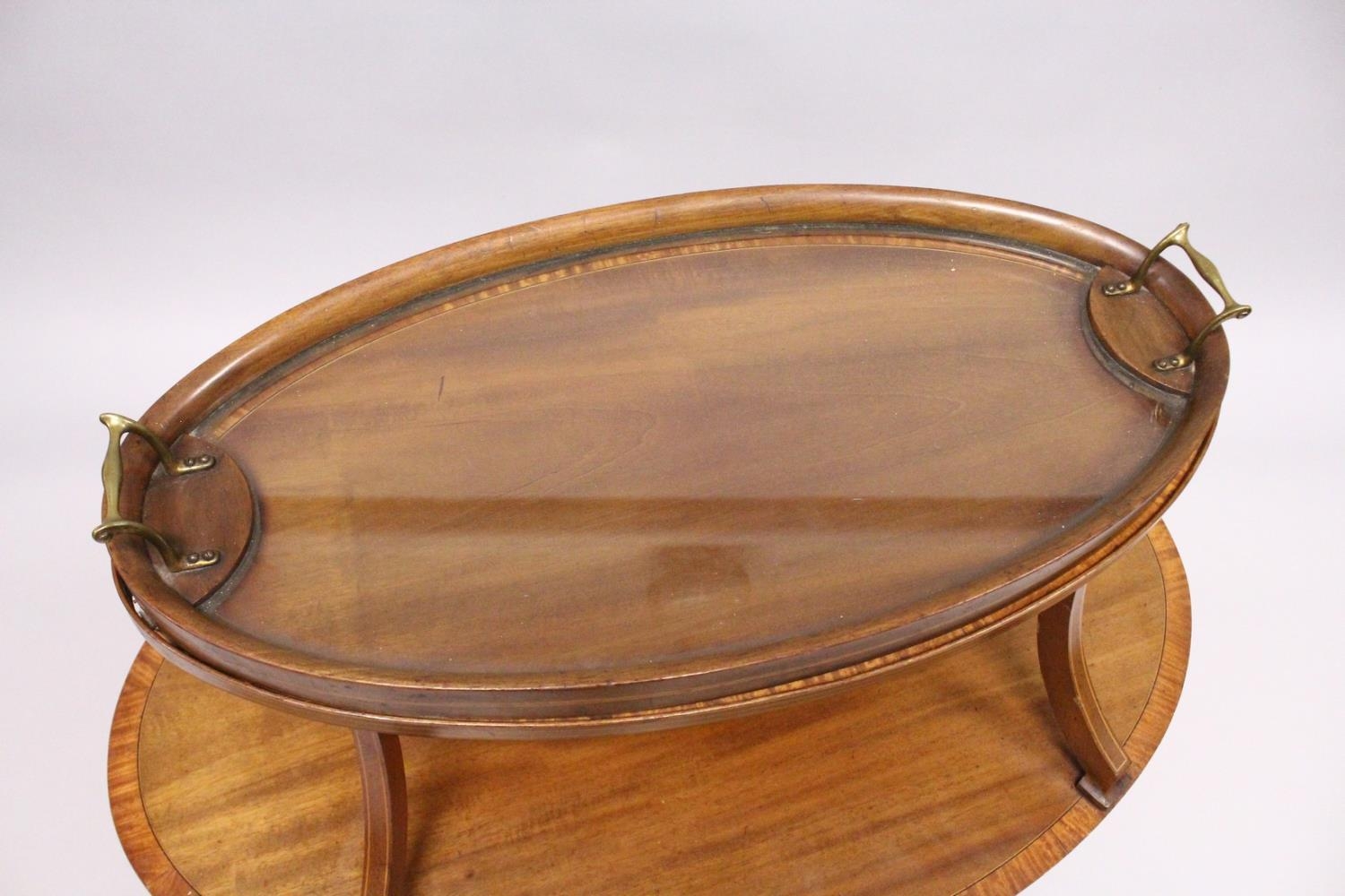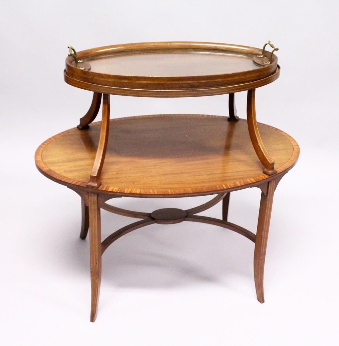 A GOOD MAHOGANY OVAL TWO TIER TABLE with detatchable two handled glass tray on curving support with cross frame under tier.
