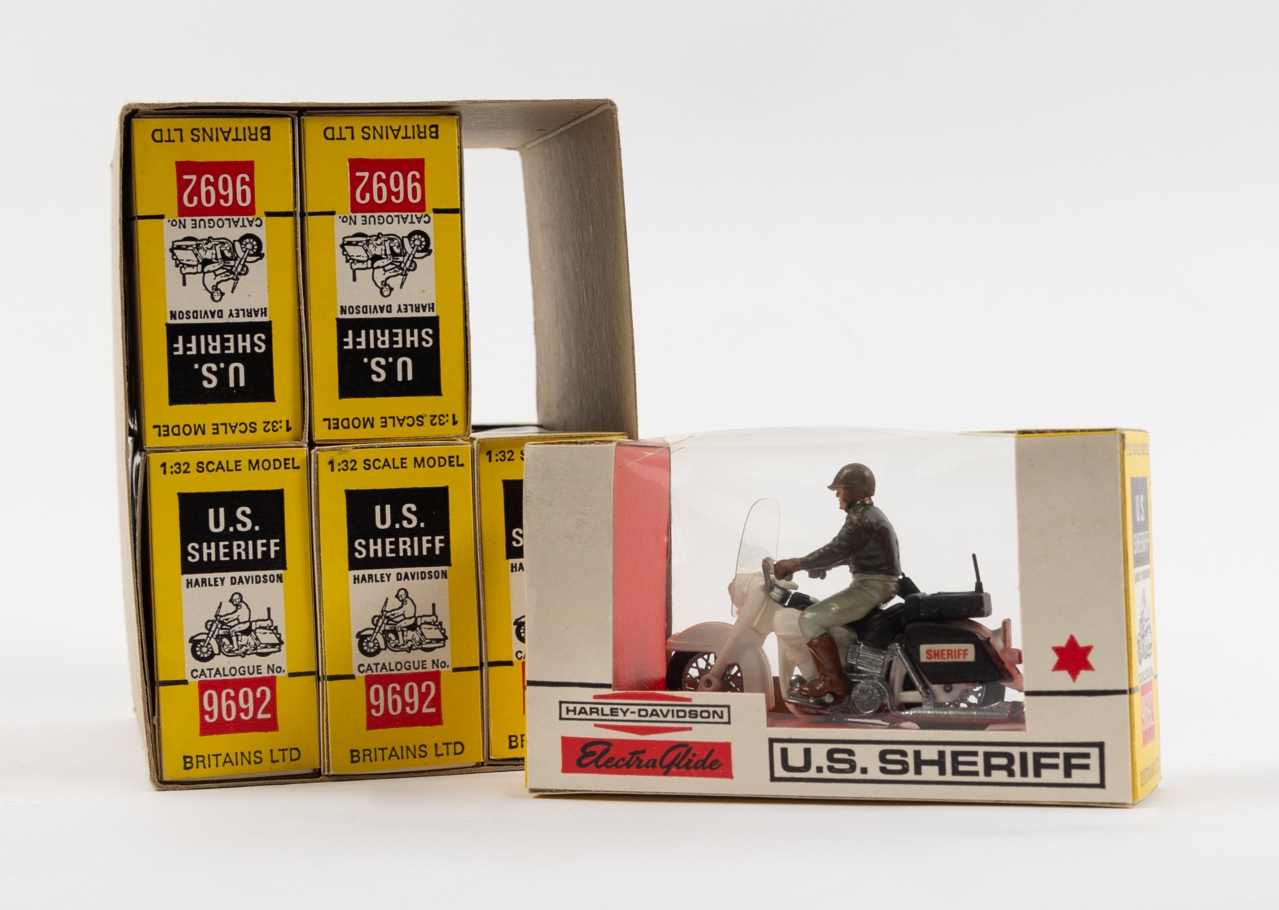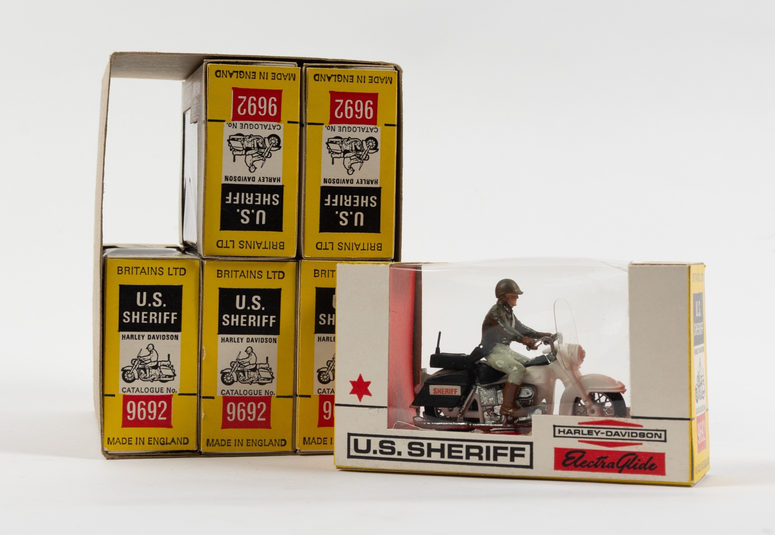 6 Britains ltd No.9692 U.S. Sheriff Harley Davidson motorcycles, 1:32 scale. All are boxed and look unused contained in the original card shipping sleeve. From the 1970s. VGC-Mint. £60-80