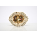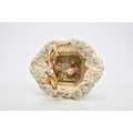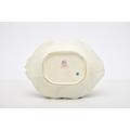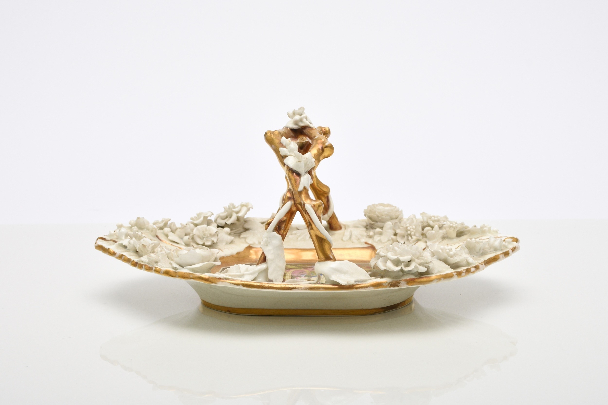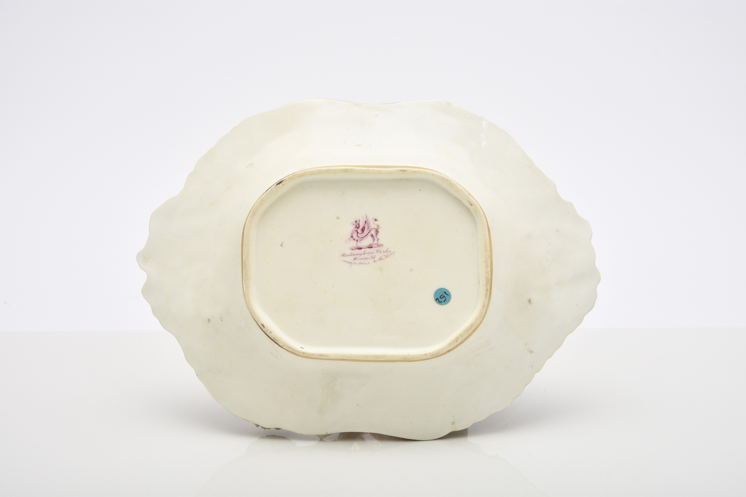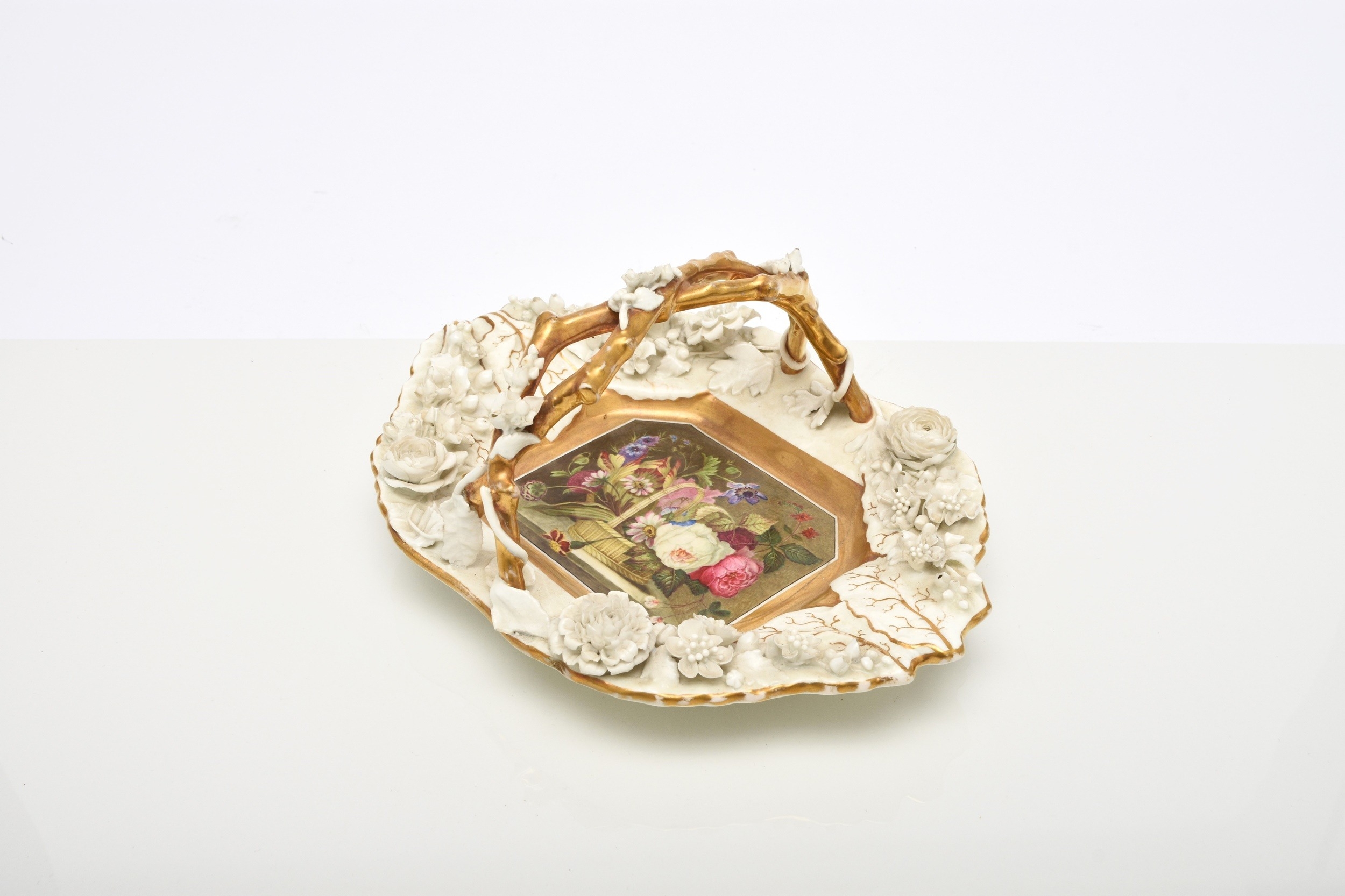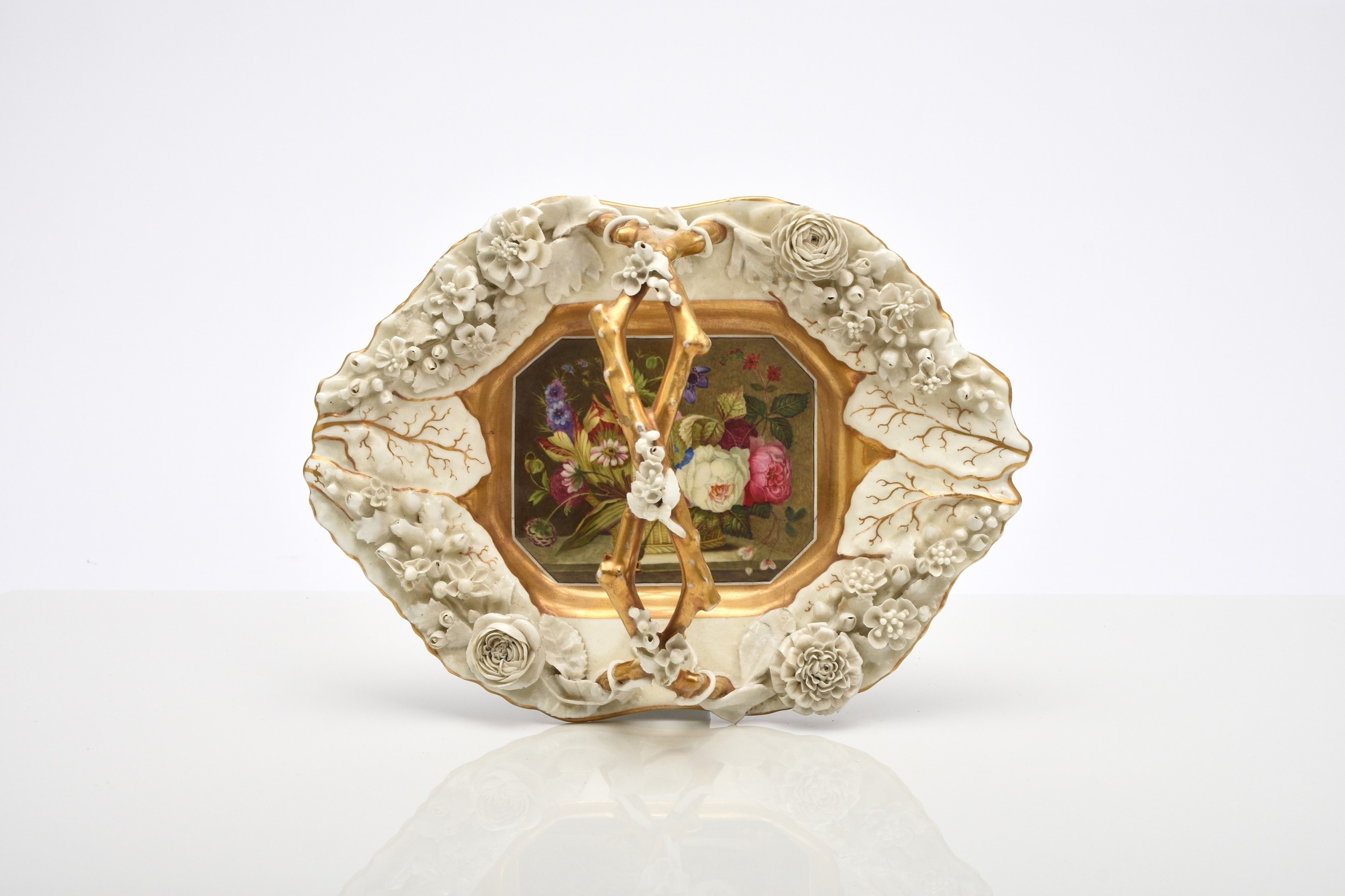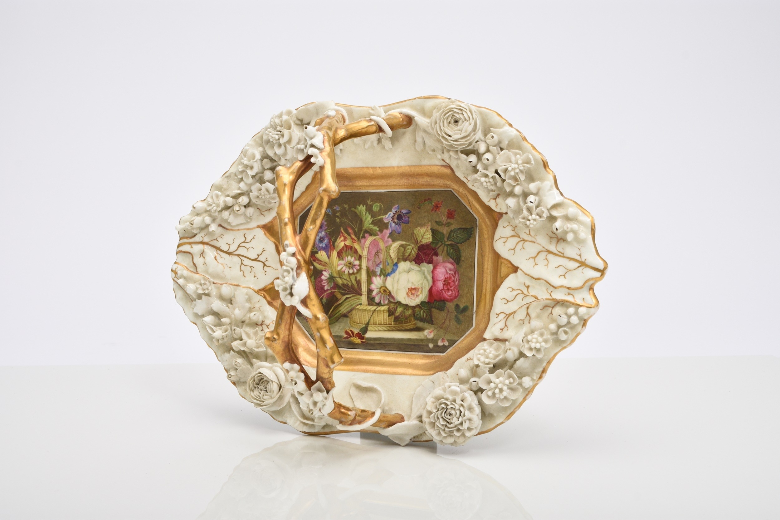 A Rockingham porcelain basket, circa 1835, of canted rectangular form with central entwined handle, the rim encrusted with flowers left in the white, the centre nicely painted in polychrome with a basket of flowers, puce factory mark, 22.5cm wide (a.f) Condition:Crack visible to the front right-hand side of the basket panel.