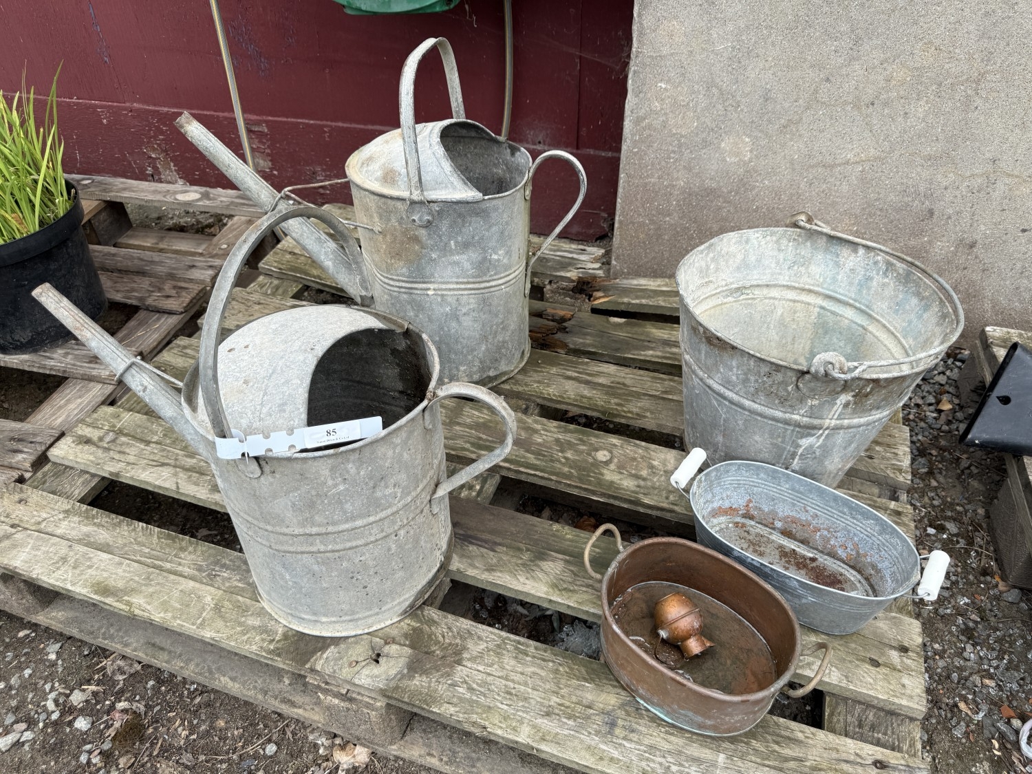 Two vintage galvanised watering cans, a pail etc.