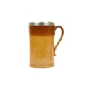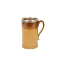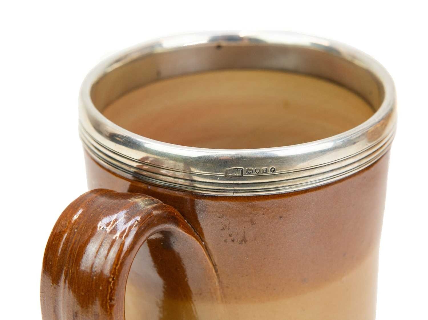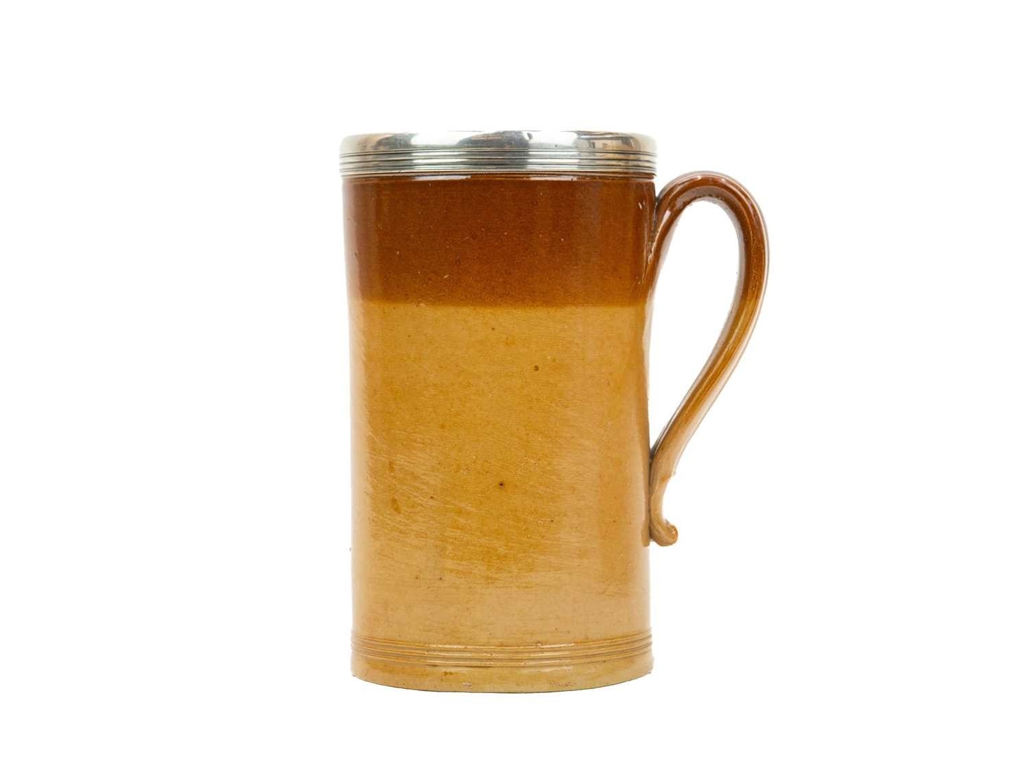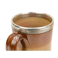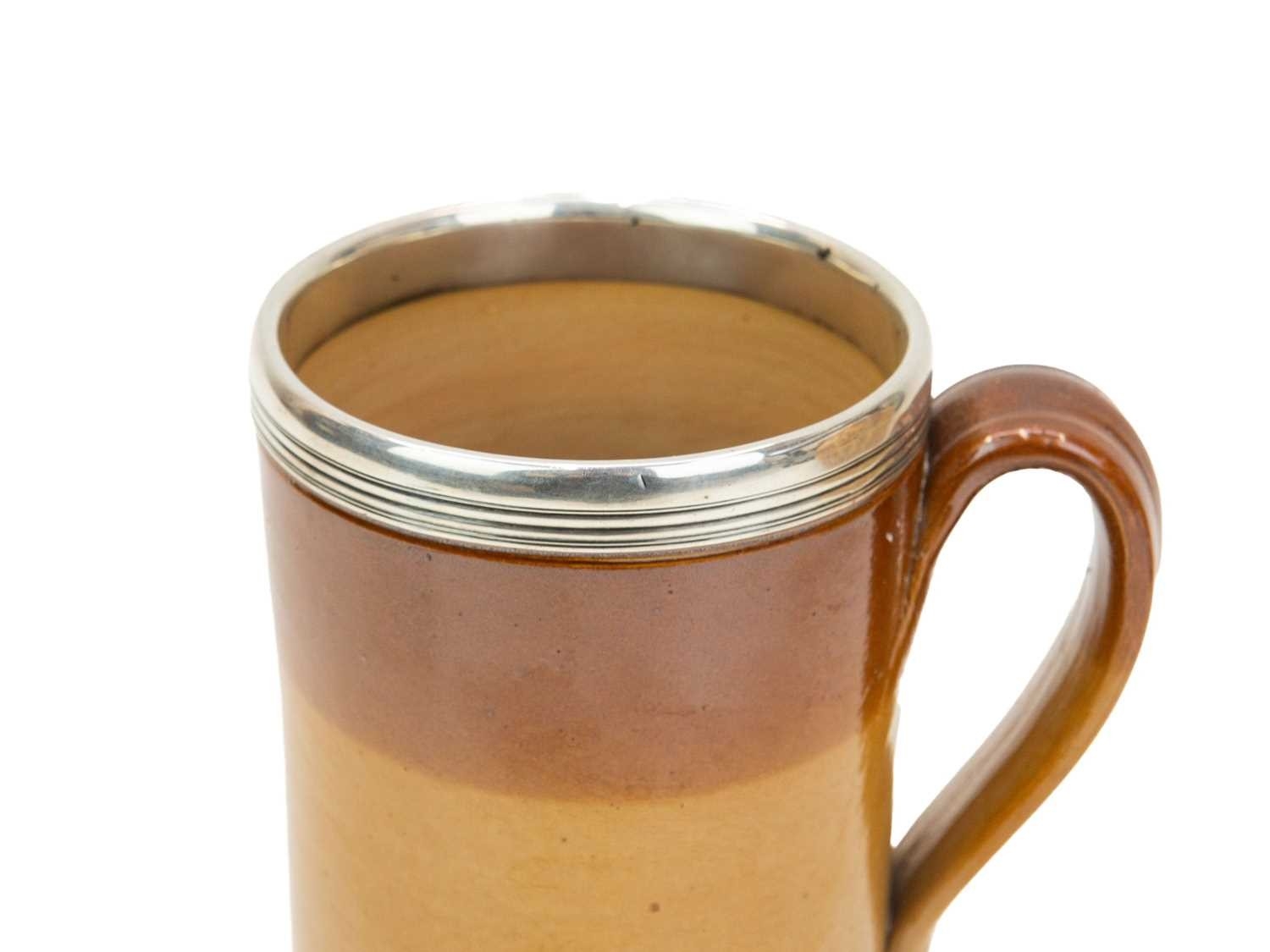 A large Victorian brown salt glazed mug, with a silver mounted rim. Hallmarked London, 1870, height 18cm.