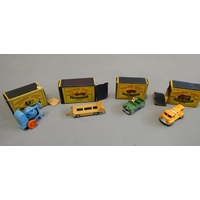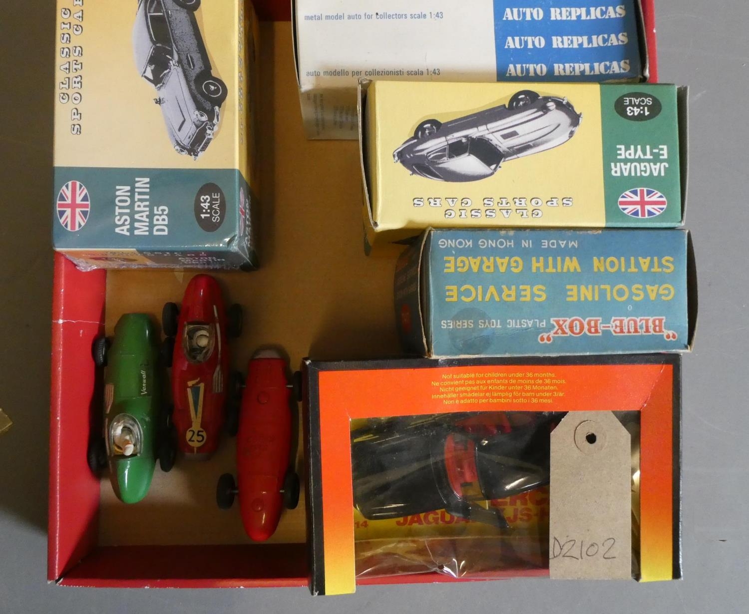 Mixed diecast cars including Atlas DB5 and Jaguar E-Type, Corgi Supercat Jaguar, three small race cars and Blue-Box garage. Most items boxed