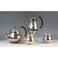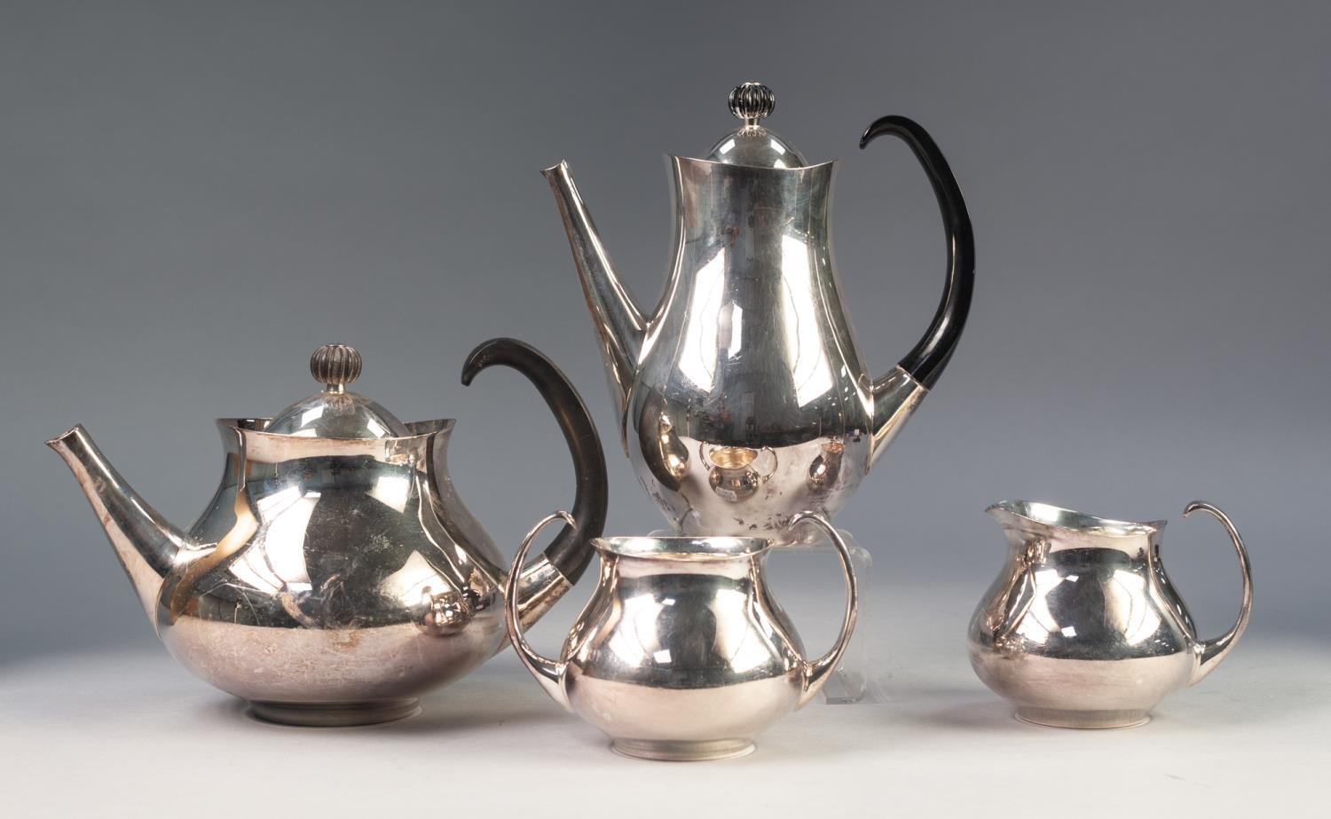 ERIC CLEMENTS FOR ELKINGTON, FOUR PIECE SILVER PLATED TEA SERVICE, of plain baluster form, with open high scroll handles and circular bases, stamped marks and pattern no: W 29945, (4)