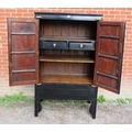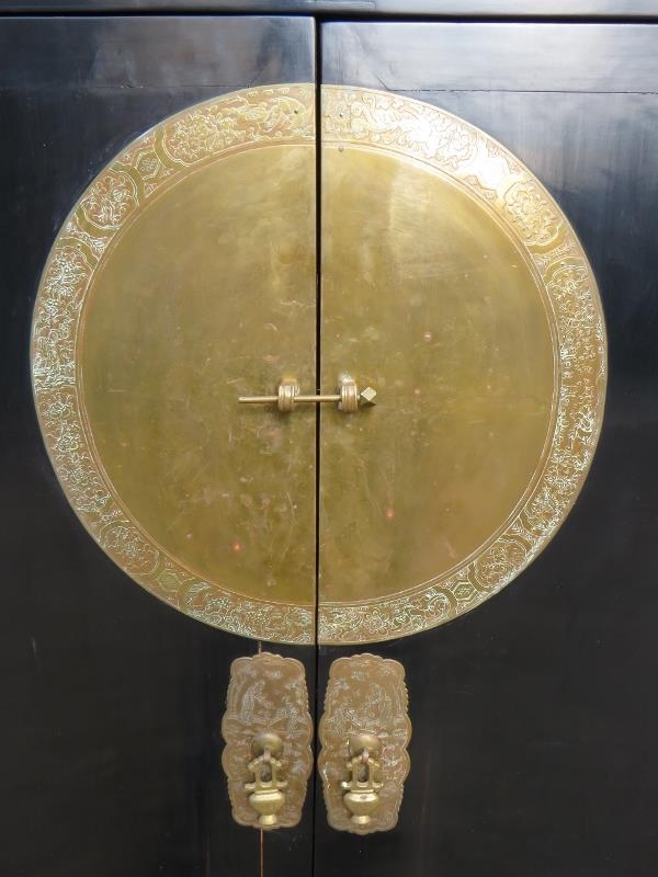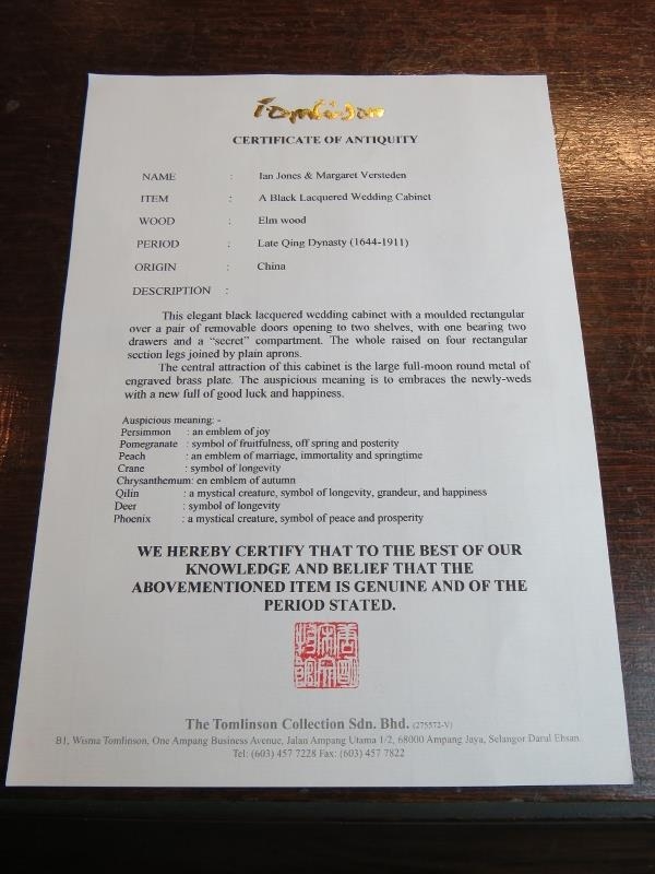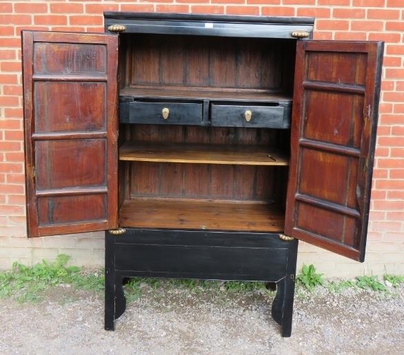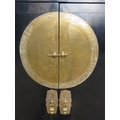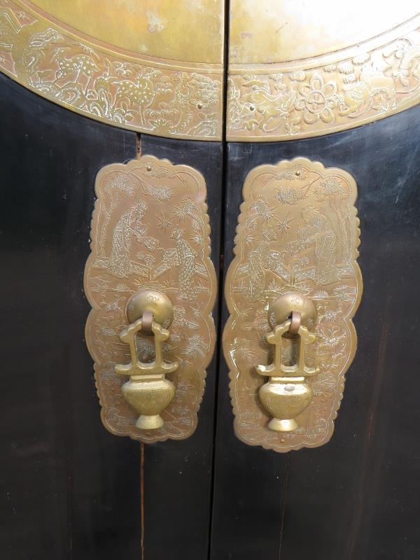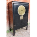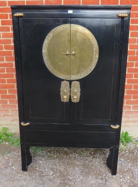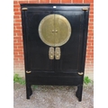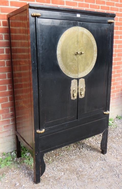A 20th century Chinese black lacquered elm marriage cabinet, the double doors opening to reveal three shelves, the top shelf housing two short drawers. There is a false base which opens to reveal a 'secret' compartment.