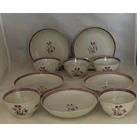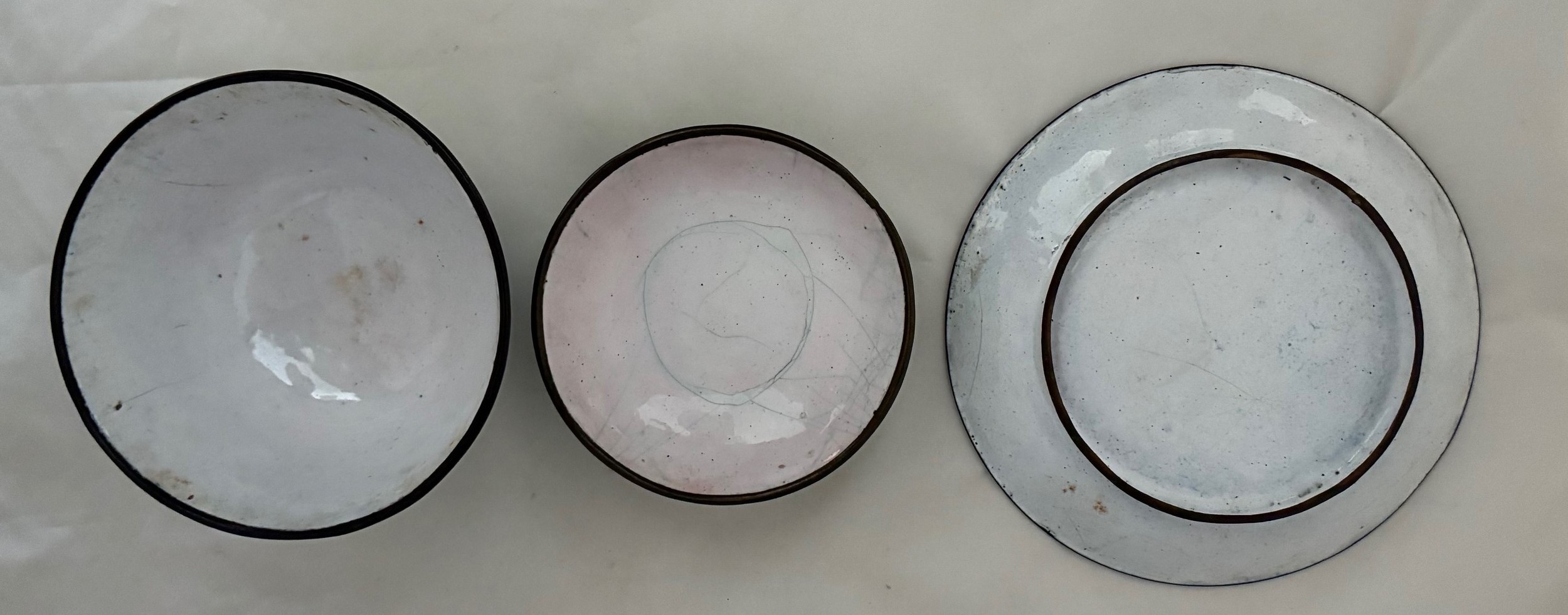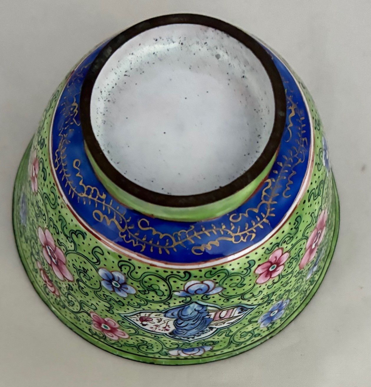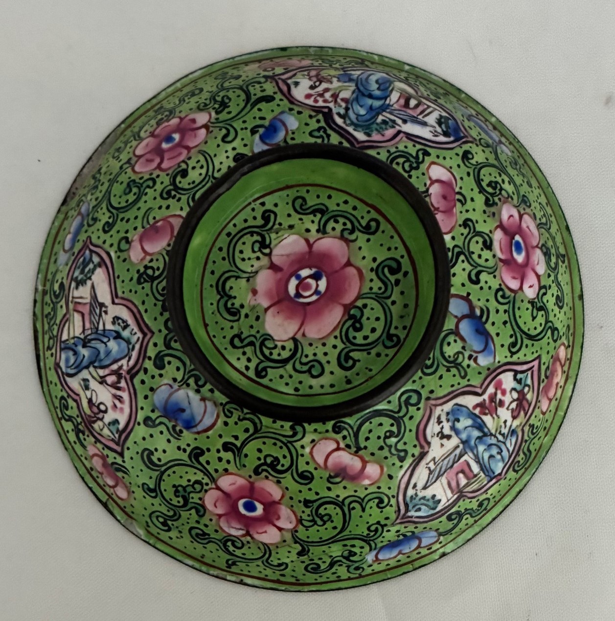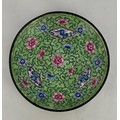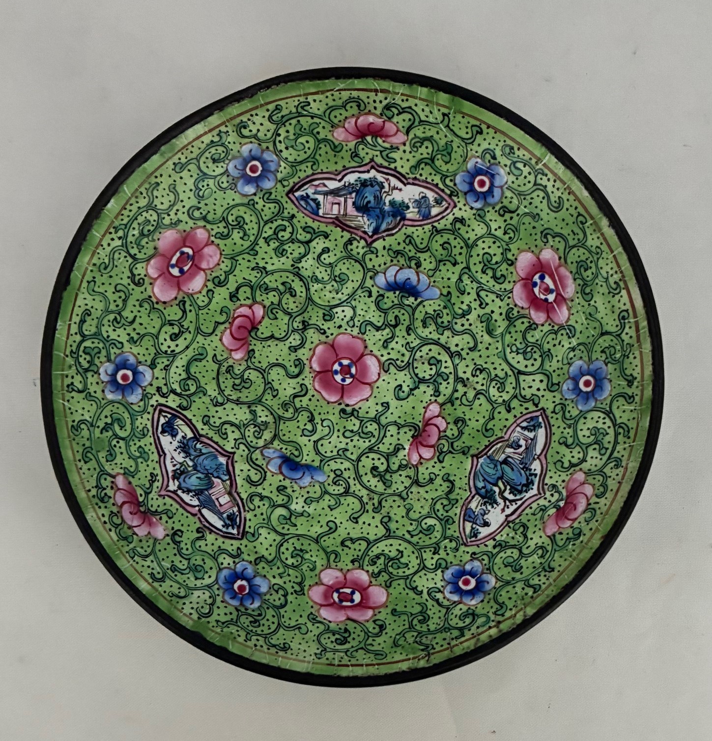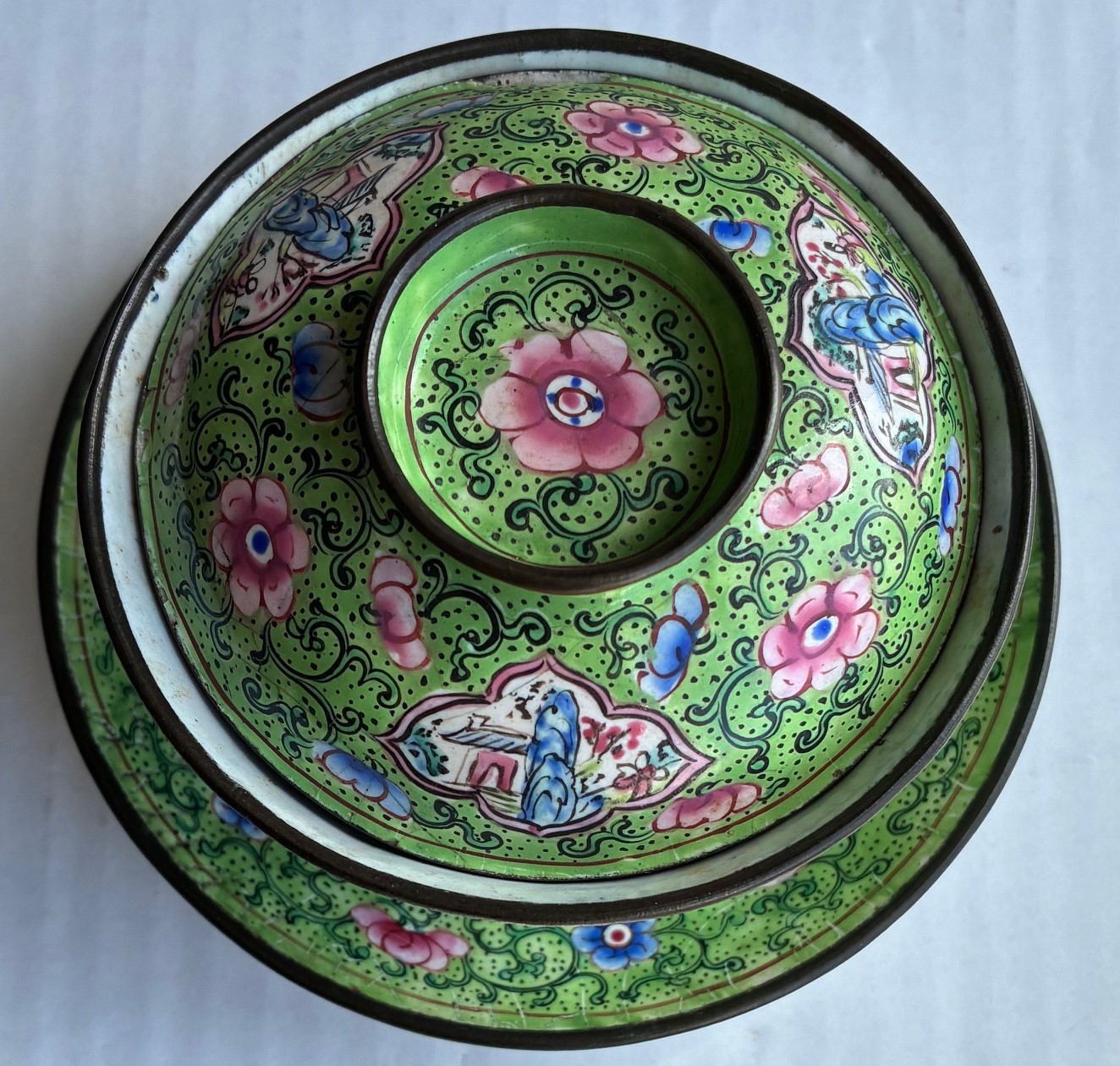 Chinese Quing Dynasty enamel saucer, tea cup and cover, decorated with pink flowers on a green ground (3).