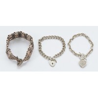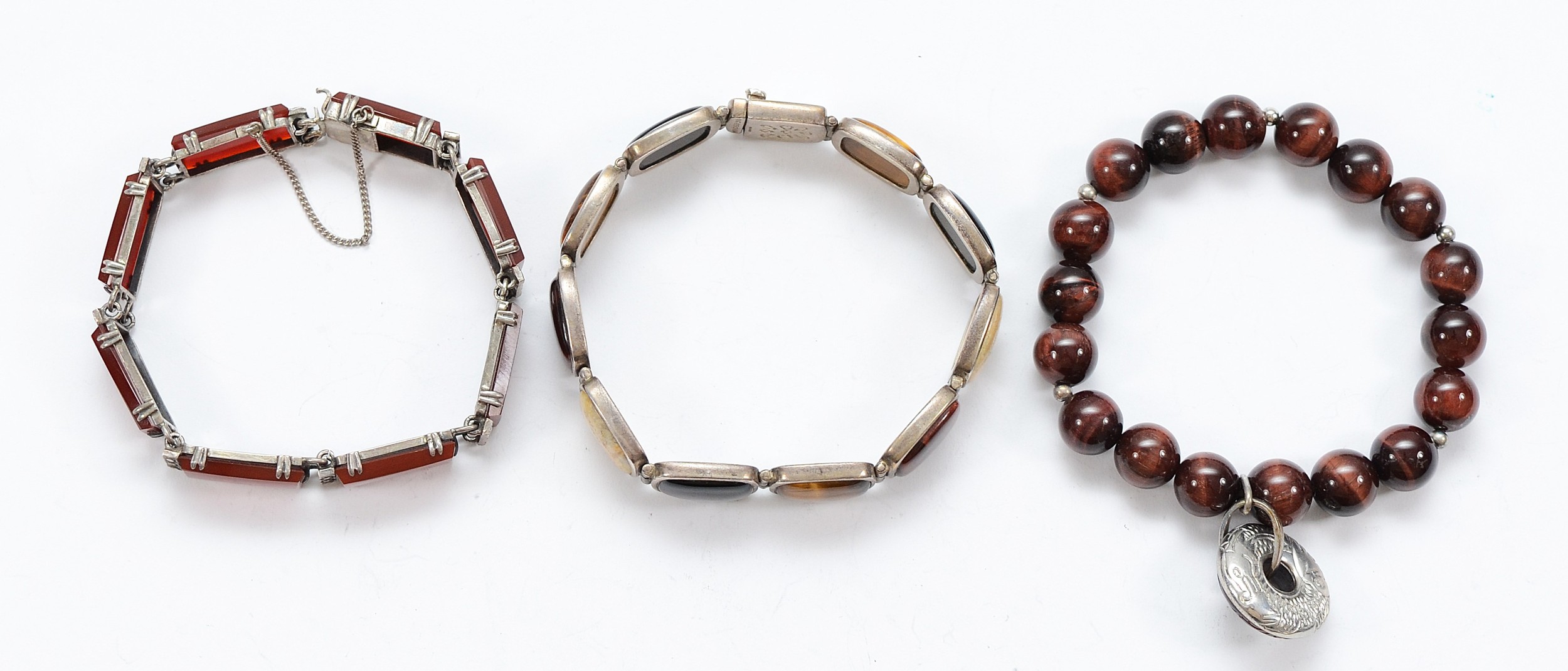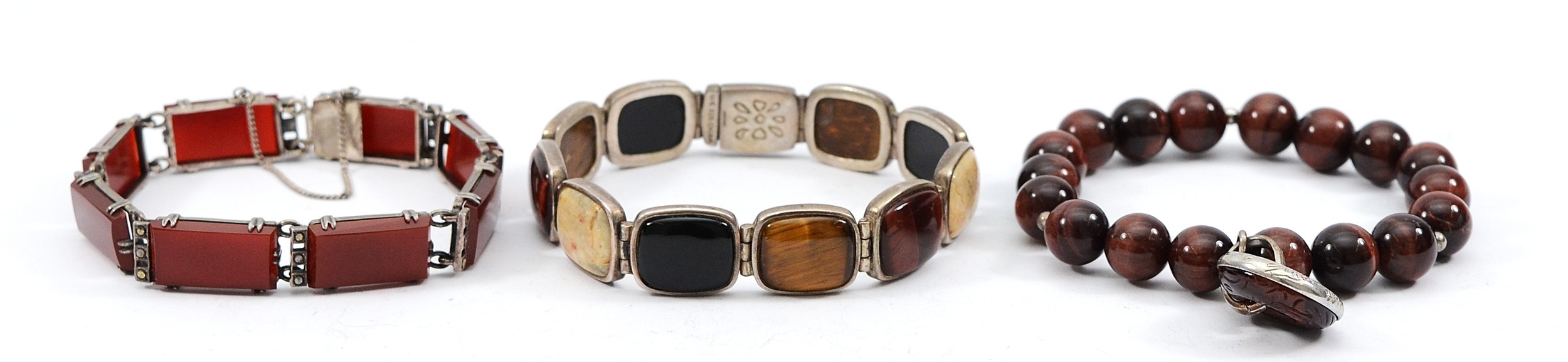 Whitney Kelly, a 925 silver gemset bracelet, a 925 silver tigers eye beaded bracelet, and a 935 silver carnelian and marcasite bracelet, 81g
