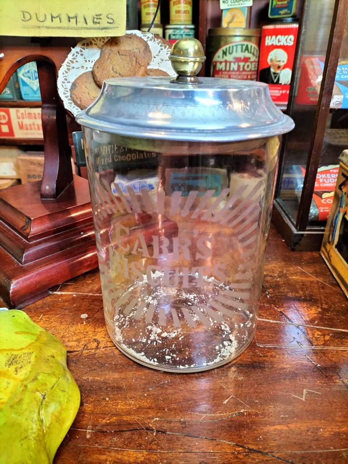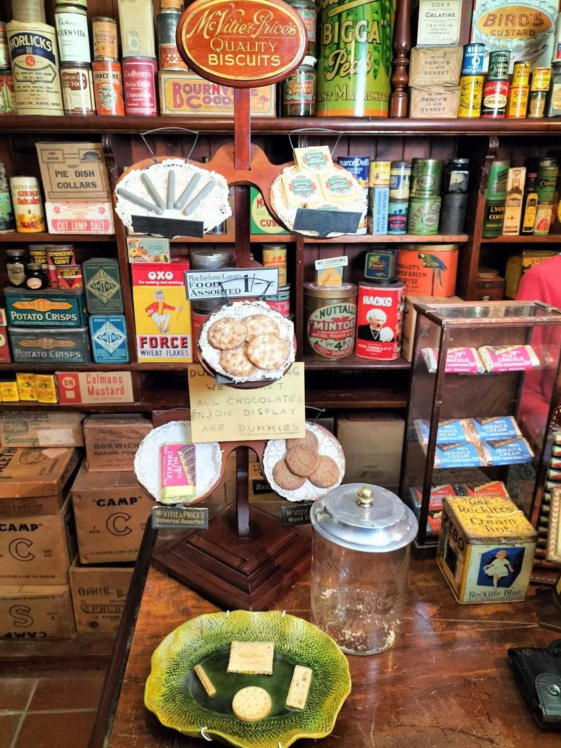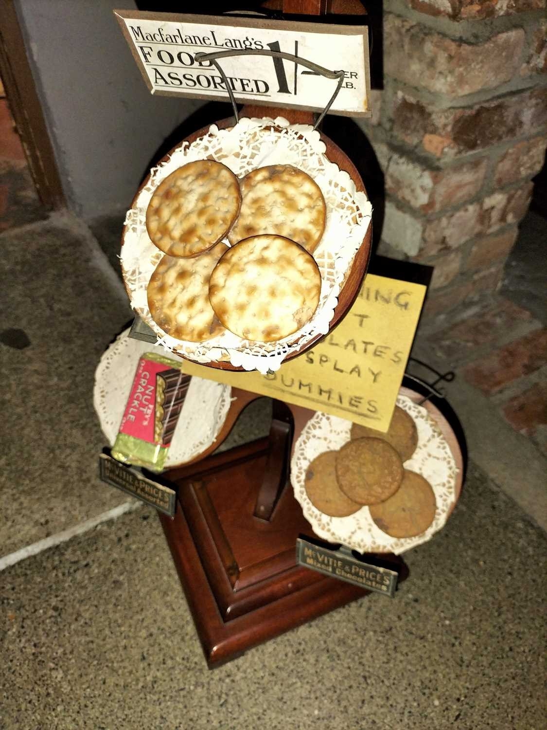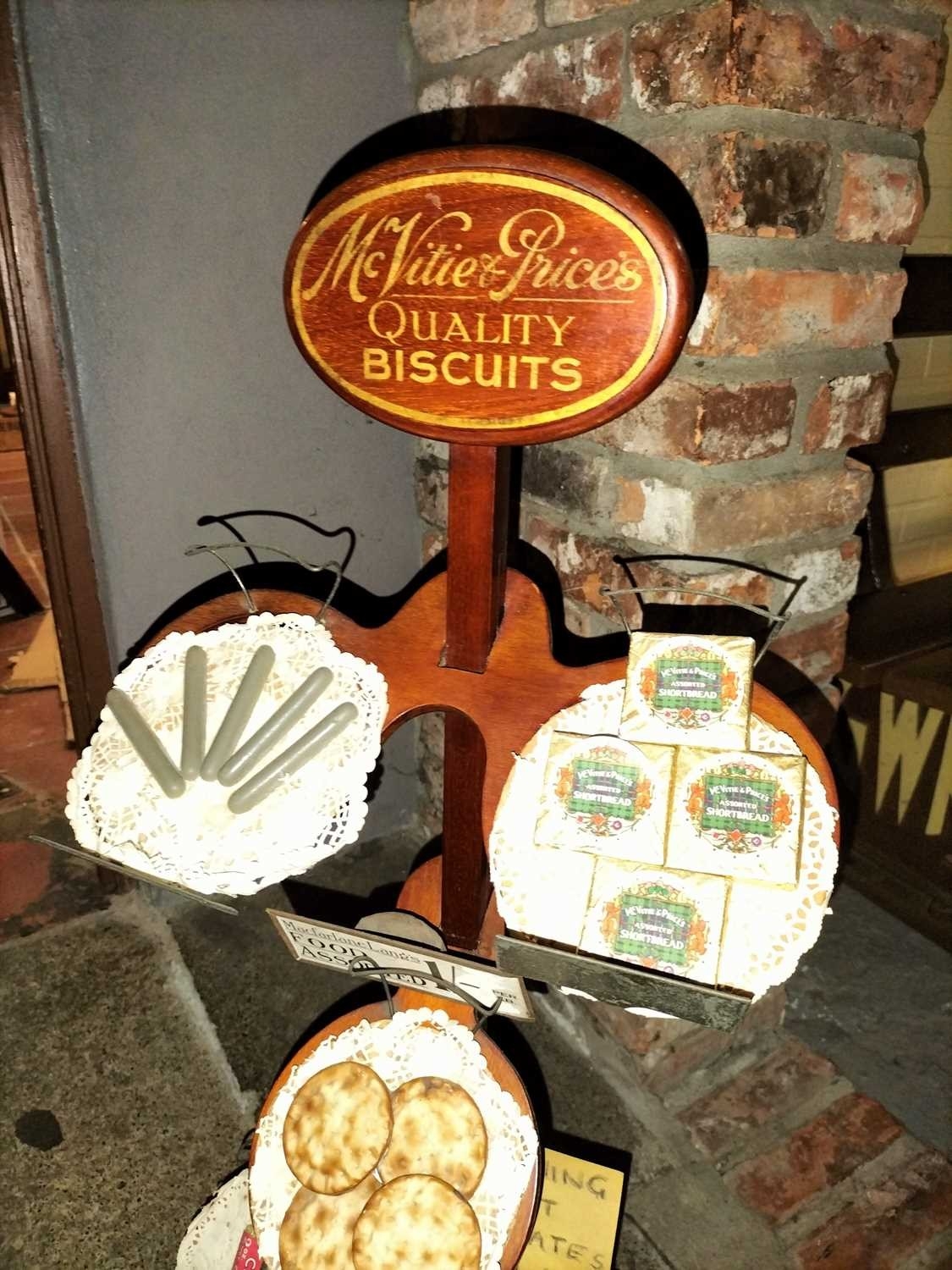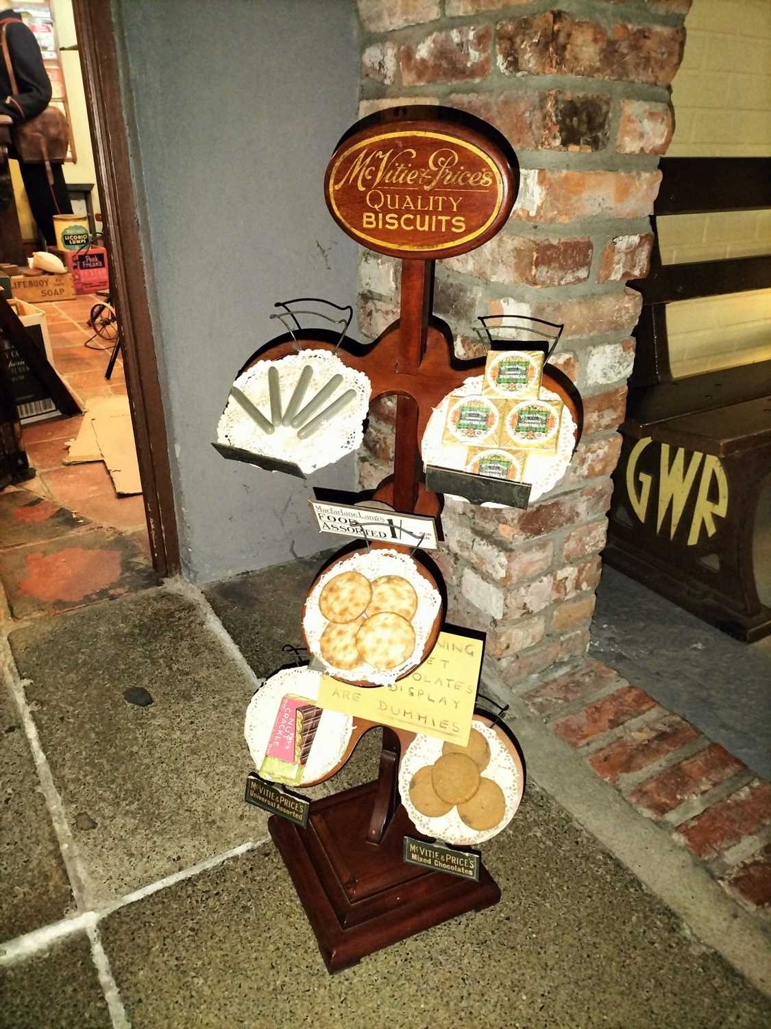 ± Britain in the Blitz Biscuit Display stand "Mc Vitie and Prices Quality Biscuits" a good quality mahogany tiered display stand and imitation produce display complete with tin price display holders [one detatched]. together with a Bretby Art Pottery Trompe L'oeil biscuit plate "petit beurre".27W cm and a Carr's Biscuits display jar 23H cm 87H cm - This lot will be subject to an additional VAT charge of 20% on the hammer price
