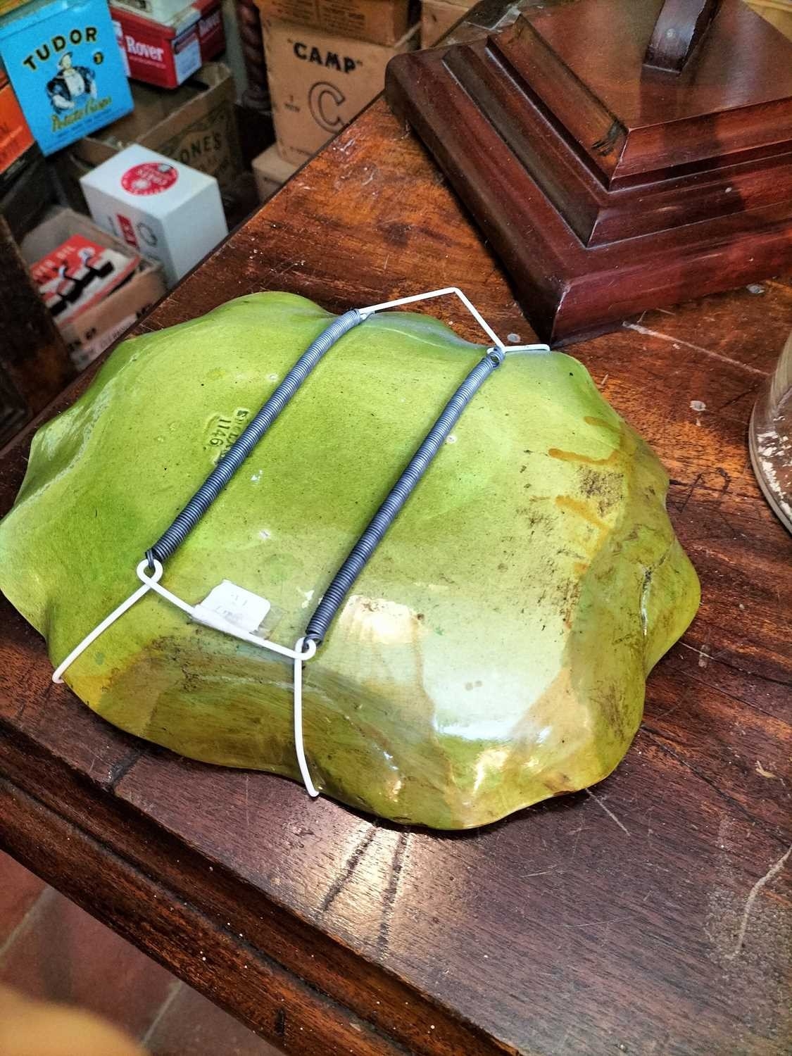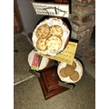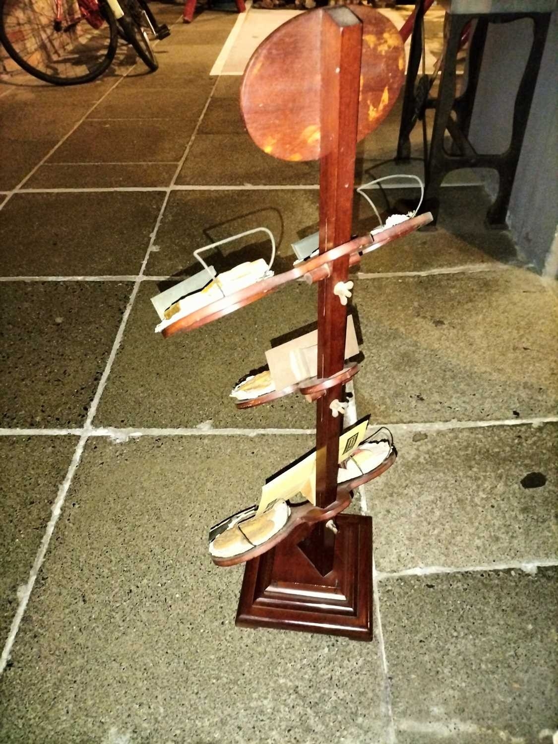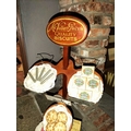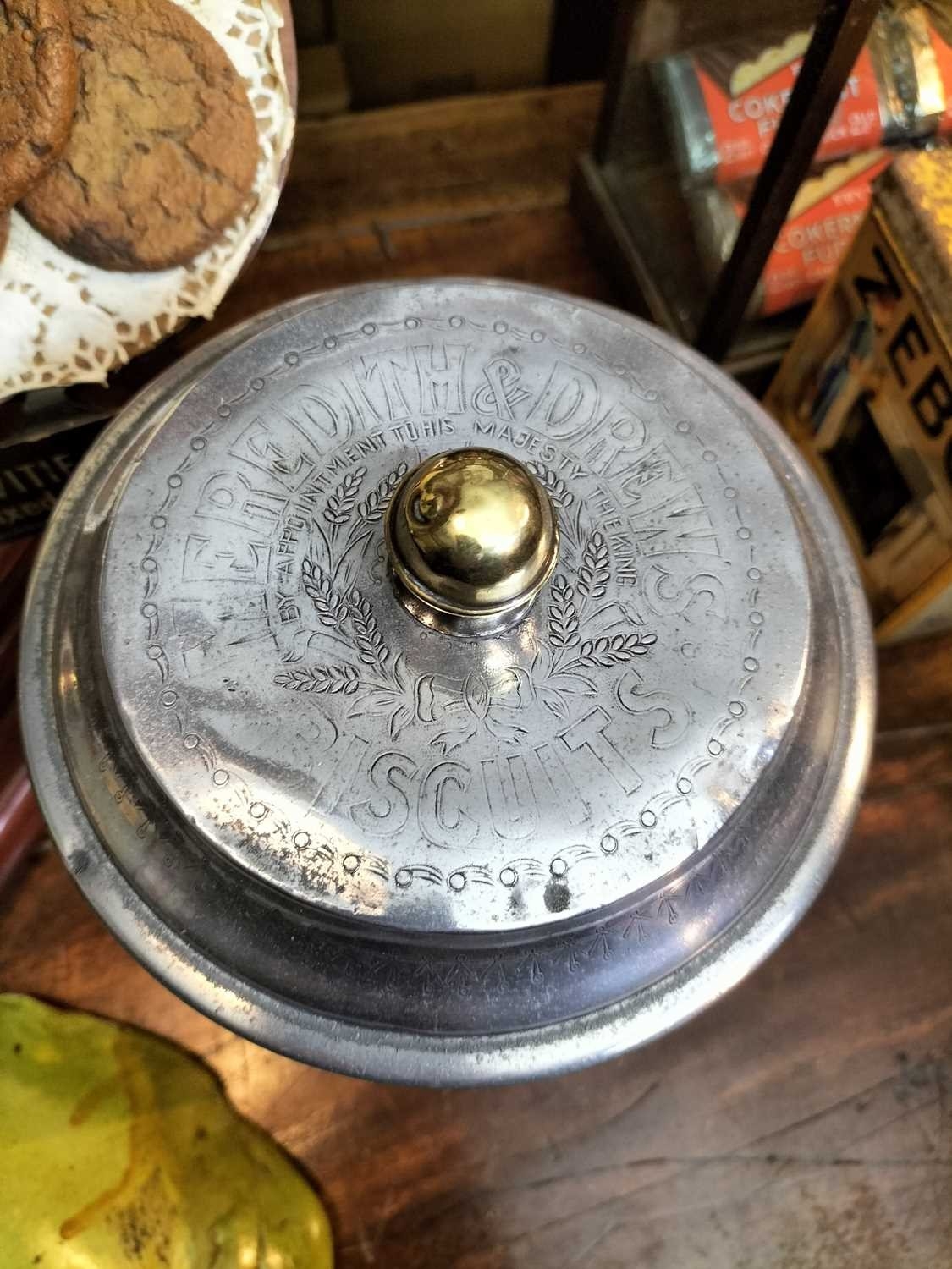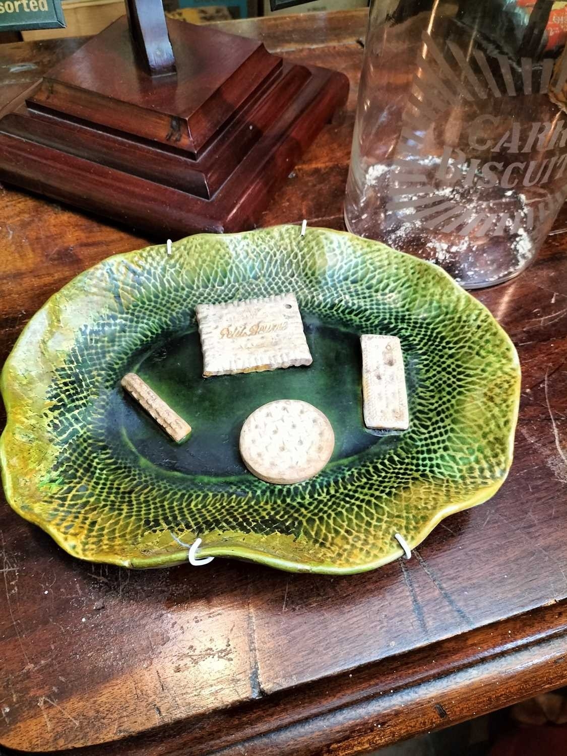 ± Britain in the Blitz Biscuit Display stand "Mc Vitie and Prices Quality Biscuits" a good quality mahogany tiered display stand and imitation produce display complete with tin price display holders [one detatched]. together with a Bretby Art Pottery Trompe L'oeil biscuit plate "petit beurre".27W cm and a Carr's Biscuits display jar 23H cm 87H cm - This lot will be subject to an additional VAT charge of 20% on the hammer price