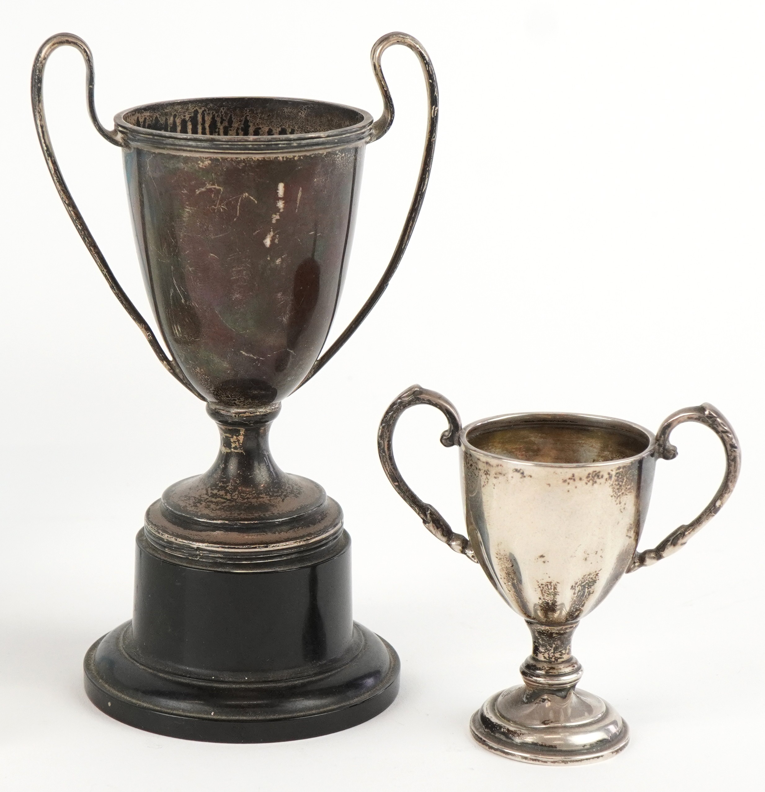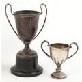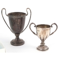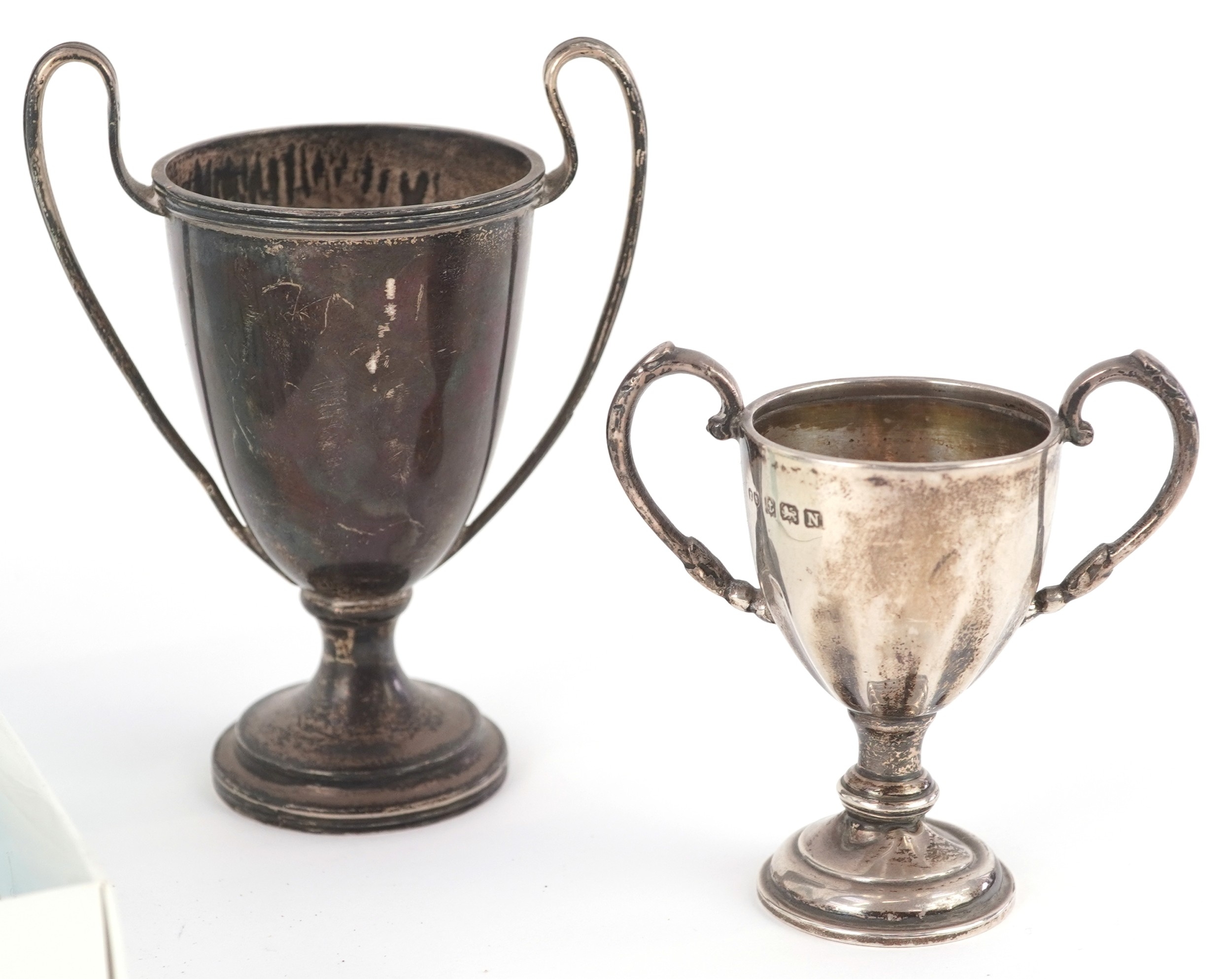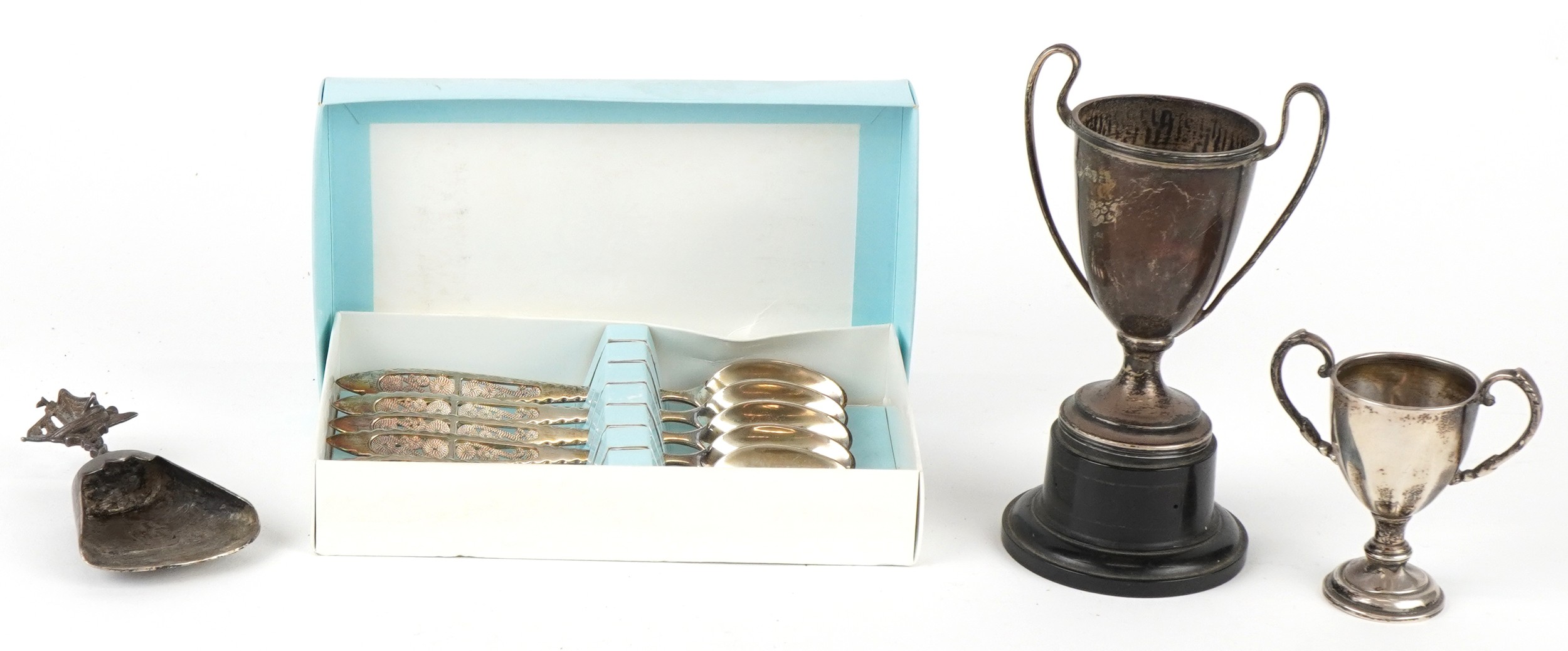 Antique and later silver comprising two twin handled trophies, a Dutch caddy spoon and set of 830 grade silver teaspoons, the largest 14cm in length, weighable silver 196.5g