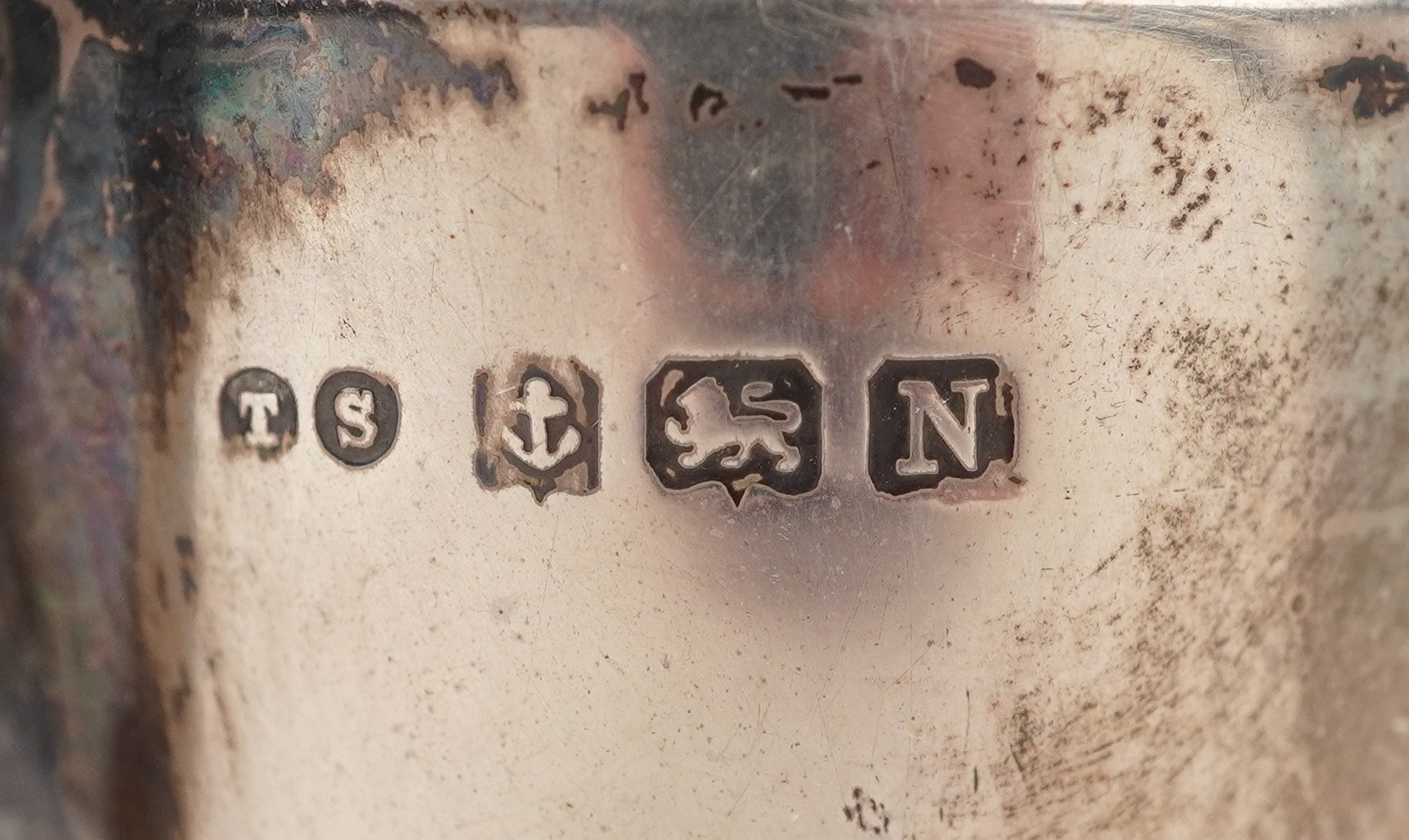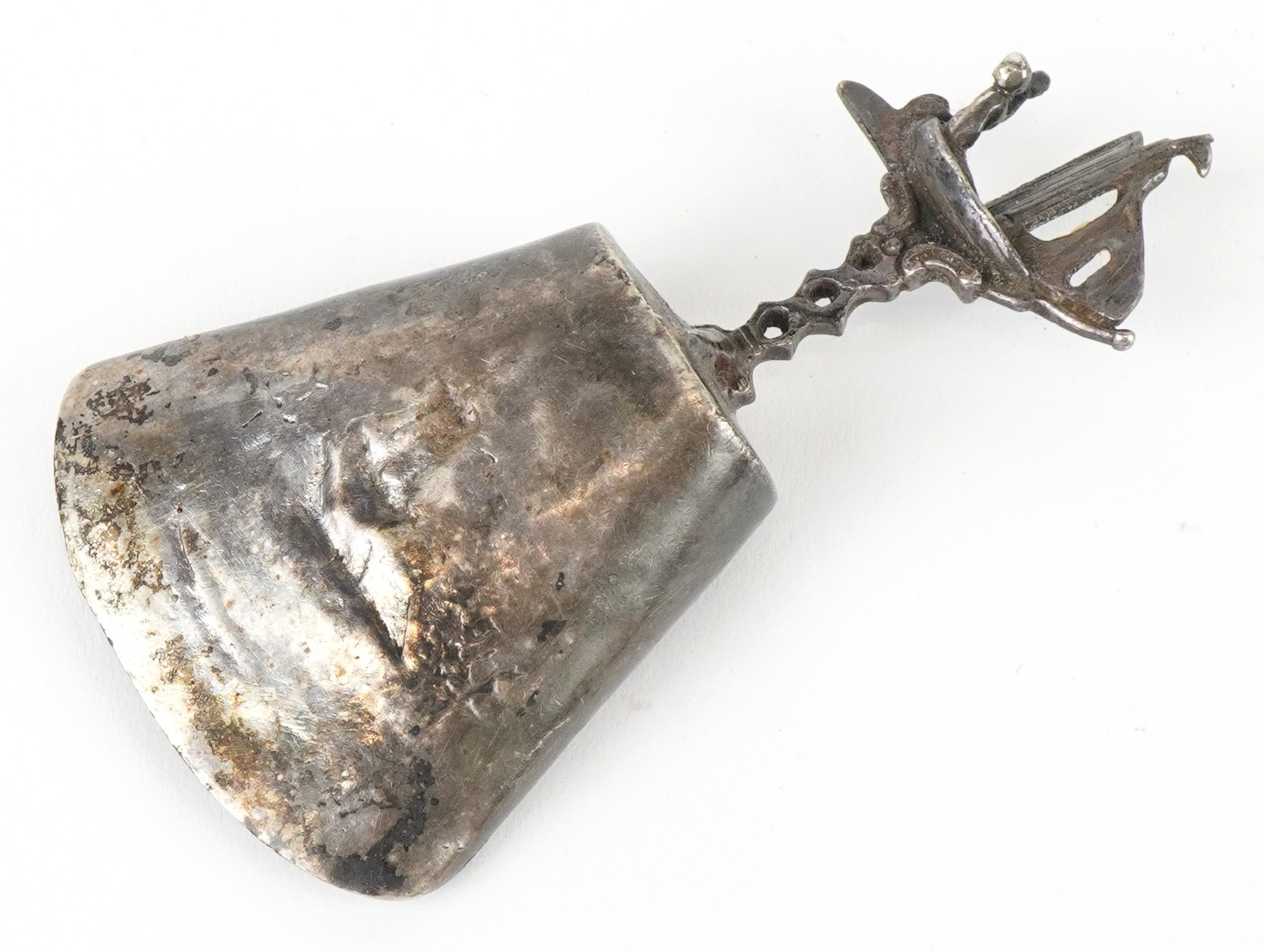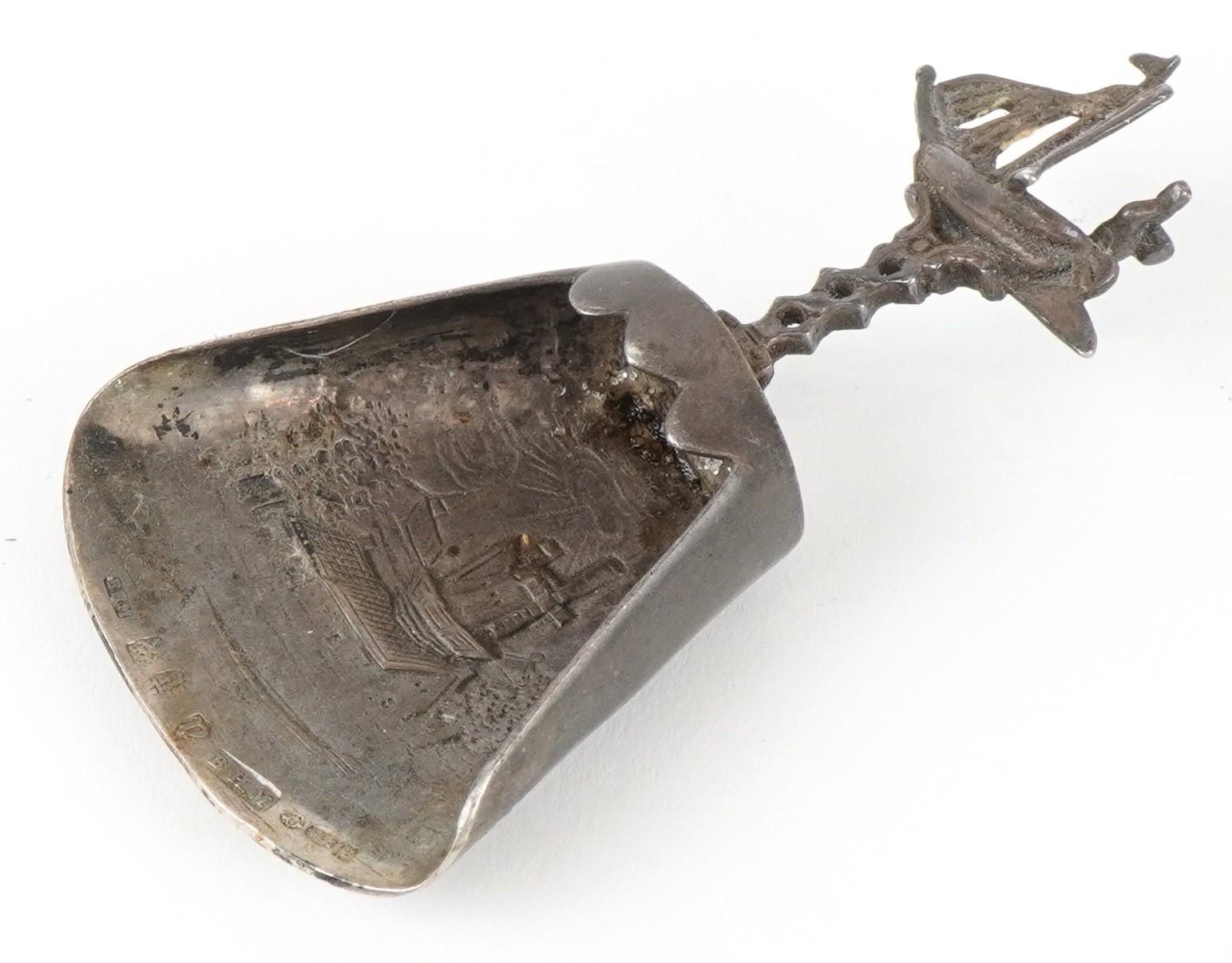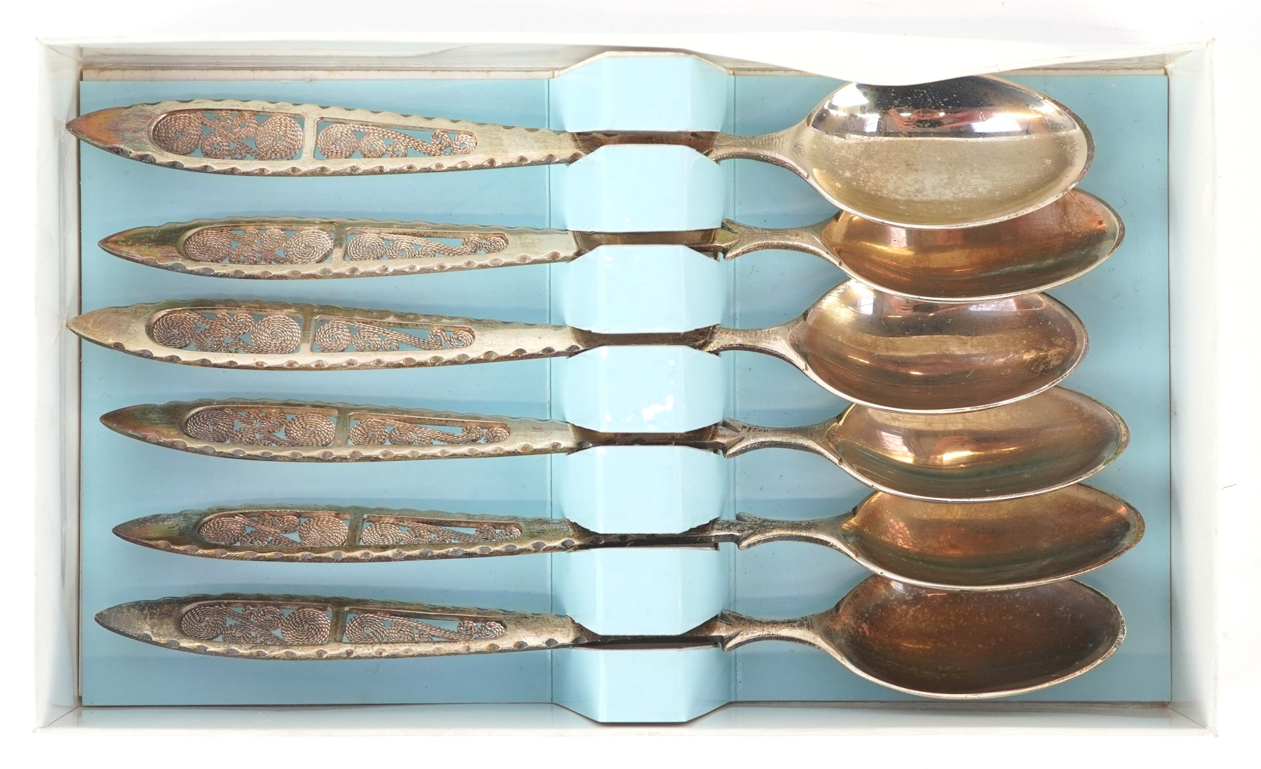 Antique and later silver comprising two twin handled trophies, a Dutch caddy spoon and set of 830 grade silver teaspoons, the largest 14cm in length, weighable silver 196.5g