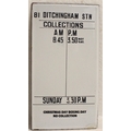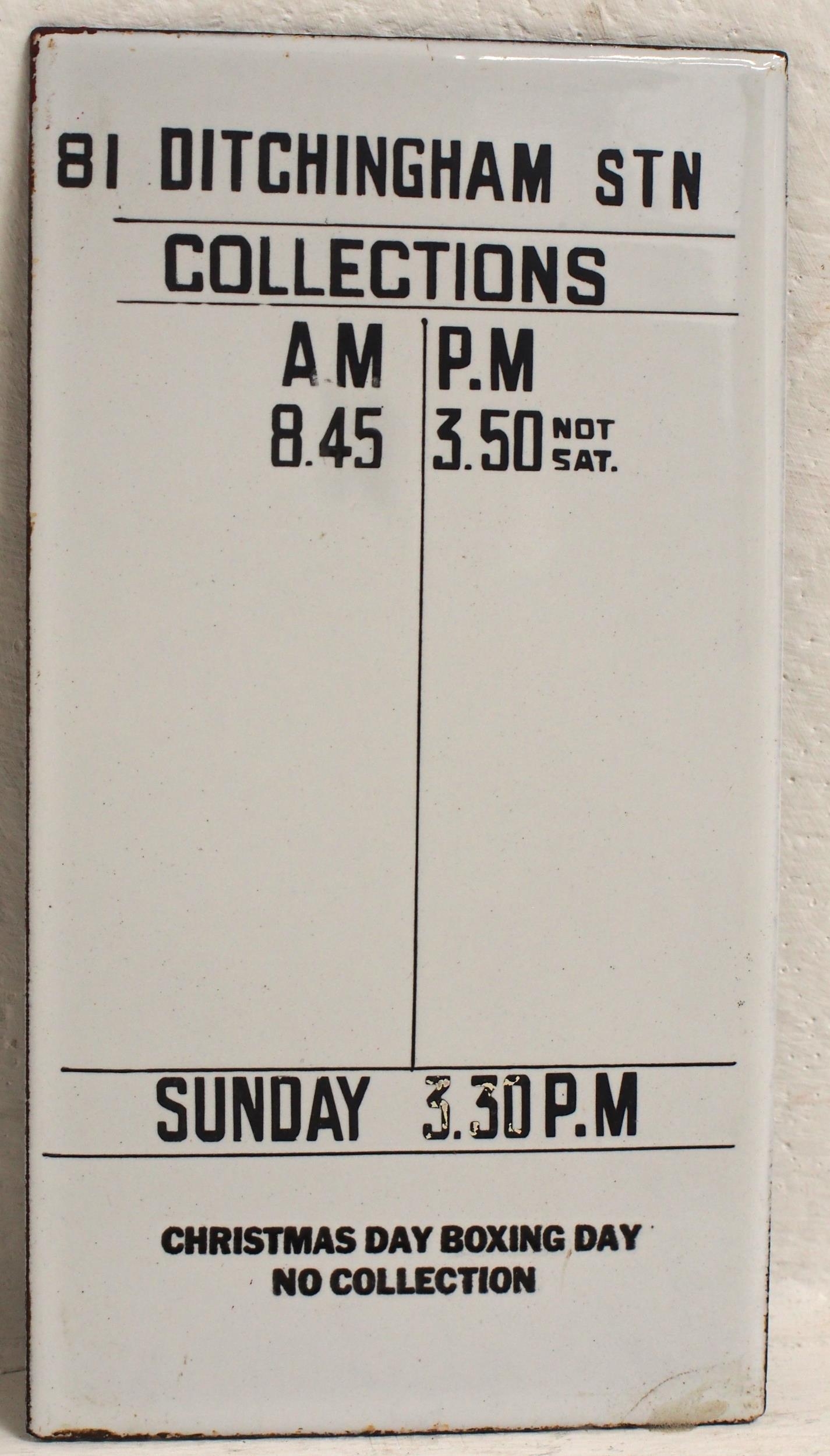 Royal Mail post box enamel description plate "81 DITCHINGHAM STN COLLECTIONS" 8"x 4¼", good condition, a railway station on the Waveney Valley line (Norfolk) closing in 1953. (C2) (Dispatch by Mailboxes/Collect from Banbury Depot)