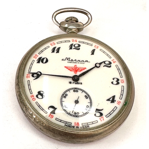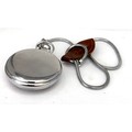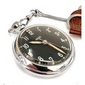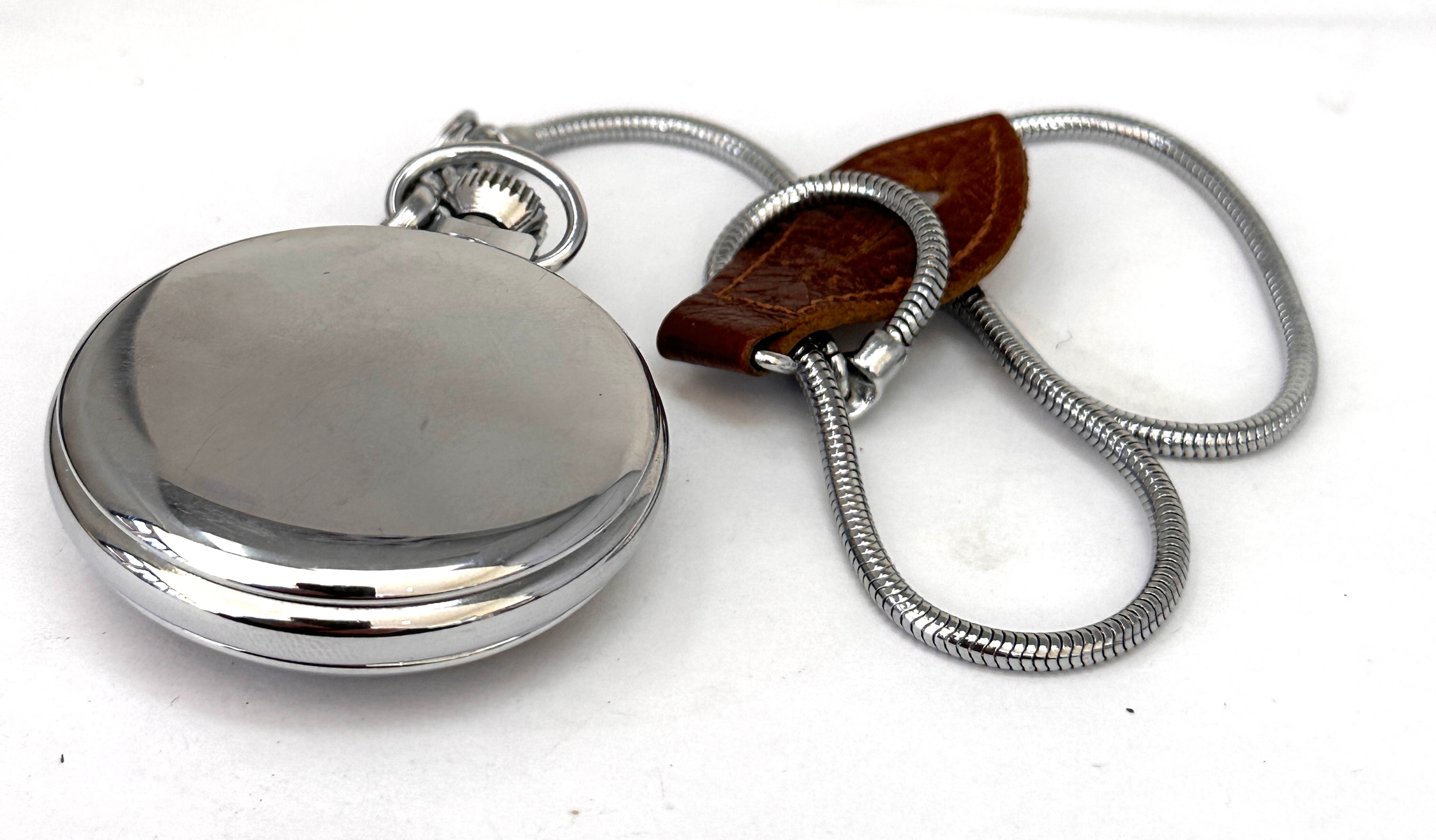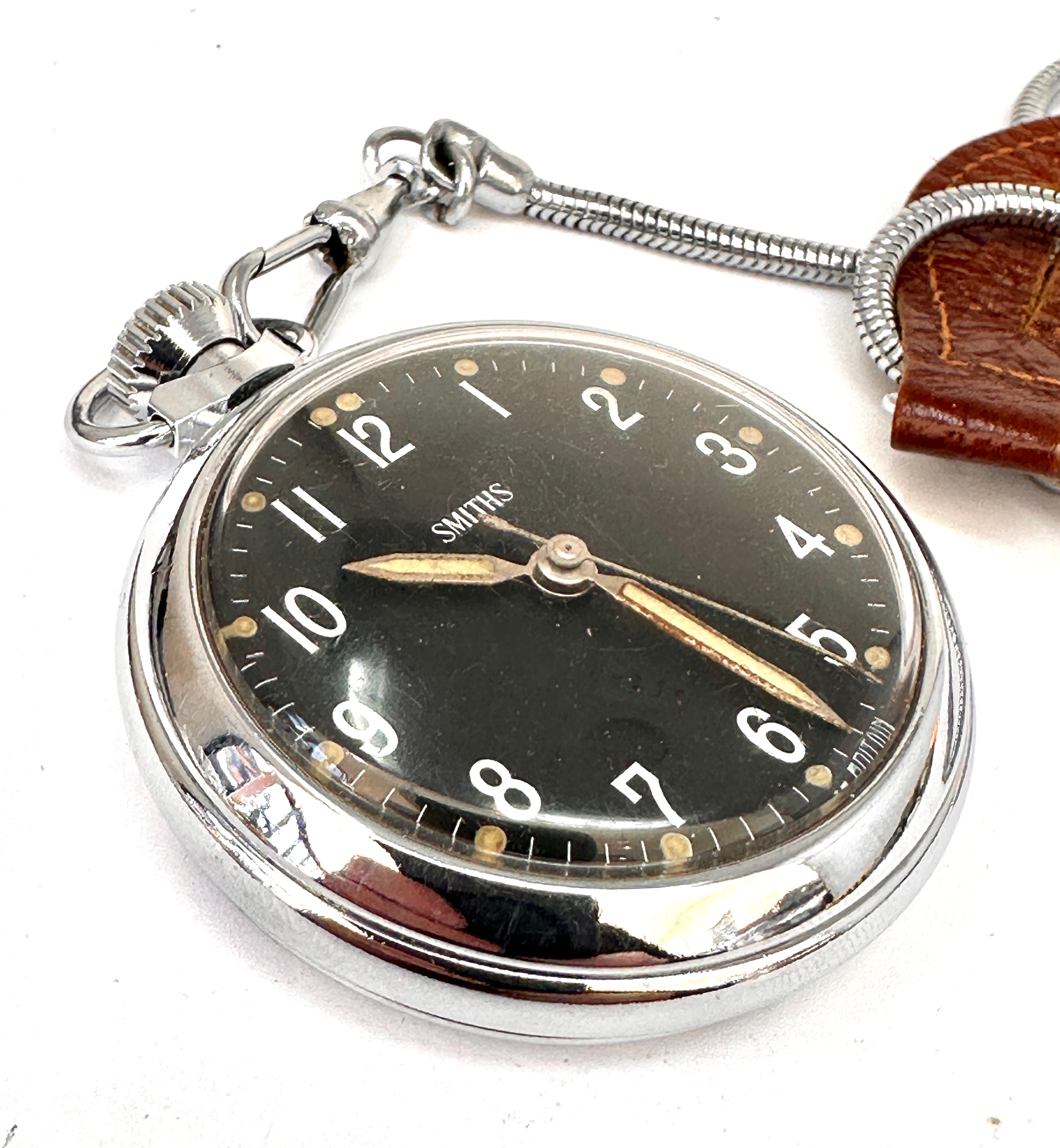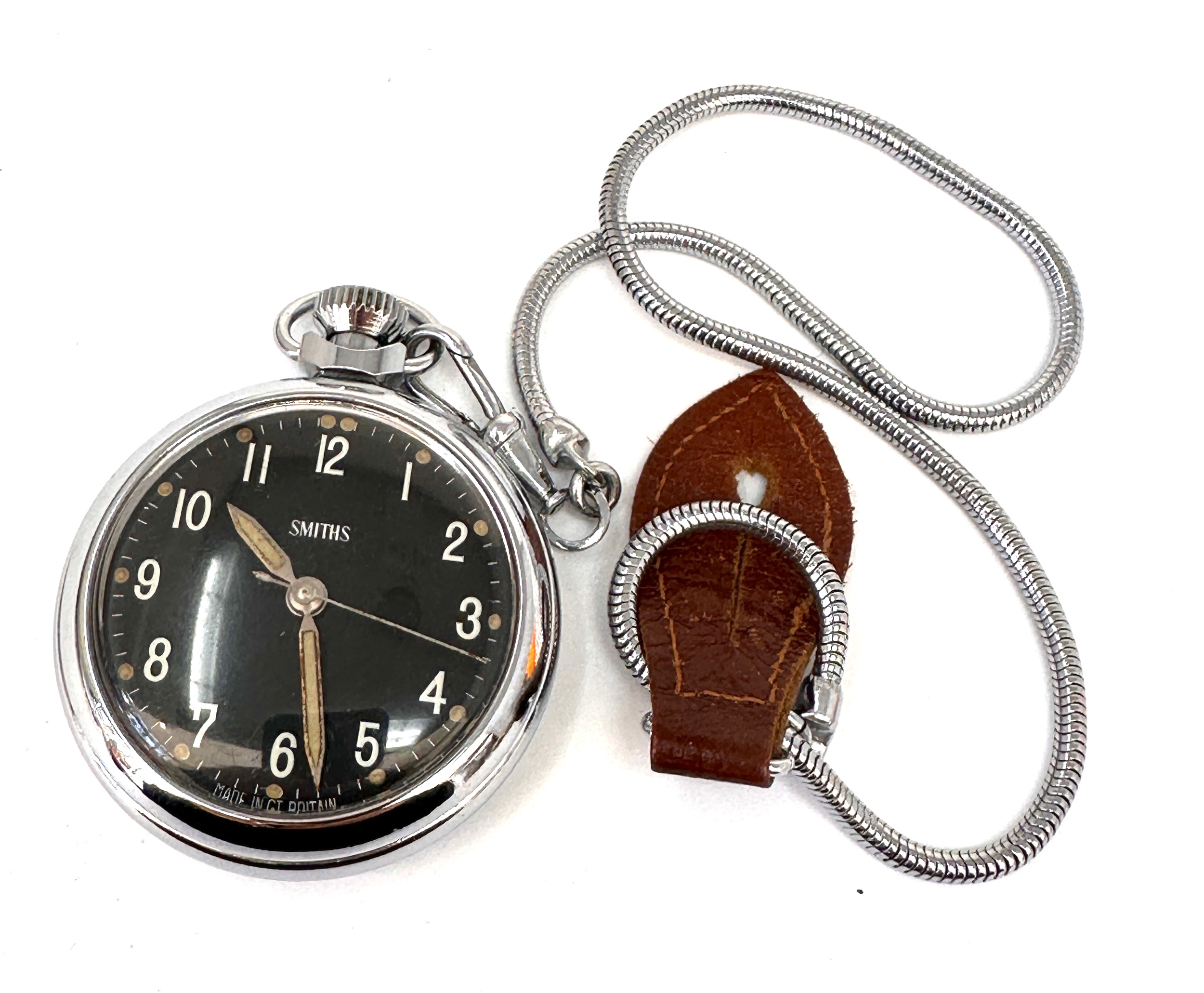 vintage Smiths pocket watch featuring a black dial with white Arabic numerals and a silver-toned metal case with a snake-style chain and brown leather fob very good condition winds and ticks