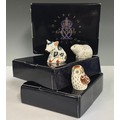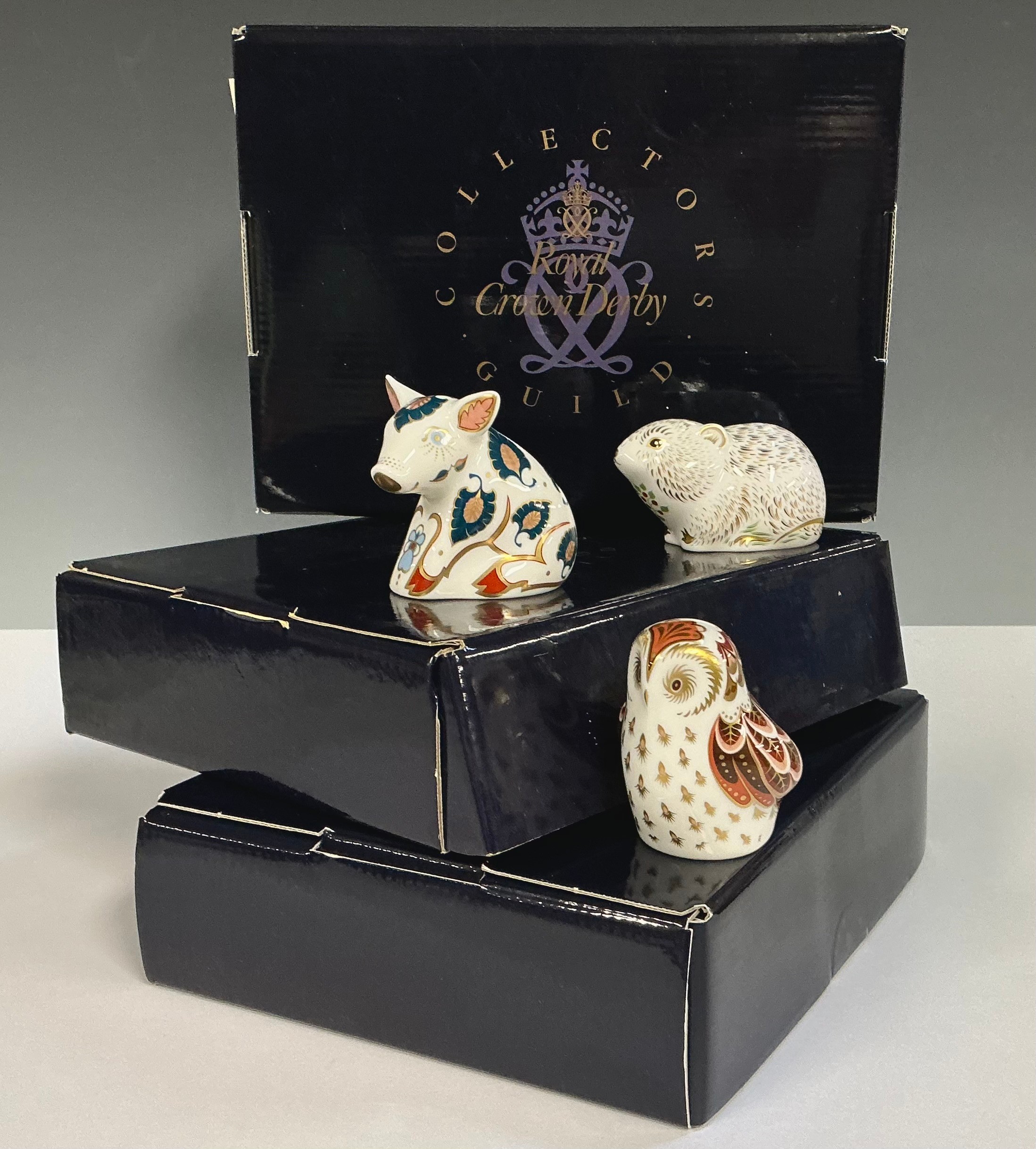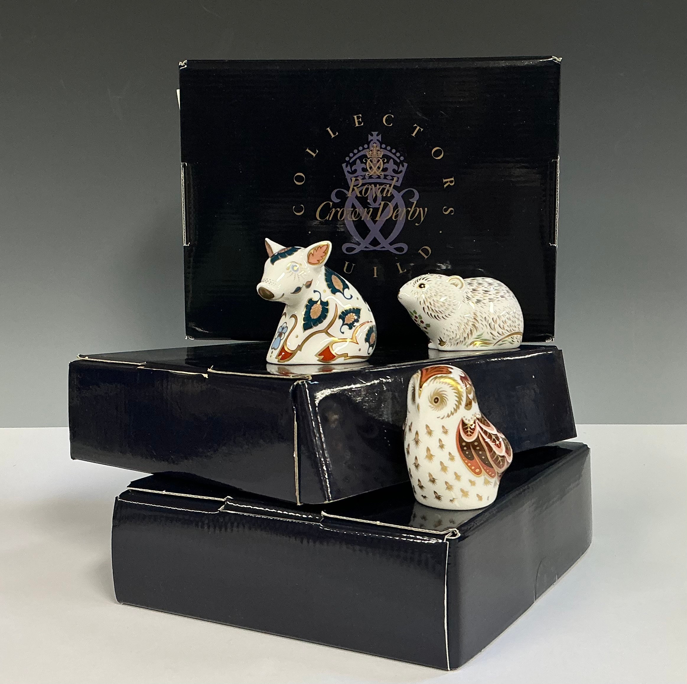 A Royal Crown Derby paperweight, River Bank Vole, Collector's Guild Member's Pack exclusive, gold stopper, 7cm long, printed mark, presentation box; others similar, Snuffle Piglet, gold stopper, printed mark, boxed; Owlet, gold stopper, printed mark, boxed (3)