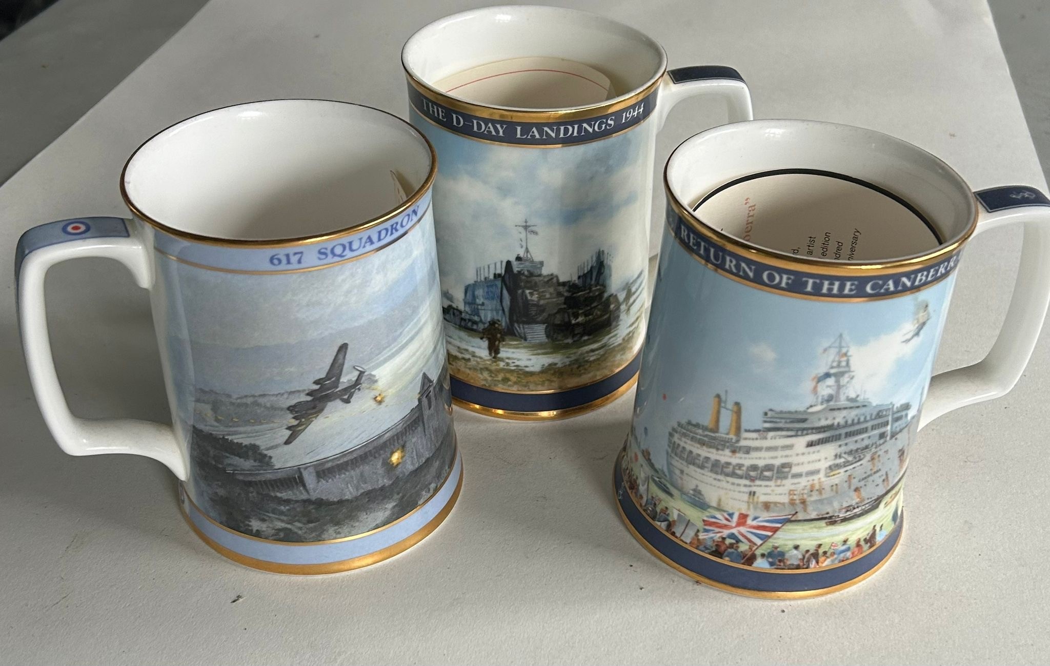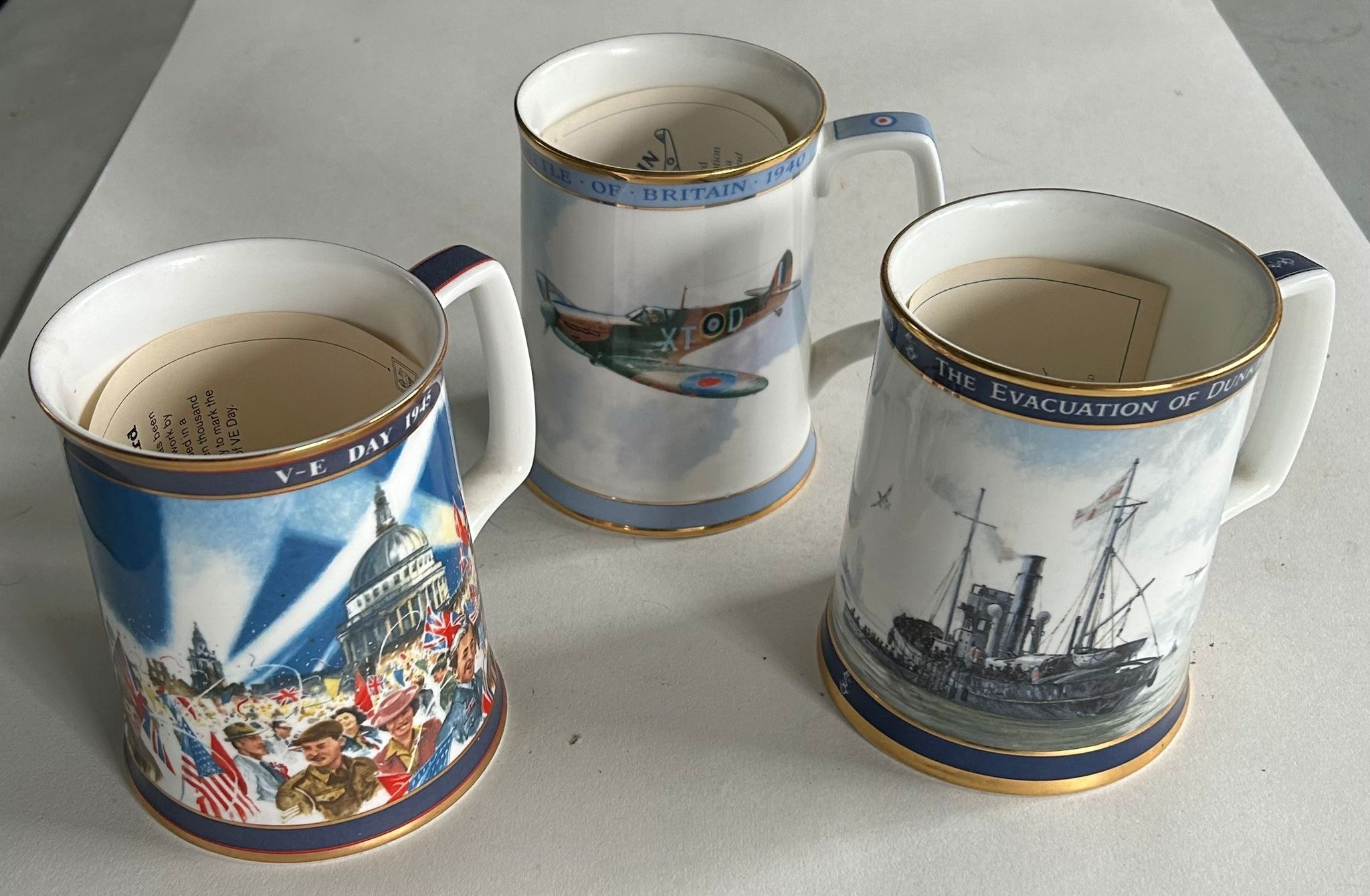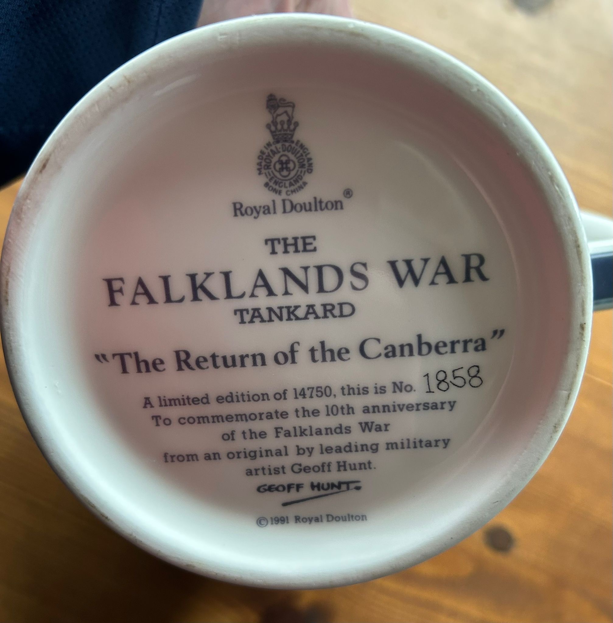 6 Royal Doulton tankards by Geoff Hunt inc; "Falklands war", "D-Day", "Dunkirk", "Dambusters", "V-E Day" and "Battle of Britain" all with certificates. GC
