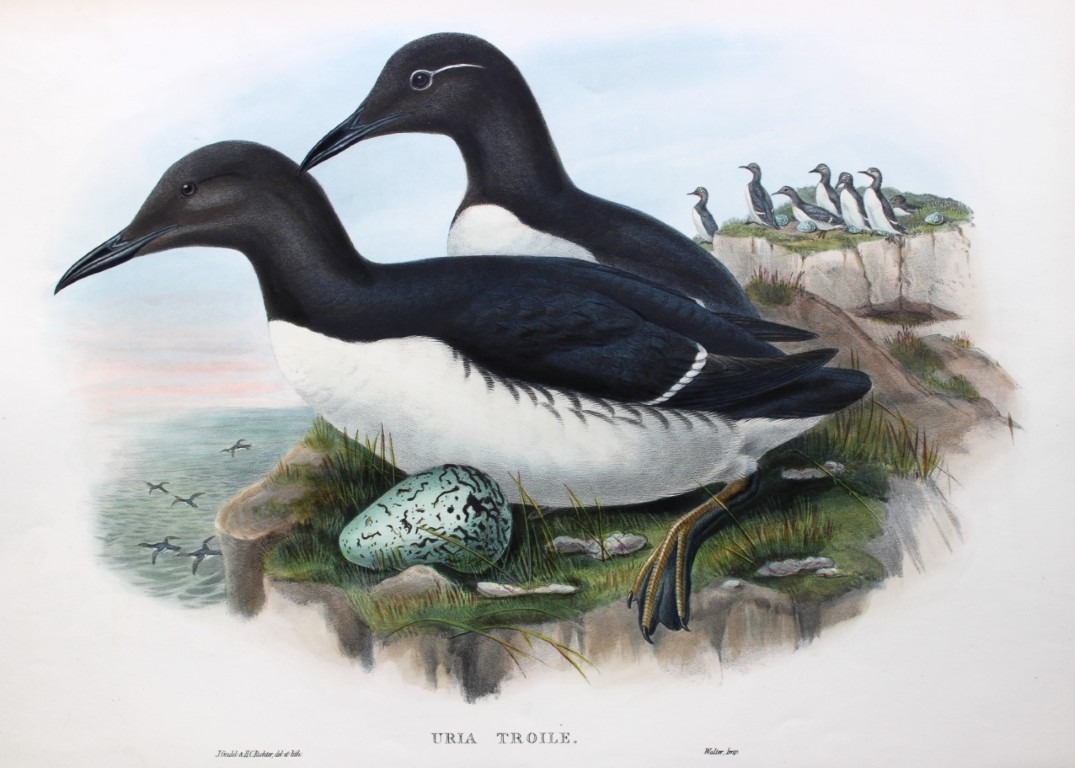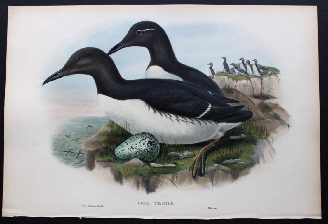 John Gould - Original lithograph of the Common Guillemot 1862-73. This original lithograph of the Common Guillemot (Uria troille) is from John Gould's Birds of Great Britain, issued in 25 parts between 1862 and 1873. This plate is number 48 from volume 5 of this work and was drawn and lithographed by John Gould & HC Richter.