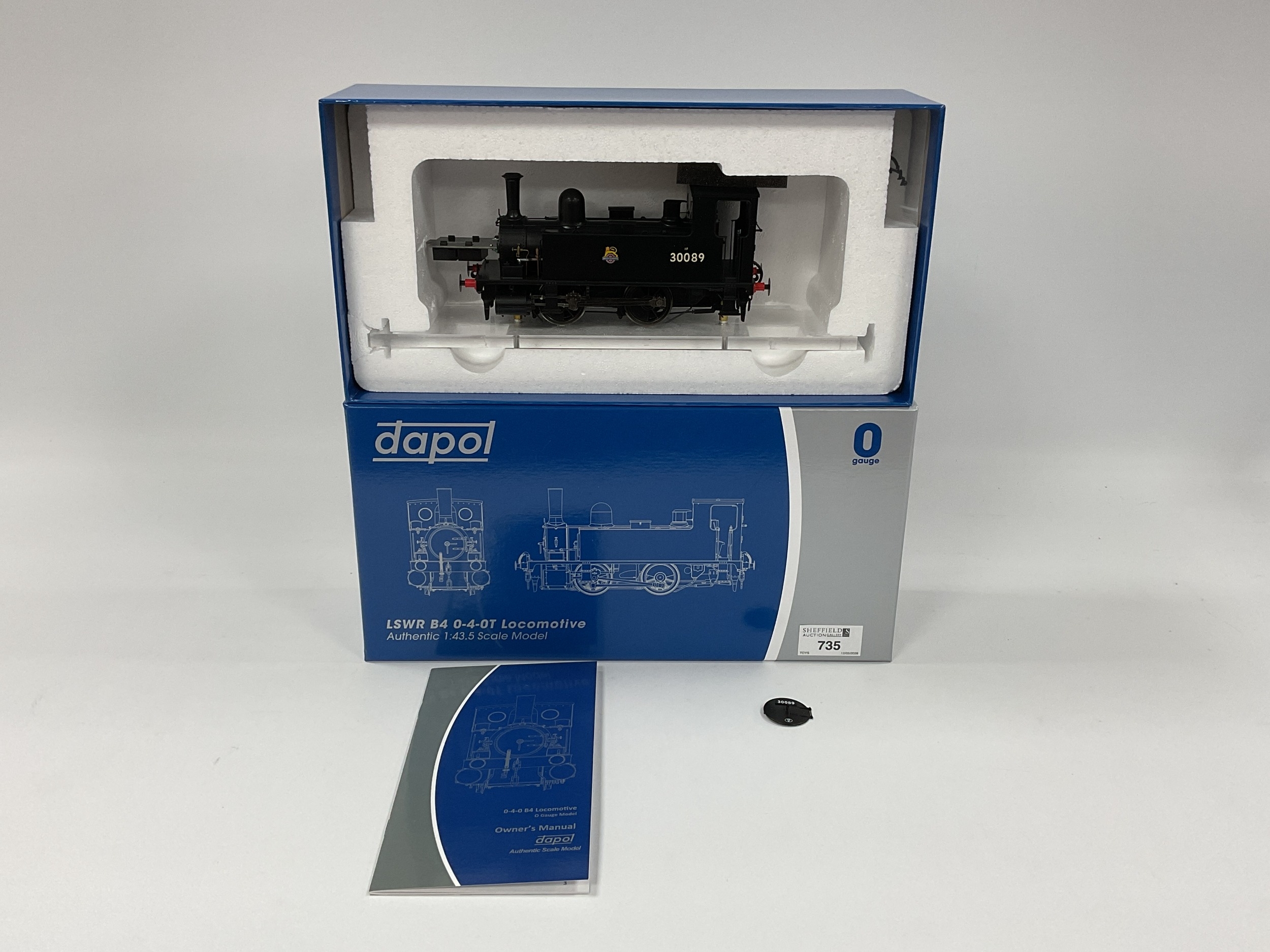 A Boxed Dapol '0' Gauge B4 0-4-0 Tank Engine in BR black (ref 7S-018-004), untested, with decoder tray protruding from smoke box and smoke box cover loose in box, otherwise apparent good condition.