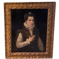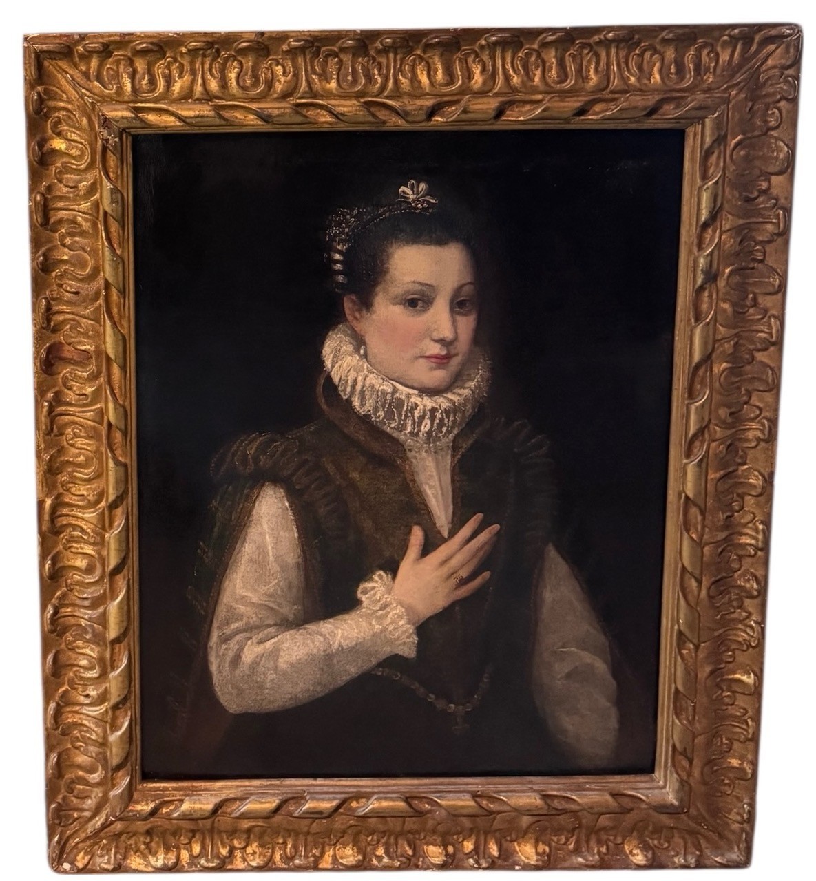 Portrait of a Venetian lady Caterina Vannini, 1571 - 1644, Italian musician and Dominican nun wearing fur coat with white ruff collar with a jewelled headdress, held in original carved giltwood frame, re-lined.