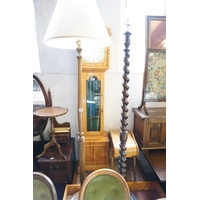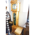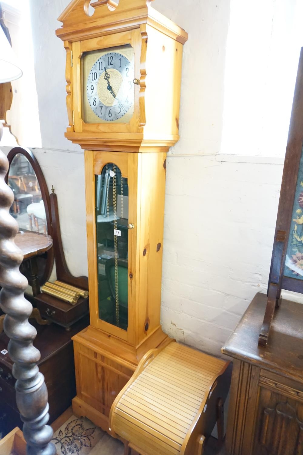 A pine grandmother clock, sewing box, tiled topped coffee table and a trunk