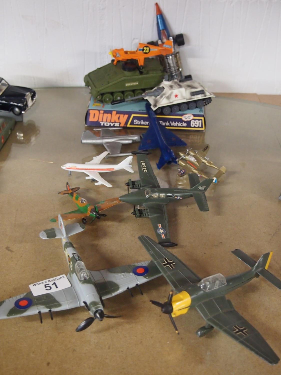 Dinky Toys Striker Anti-Tank military vehicle model.691 together with a collection of Dinky Toy model planes including Junkers, Hawker Hurricane Mk2 and a Whiz wheels silver streak Swedish jet dragster etc. total of 12 items