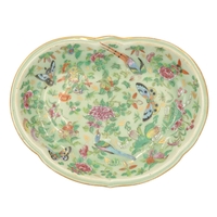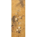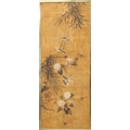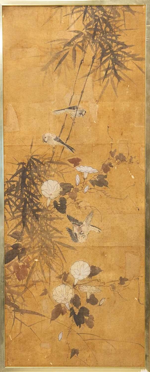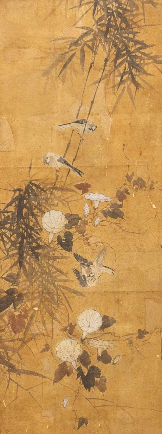 A Chinese silk painting. Circa 1900, painted with sparrows amidst bamboo and flowering convulvulus, 107 x 42cm.