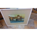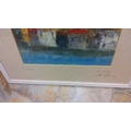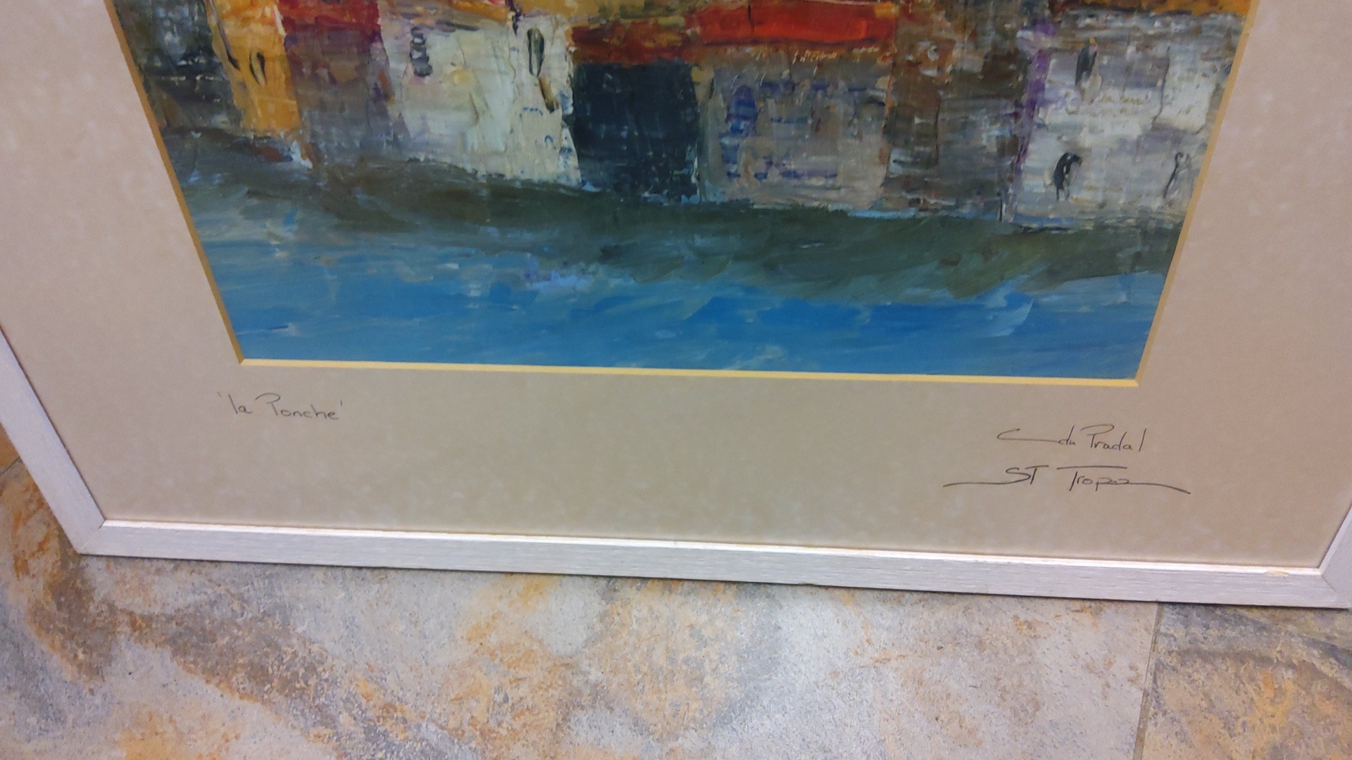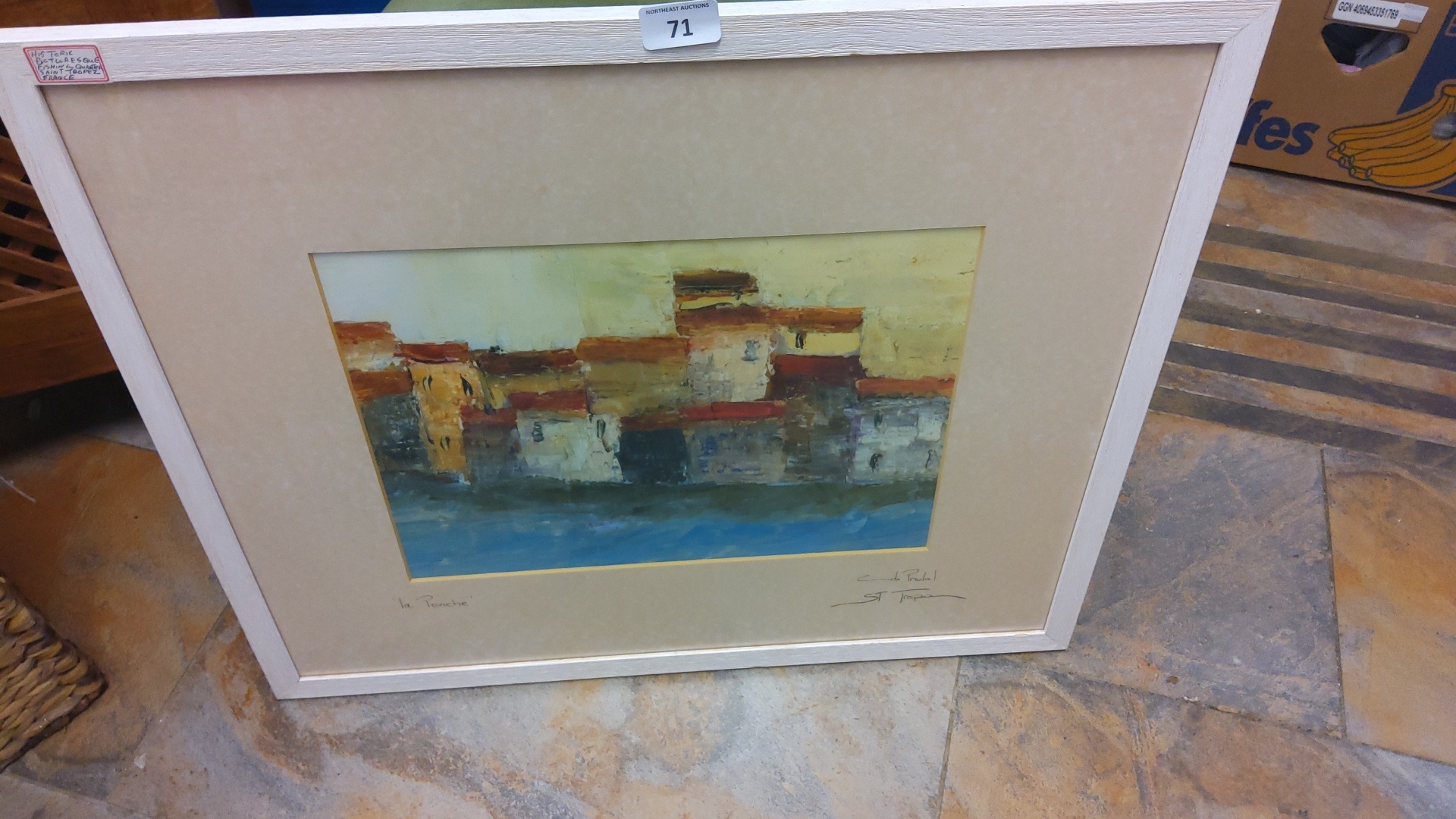 Modern School, mixed media on paper—abstracted harbourfront with ochre blocks above a blue shoreline. Inscribed with title ‘la Ponche’ and annotated ‘St Tropez’, signed lower right; presented in a glazed frame with wide mount.