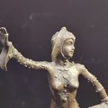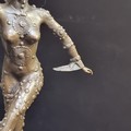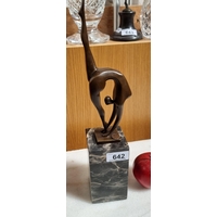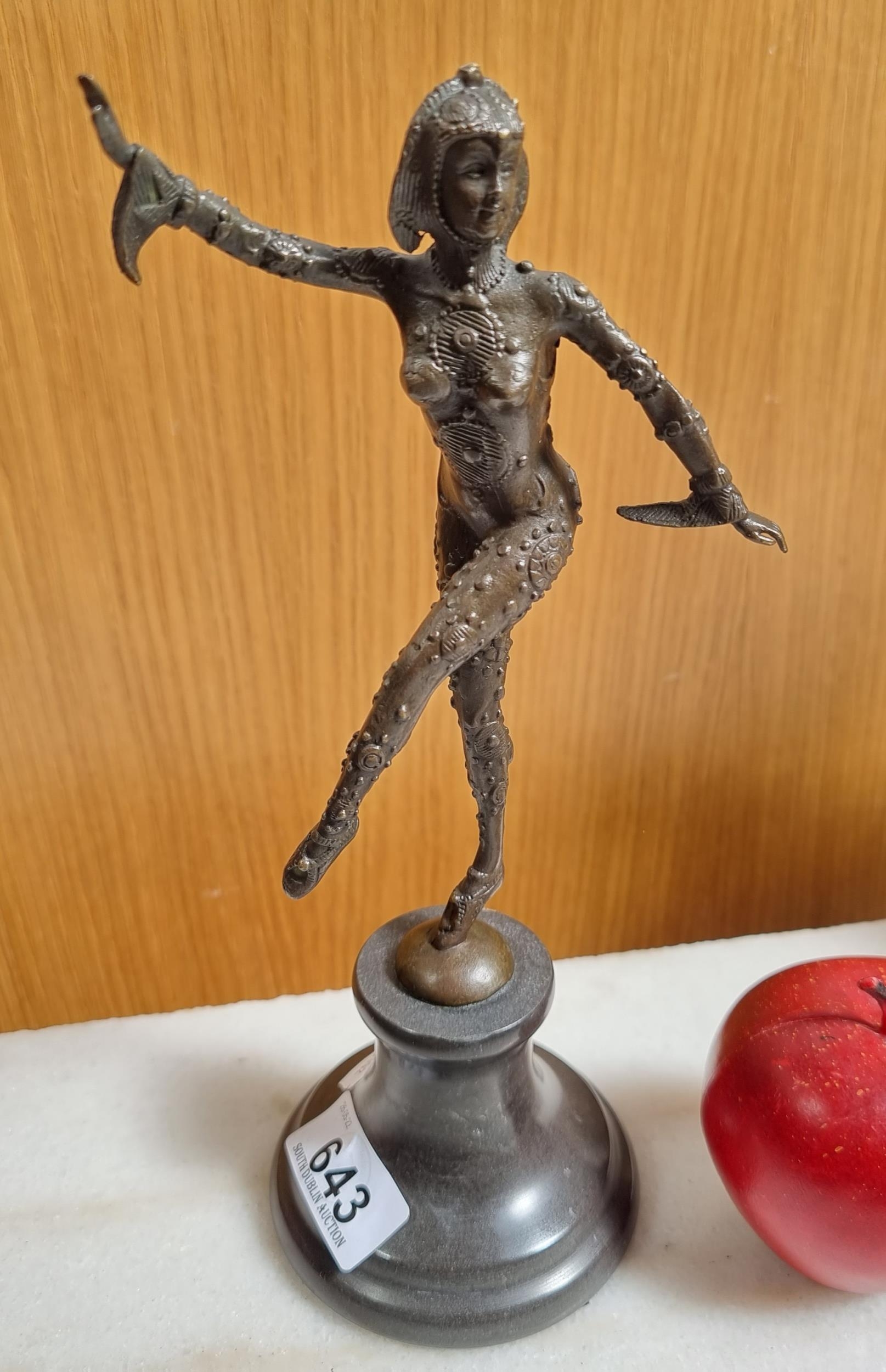 A beautiful Art Deco style bronze sculpture of a female dancer with detailed leotard and headgear. Balancing on a stone grey podium. Signed D. H Chiparus.