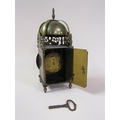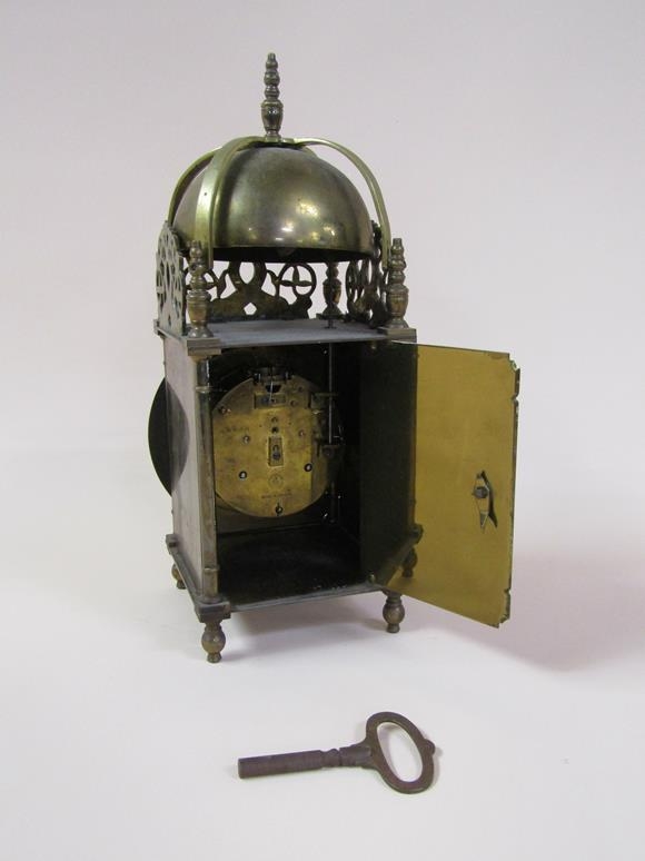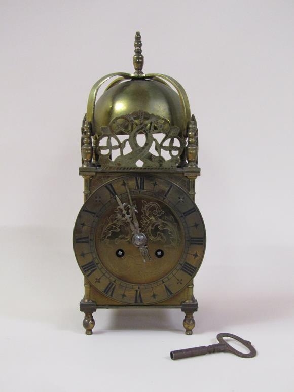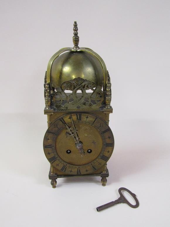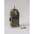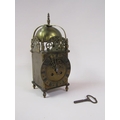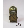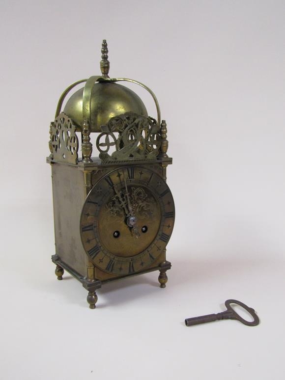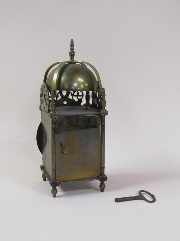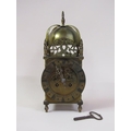 A late 19c lantern clock with French Japy Freres movement. The brass case is of traditional form with an overhead bell surrounded by dolphin frets and having a dual chapter ring overhanging the brass box case. The two handled movement strikes on the overhead bell and has a lever platform escapement, 31cm tall overall.