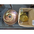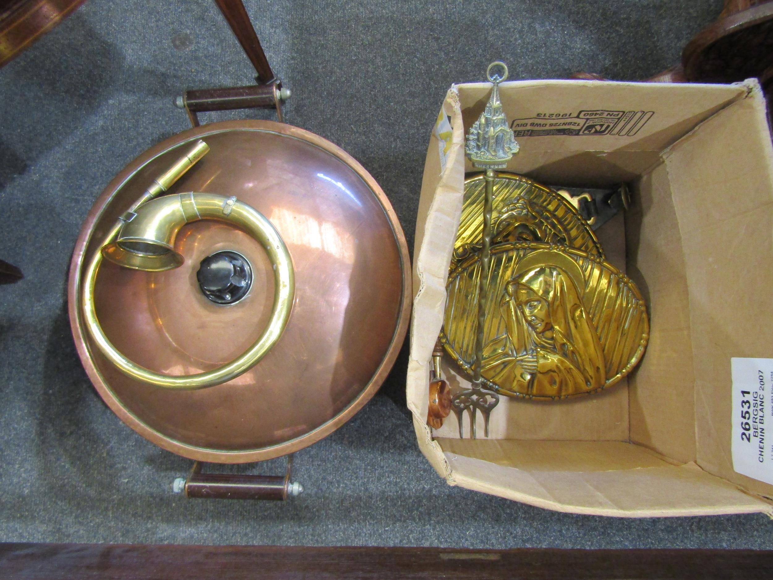A large lidded copper pan (40cm diameter) and brass wares including repousse Jesus & Mary plaques, a BCE car horn and horse brasses