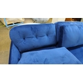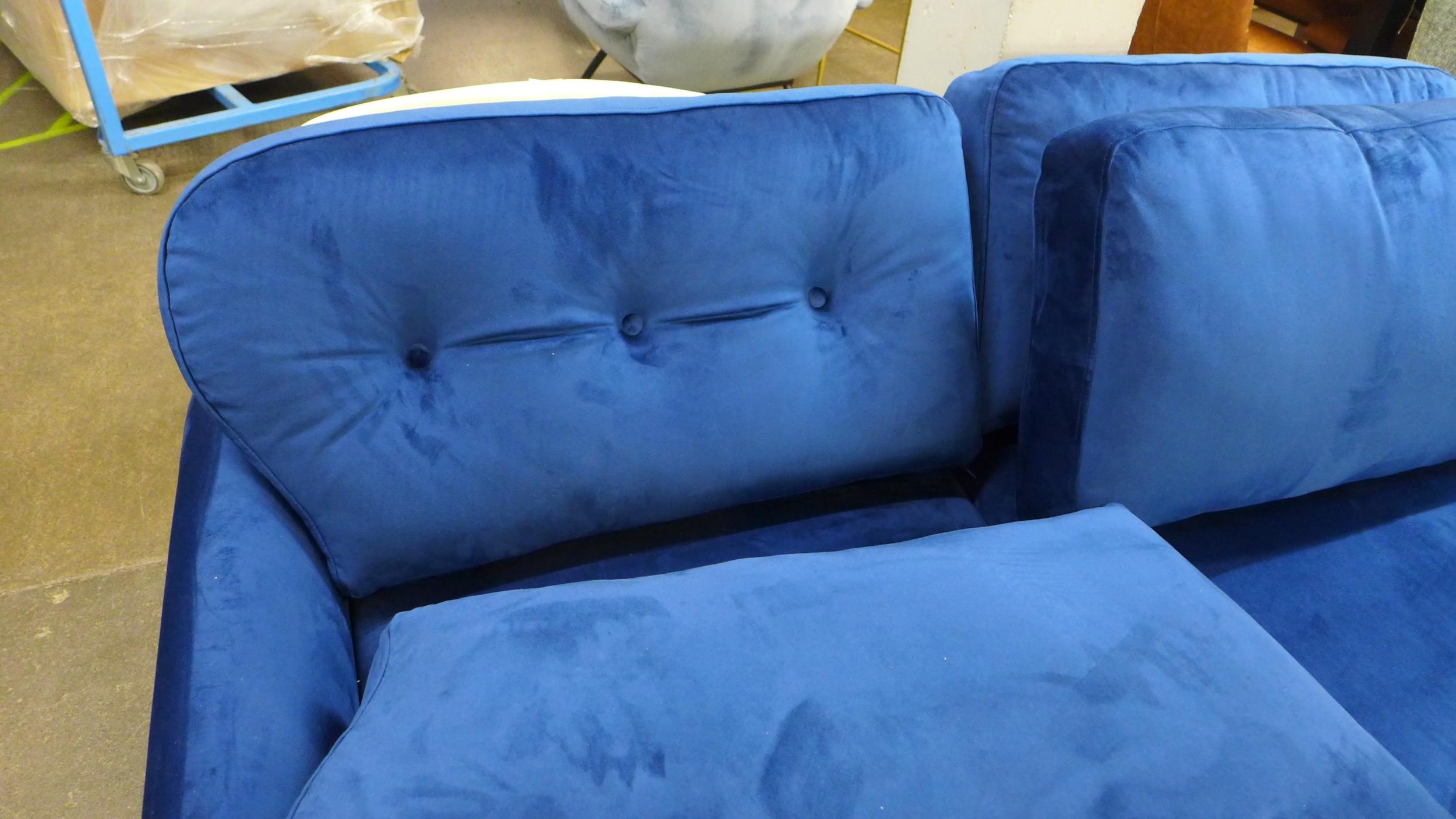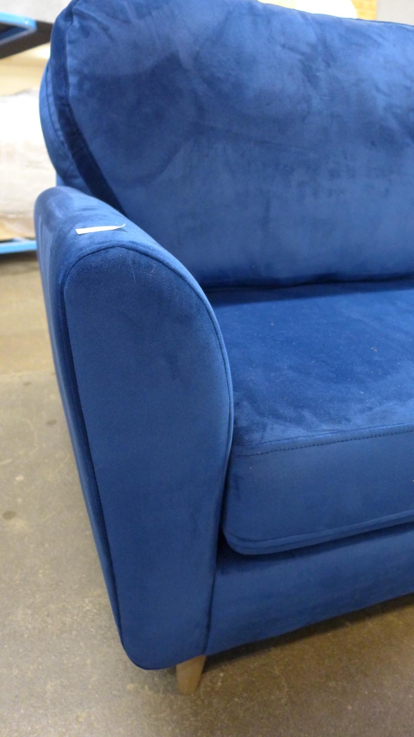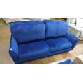 A blue velvet three seater sofa with choice of back cushions (plain or buttoned)