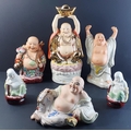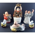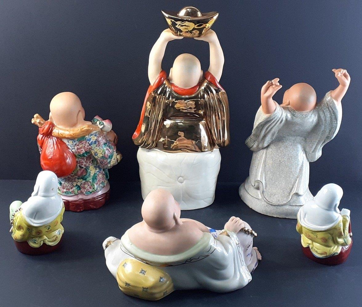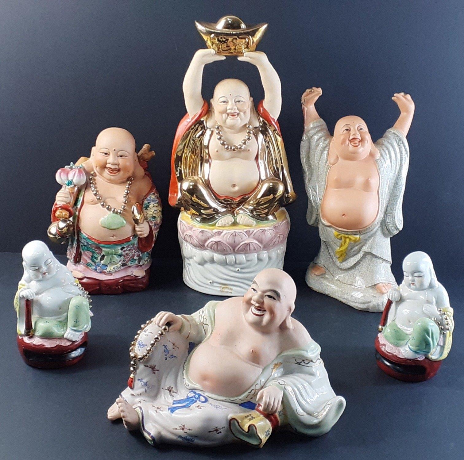 A collection of six assorted modern laughing BUDDHAS. The largest 39cm approx.