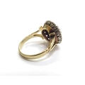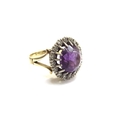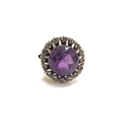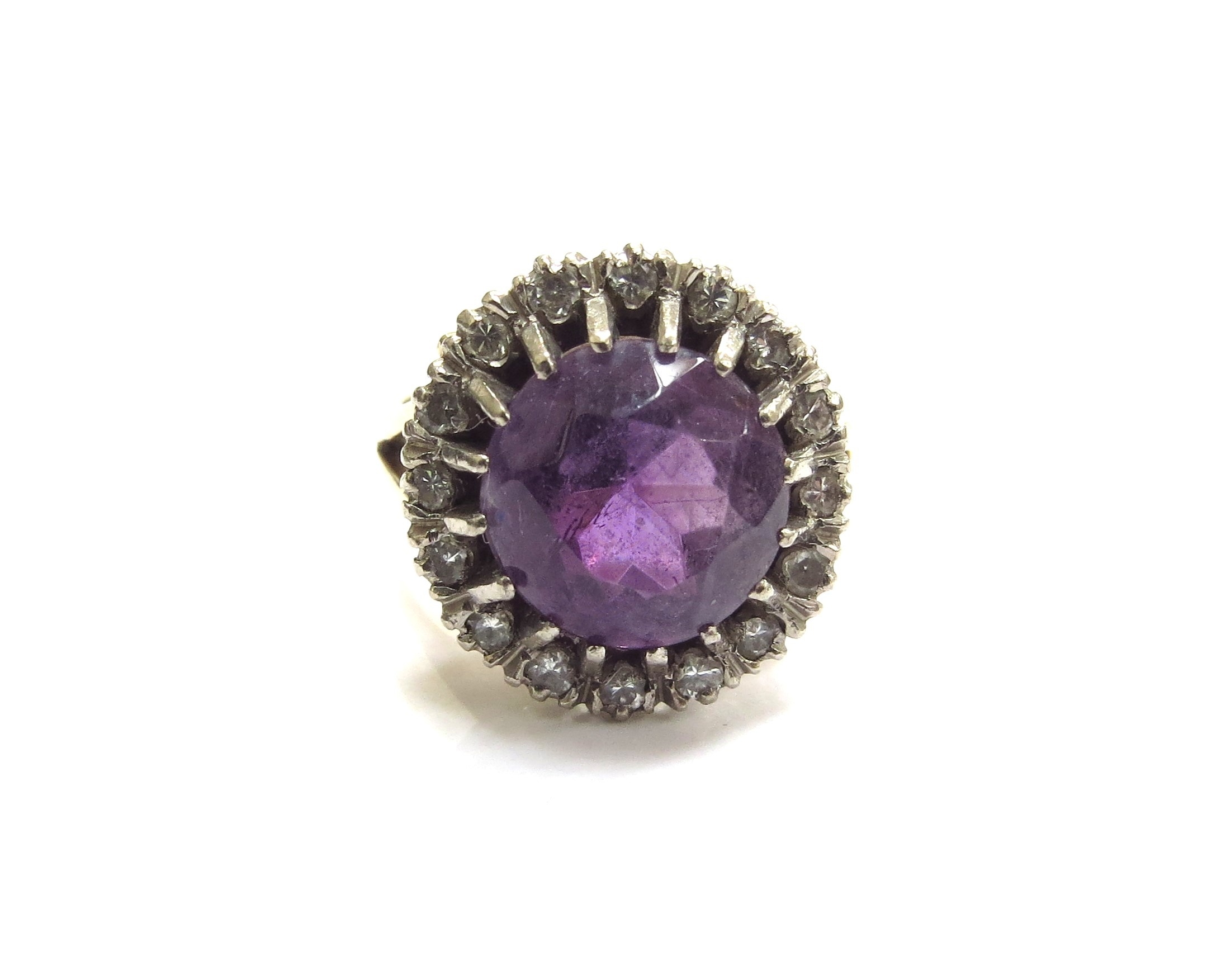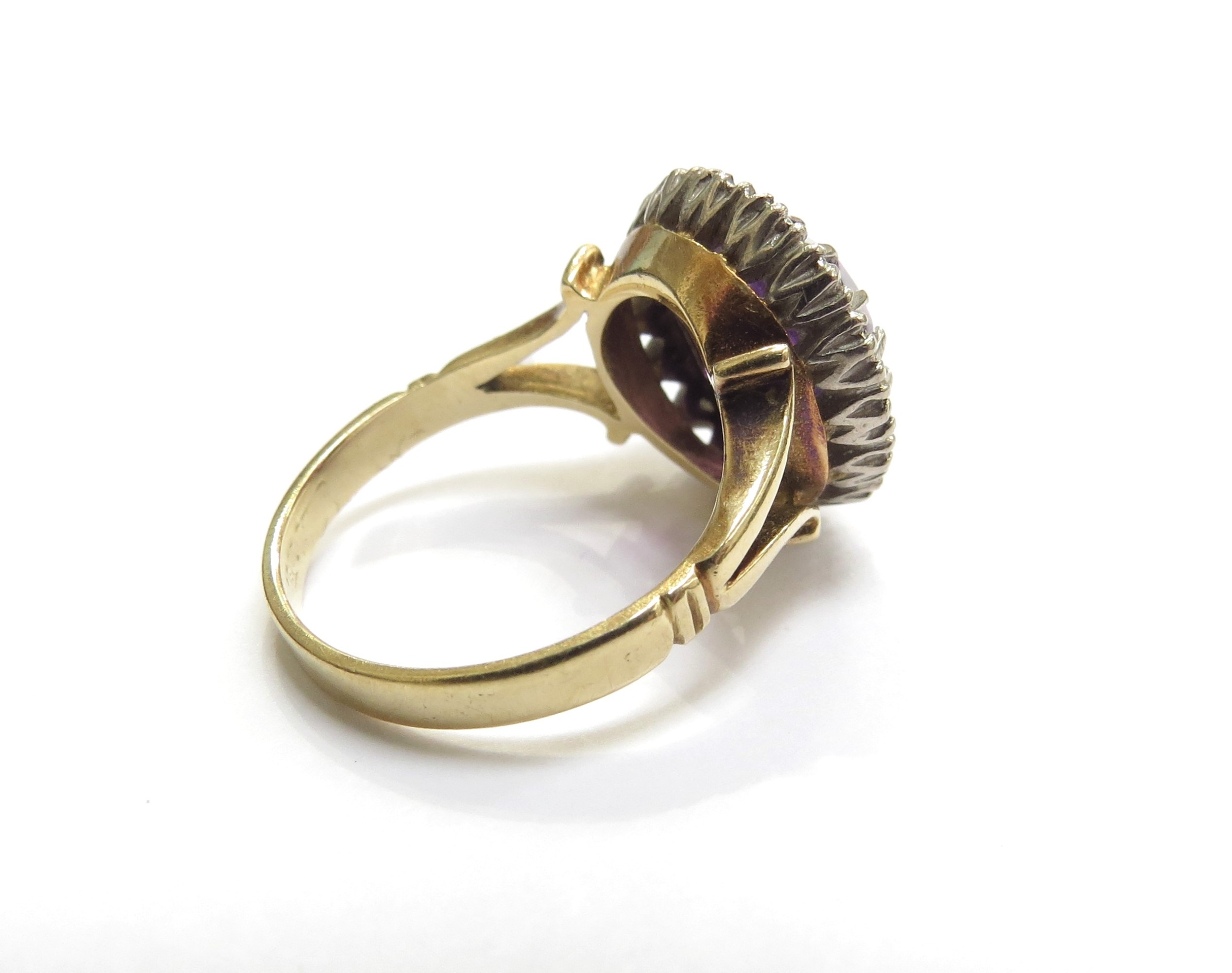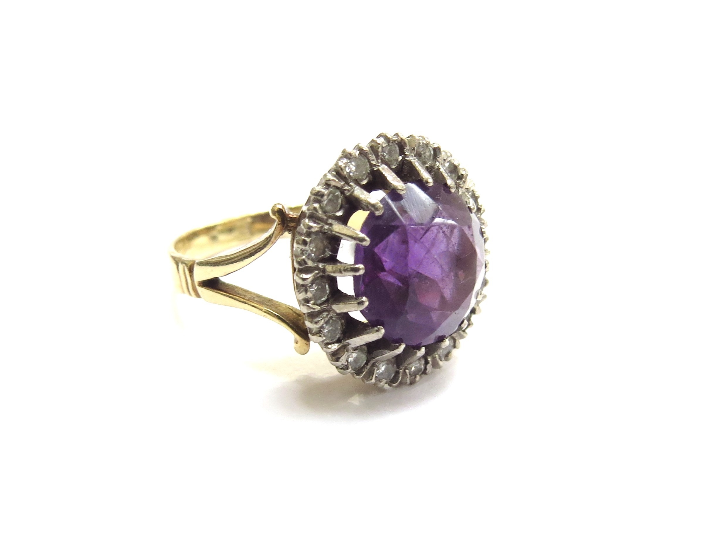 An 18ct gold amethyst and diamond cluster ring the central round amethyst 11mm diameter framed by brilliant cut diamonds. Size N/O, 7g
