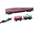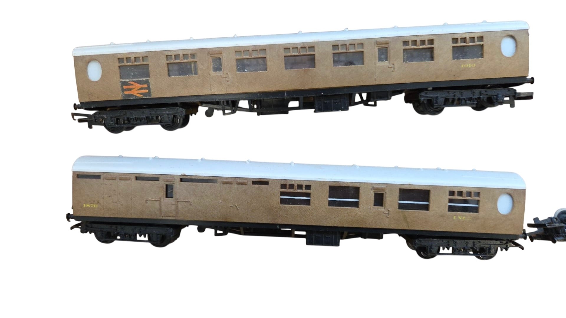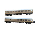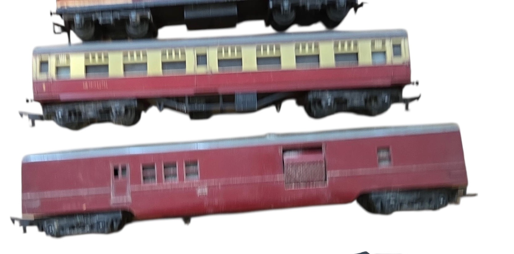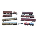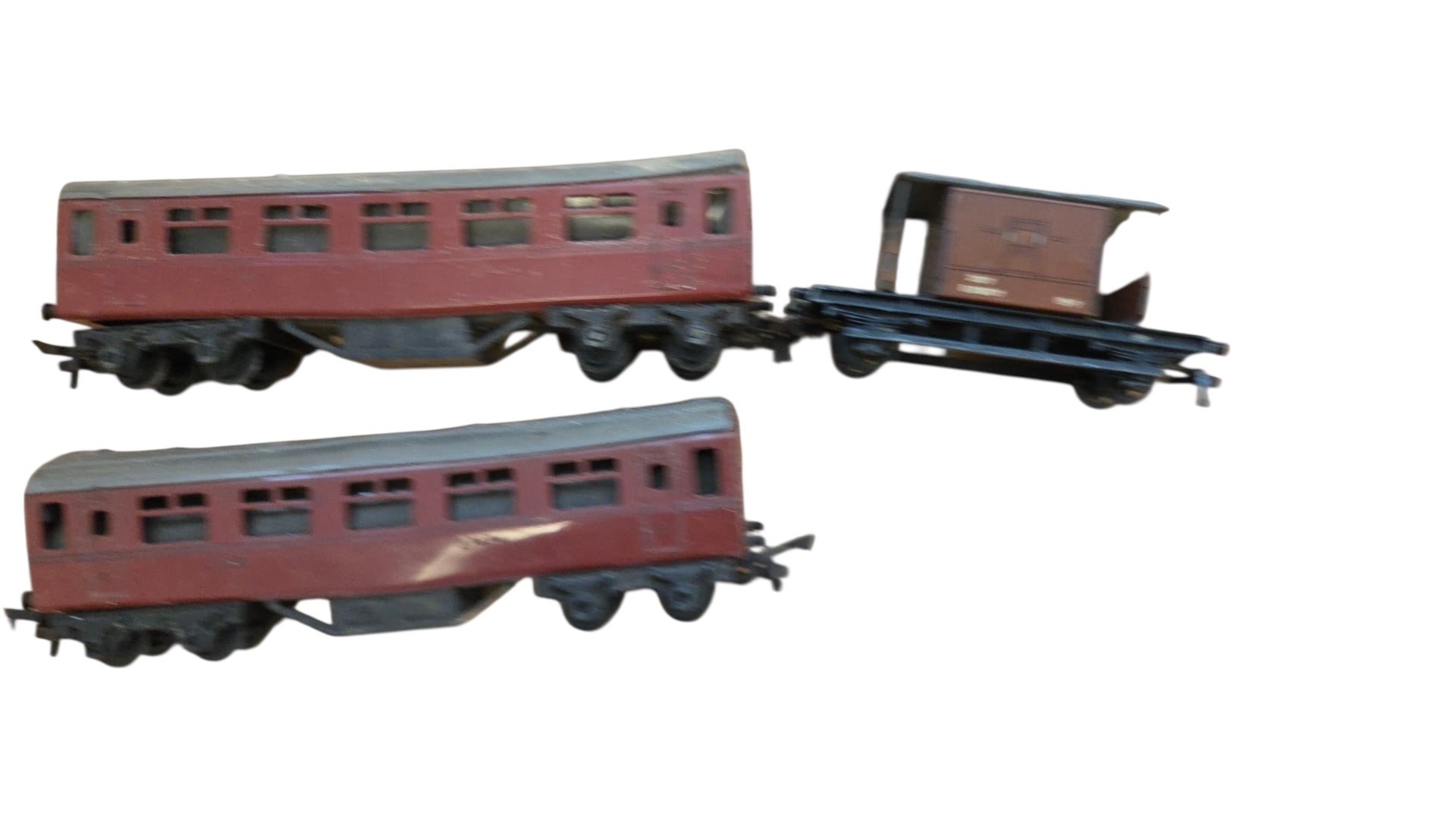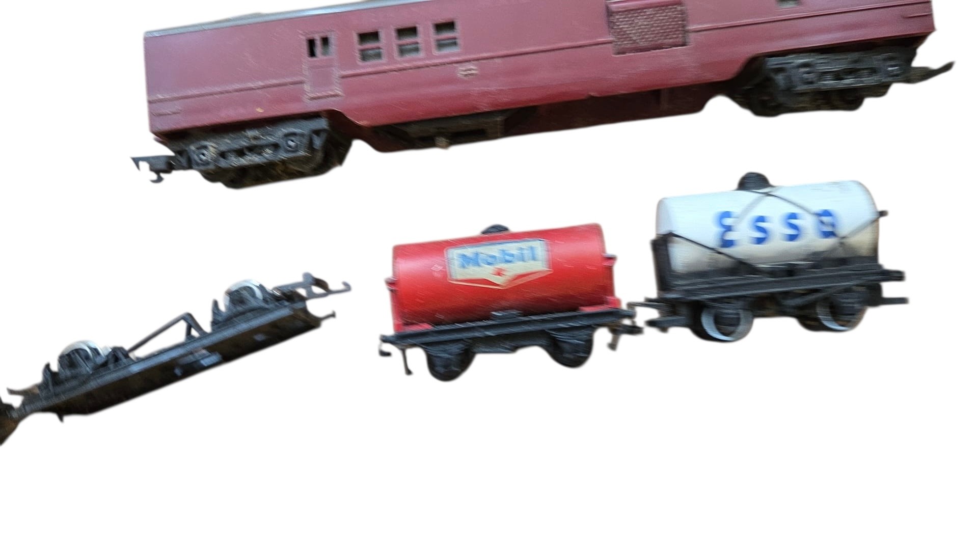 A group of vintage mainly Hornby model railway rolling stock, including passenger coaches in maroon and two-tone livery, together with assorted wagons including Mobil and Esso tank cars; various plastic and metal construction, some bearing printed markings.