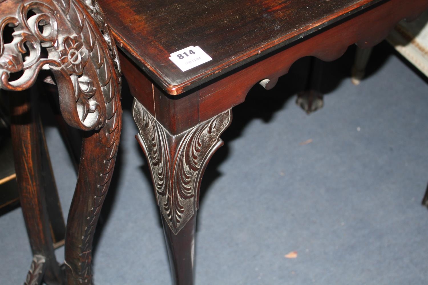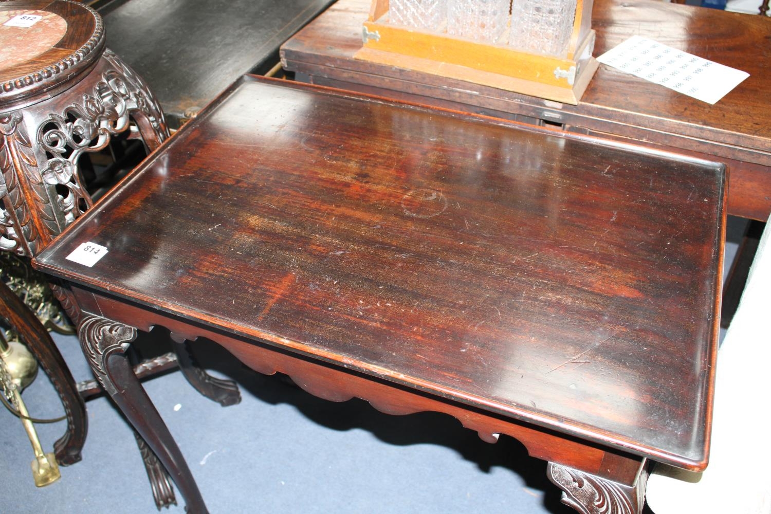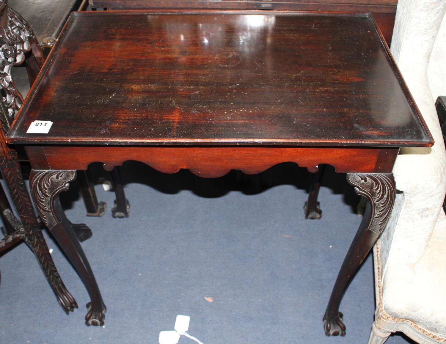 A George II style mahogany silver table, with dished rectangular top and acanthus carved cabriole legs with claw and ball feet, W.76cm D.50cm H.73cm