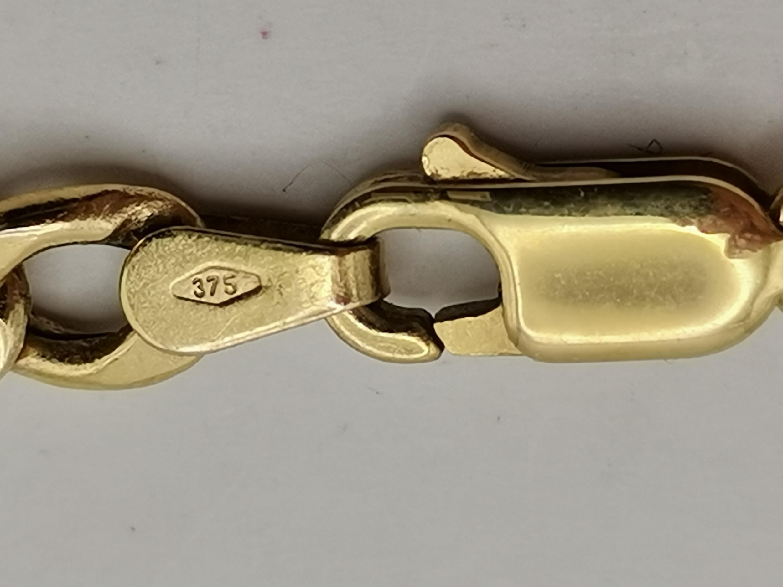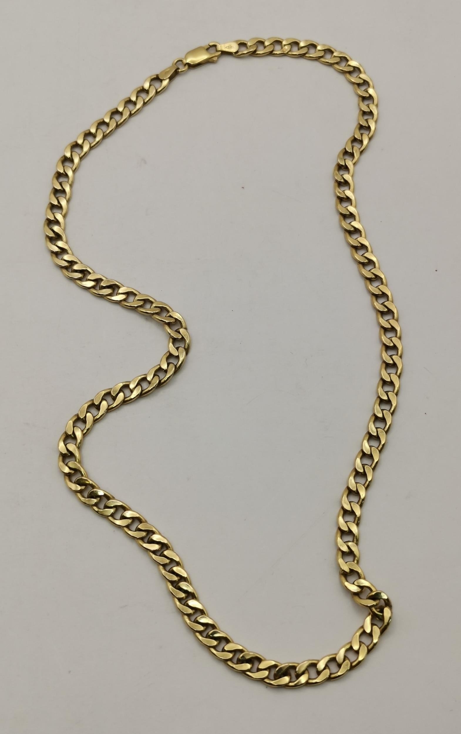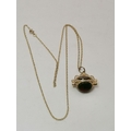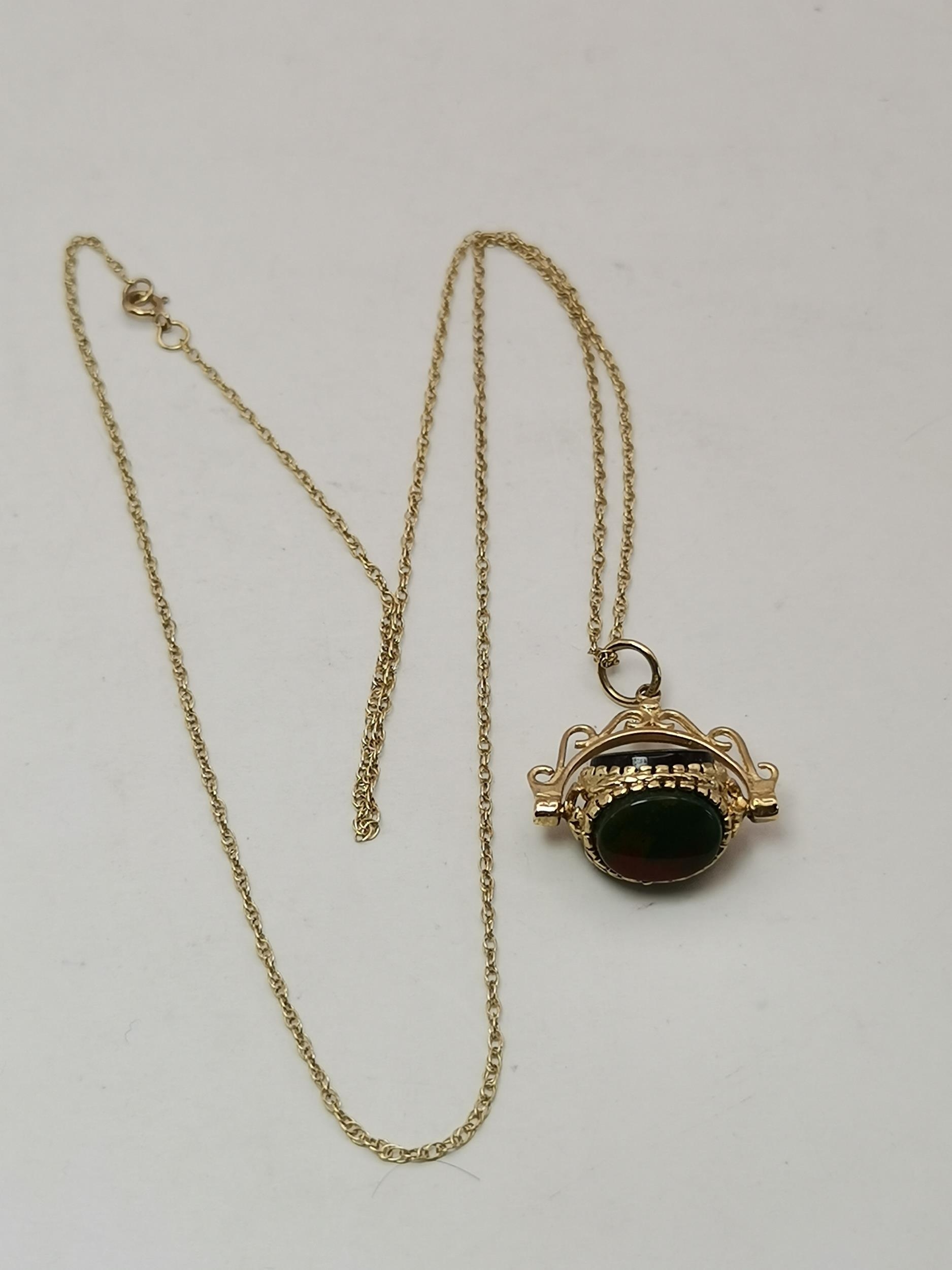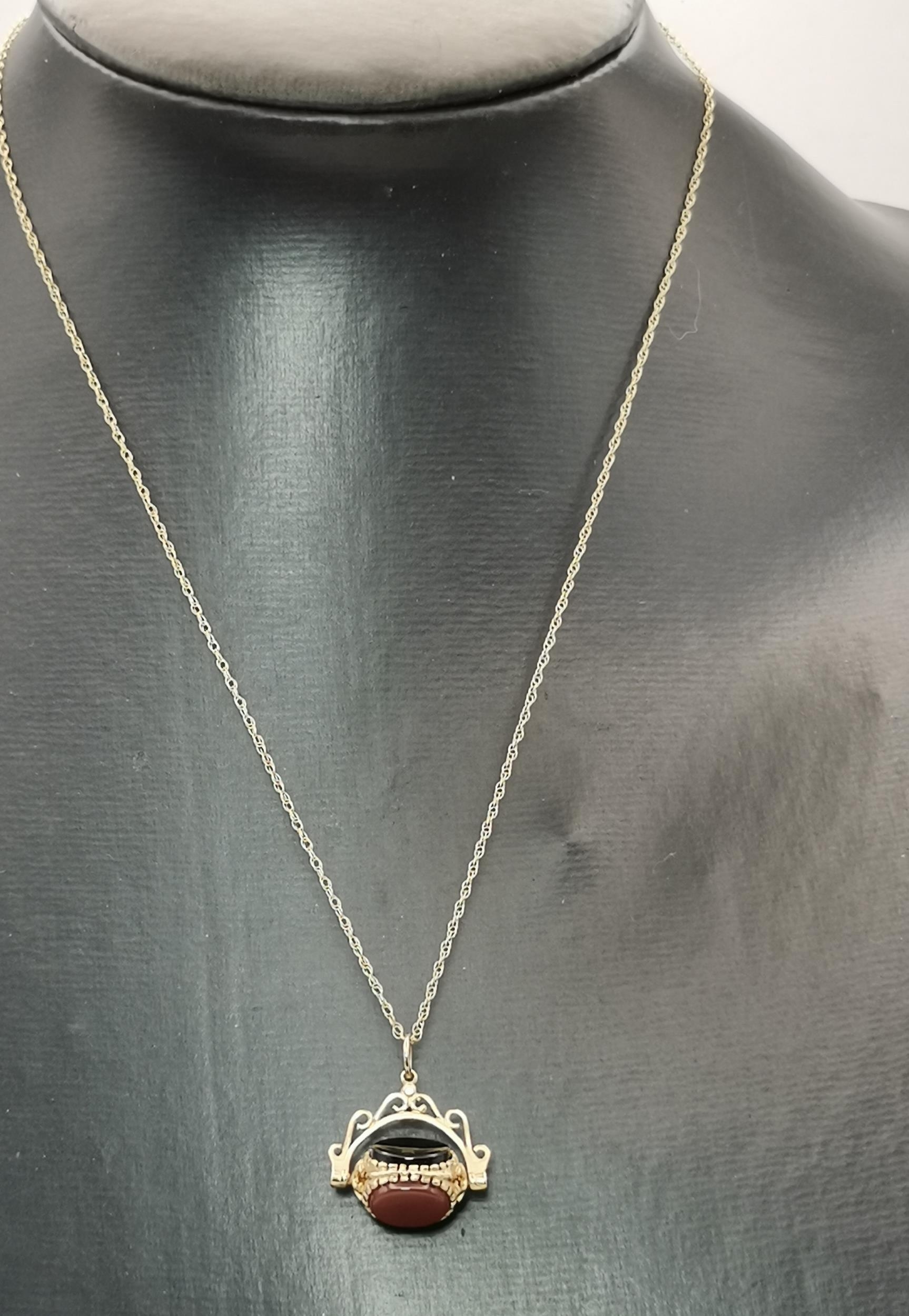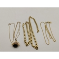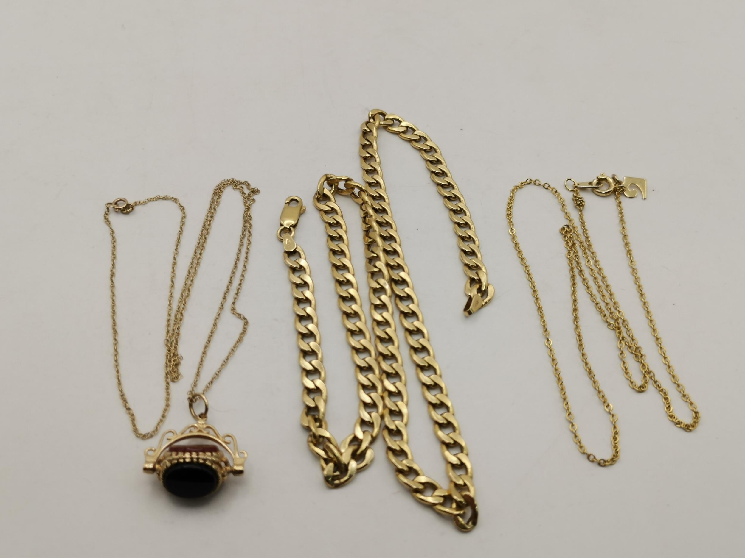 A 9 carat gold-mounted hardstone swivel fob, hallmarked 375, to a fine loose rope chain, stamped 9k; and a 9 carat gold cuban chain necklace, hallmarked 375; together with an unmarked yellow metal chain. (3) Cuban chain 46cm long, marked gold 11.6g gross