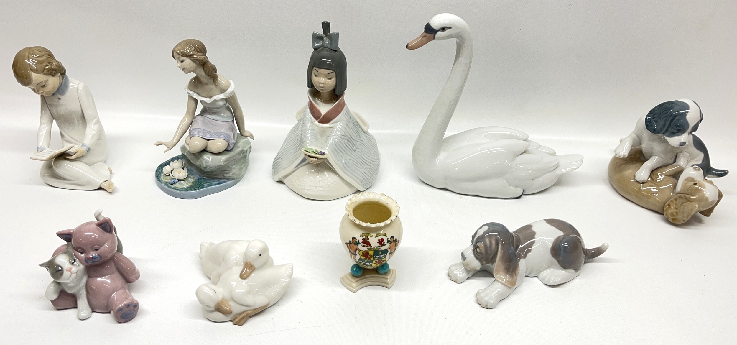 Collection of Lladro figures incl. Reflections of Helena figure, Geisha, etc. and a small Goss crested china vase (9) max. H20cm