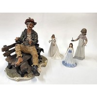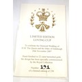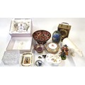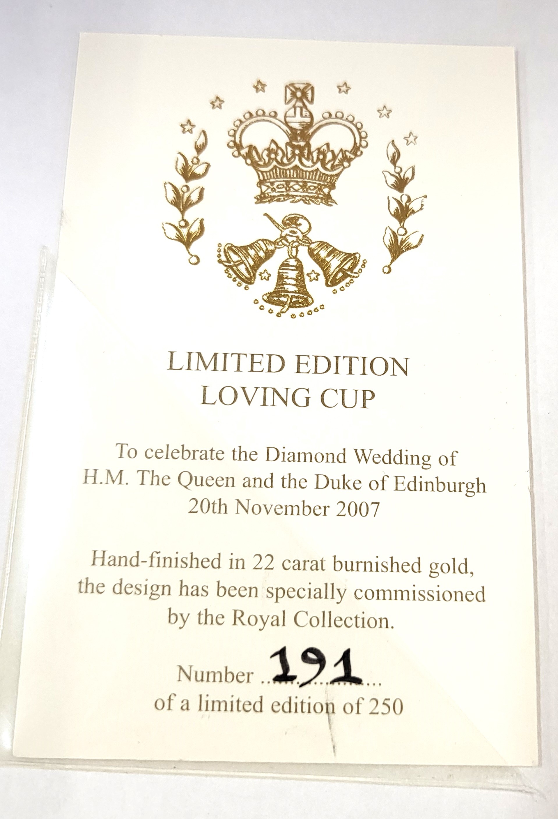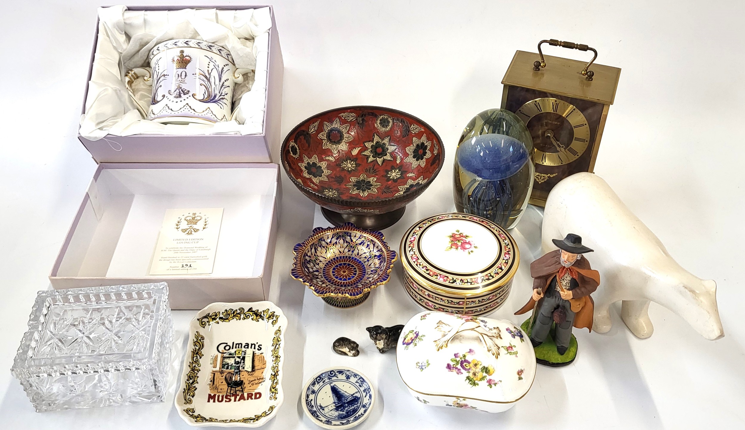 A boxed limited edition Loving Cup (191 of 250) celebrating the diamond wedding of HM Queen Elizabeth II and the Duke of Edinburgh hand finished in 22ct burnished gold, a glass florescent jellyfish-effect paperweight, a Cloisonné dish, a large red Cloisonné dish, two trinket boxes, a Carbonel figure, a glass cigarette box/ ashtray, a Polar Bear, and a carriage-style mantle clock.