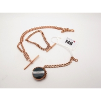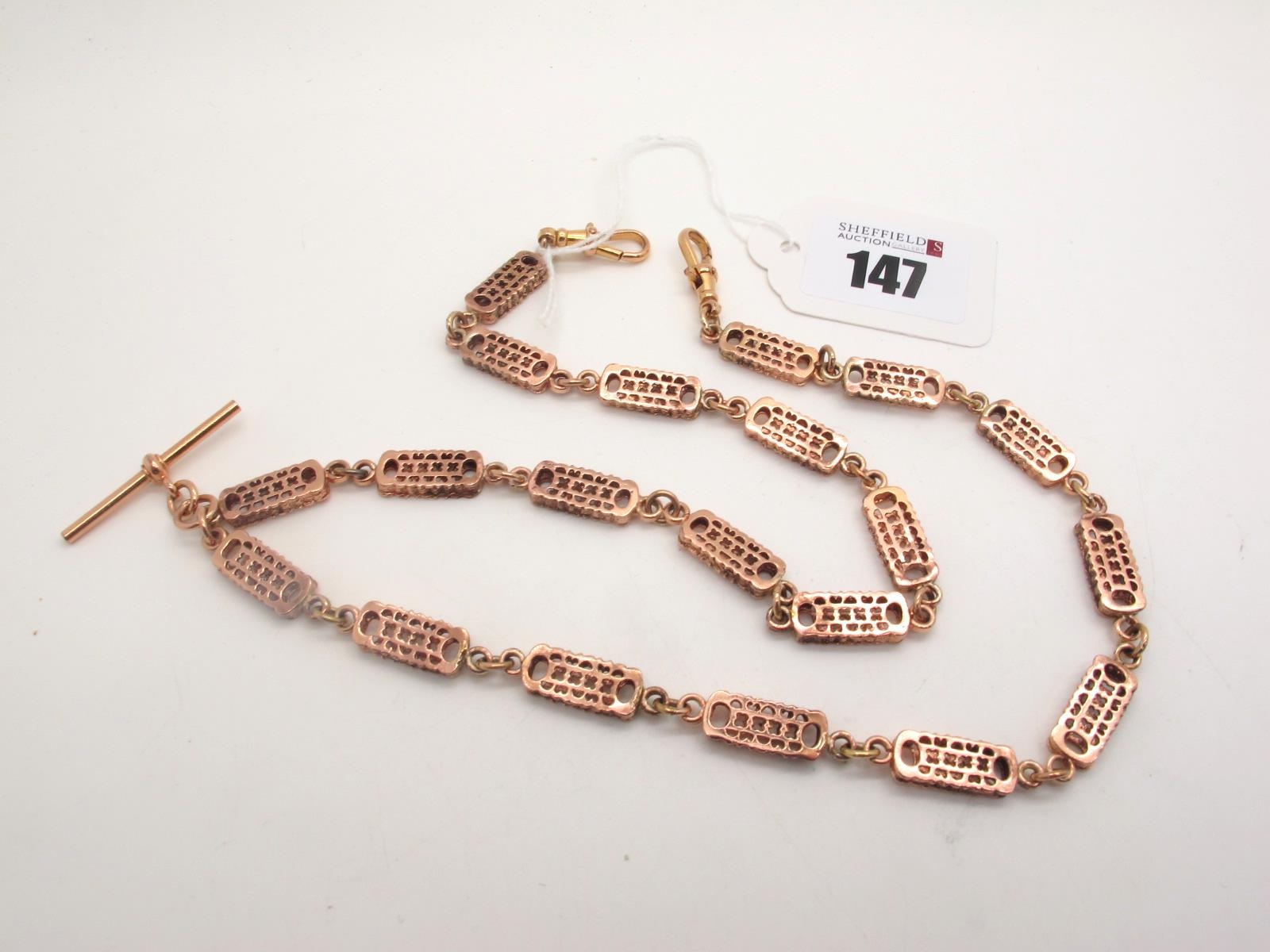 A 9ct Rose Gold Fancy Link Double Albert Chain, of Victorian style, to double swivel style clasps, suspending a T-bar, 58.5cm long (overall weight 44grams).
