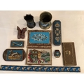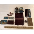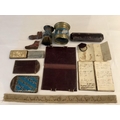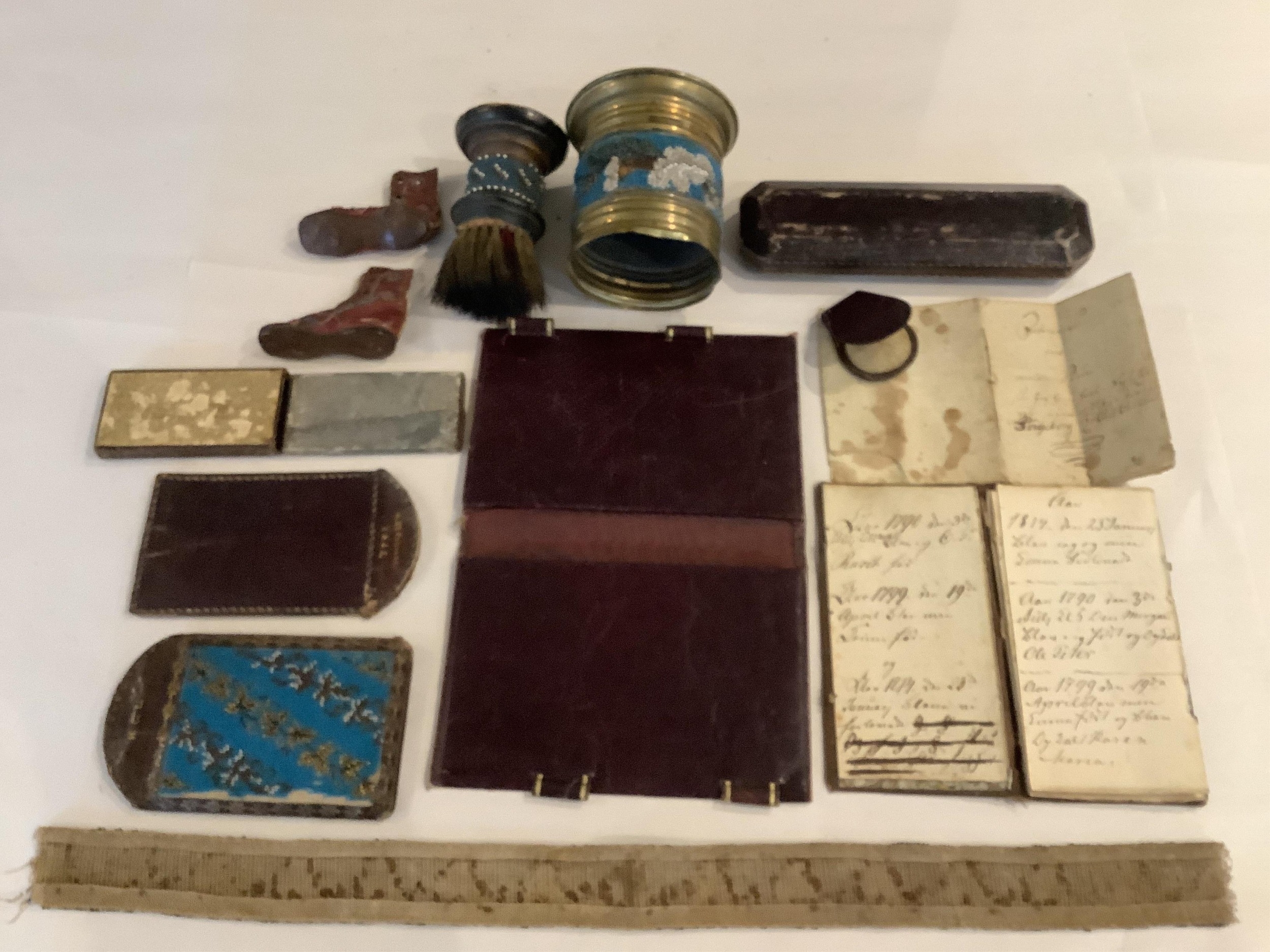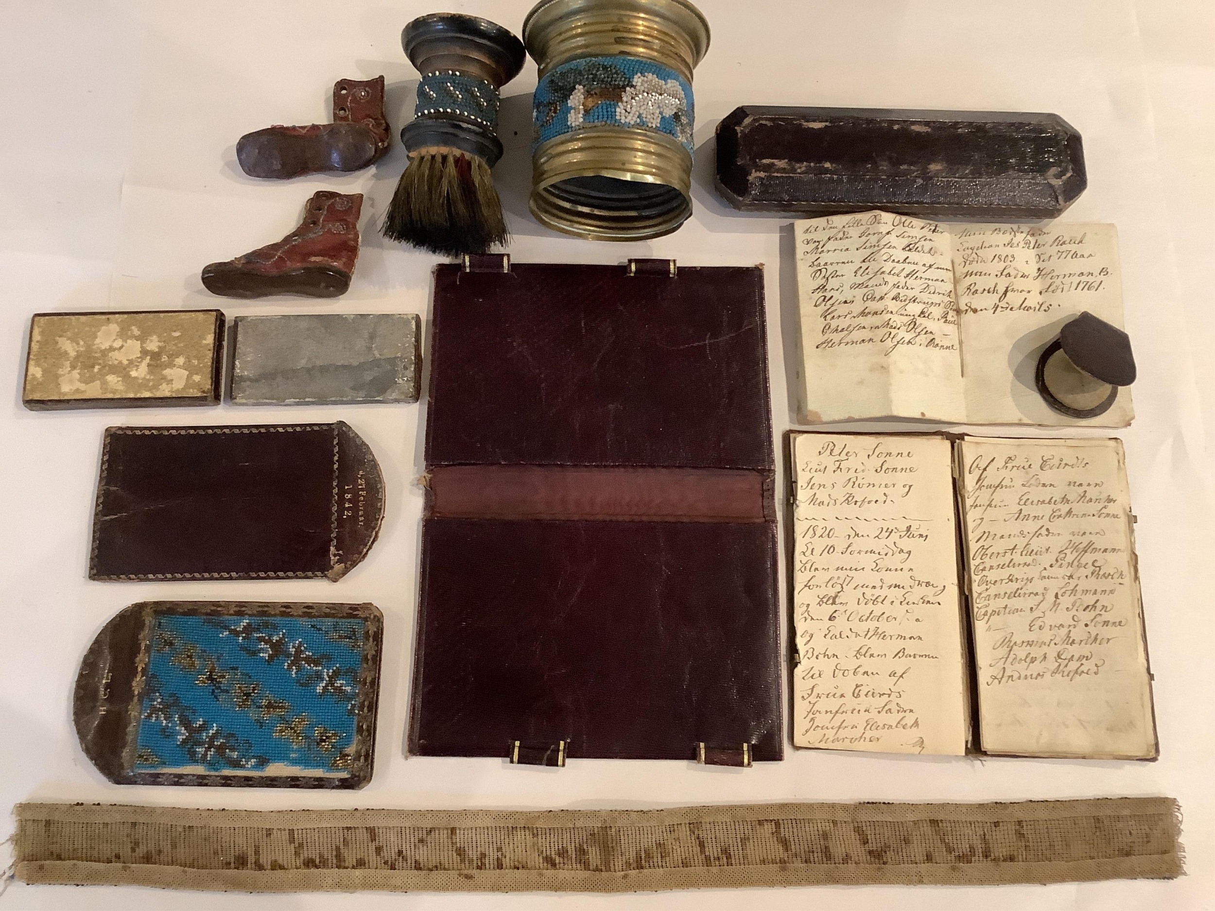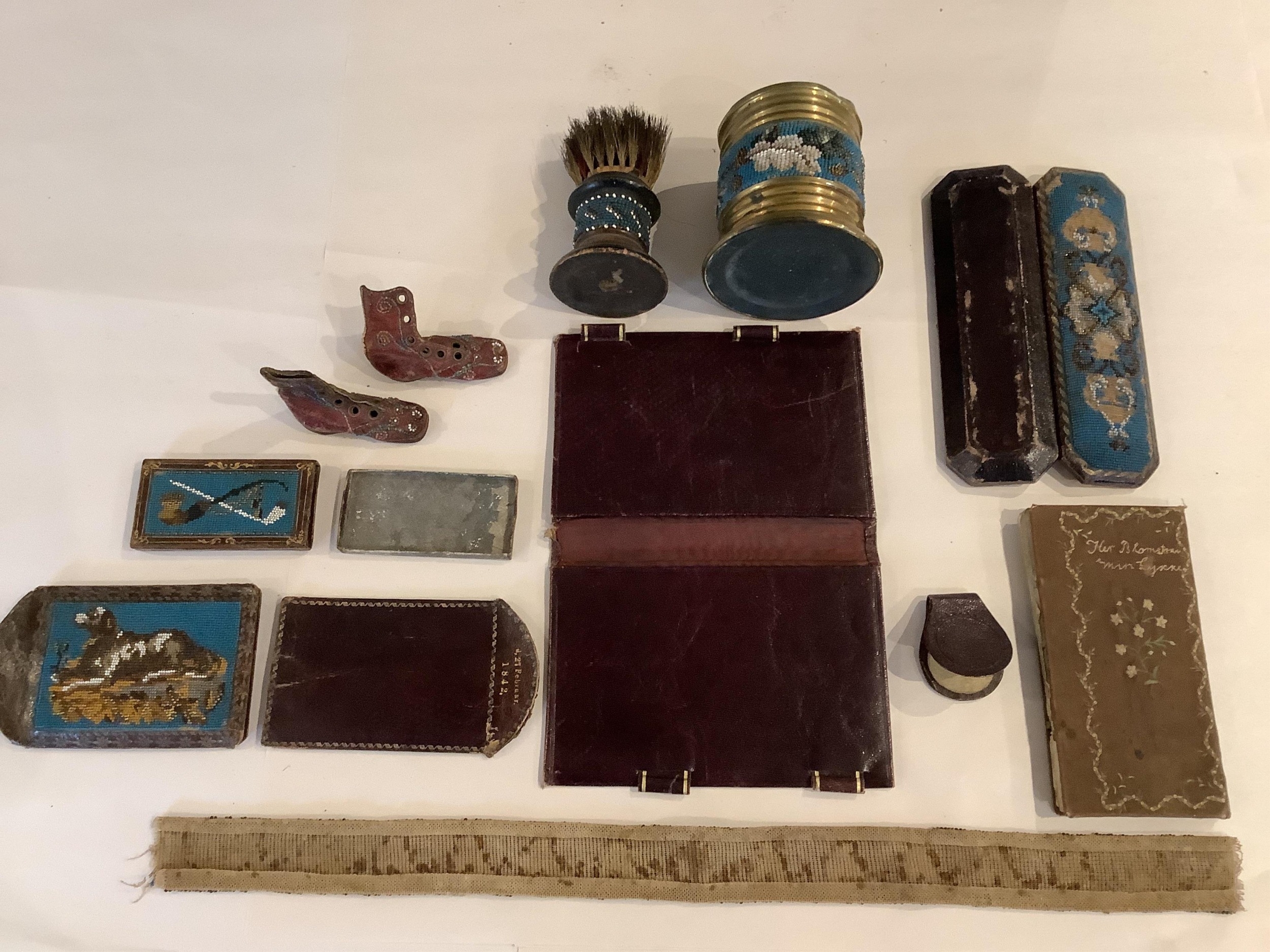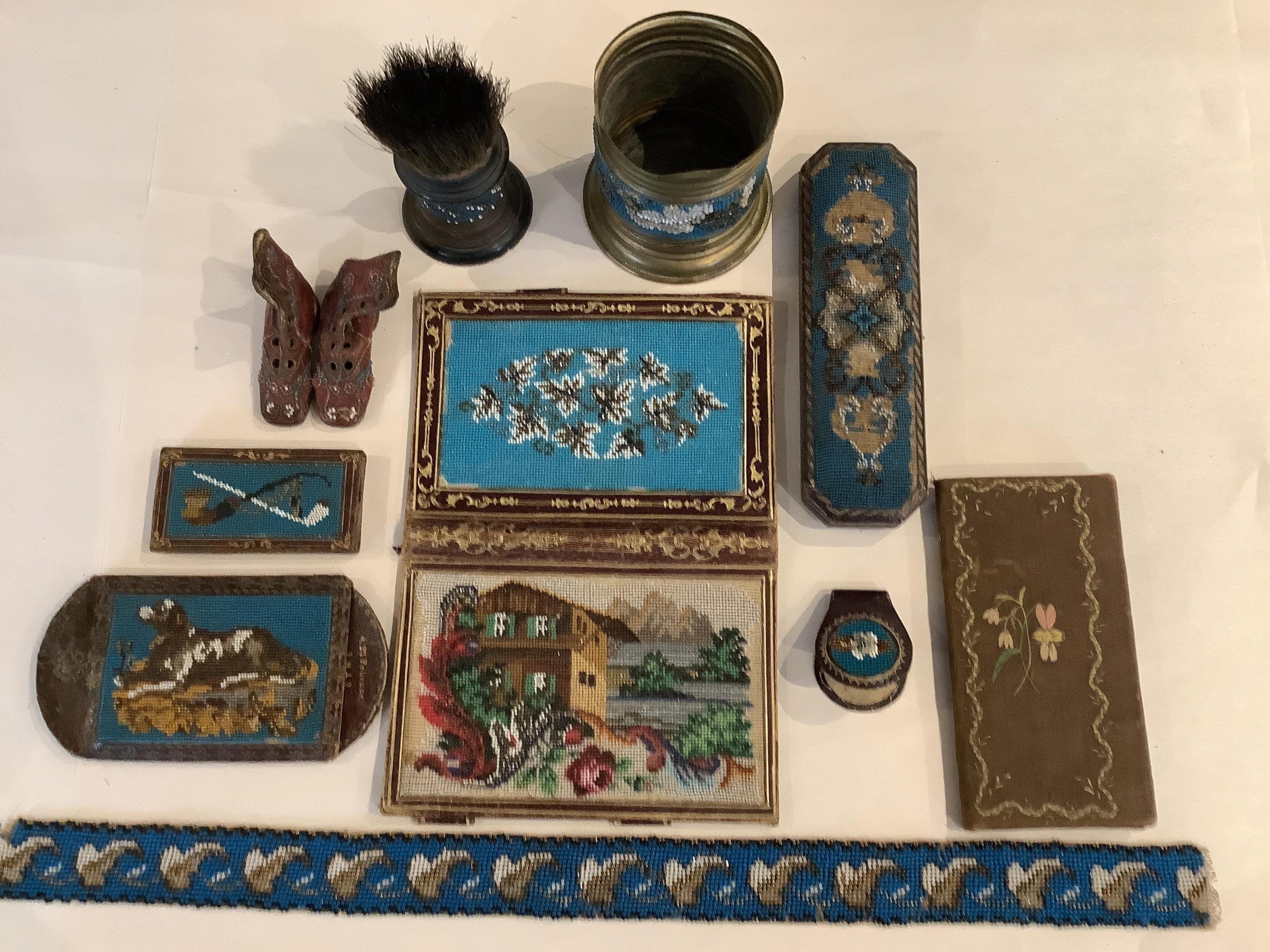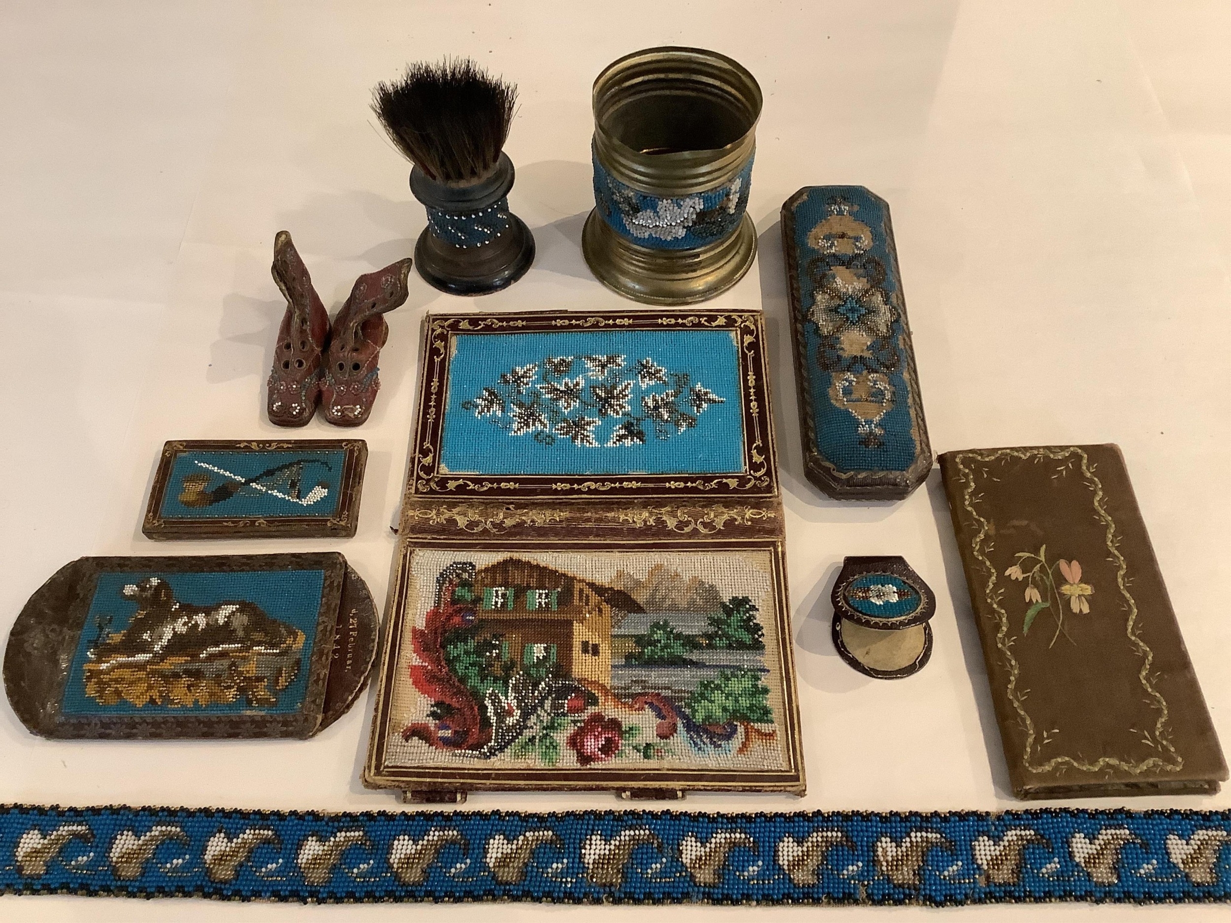 A collection of fine Berlin beadwork; to include a 'dog' motif beaded pouch, a shaving brush and container, 8.5cm high, wallet 16cm high, a glasses case, a match case, a clip, miniature boots, a beaded panel and an embroidered note book (11).