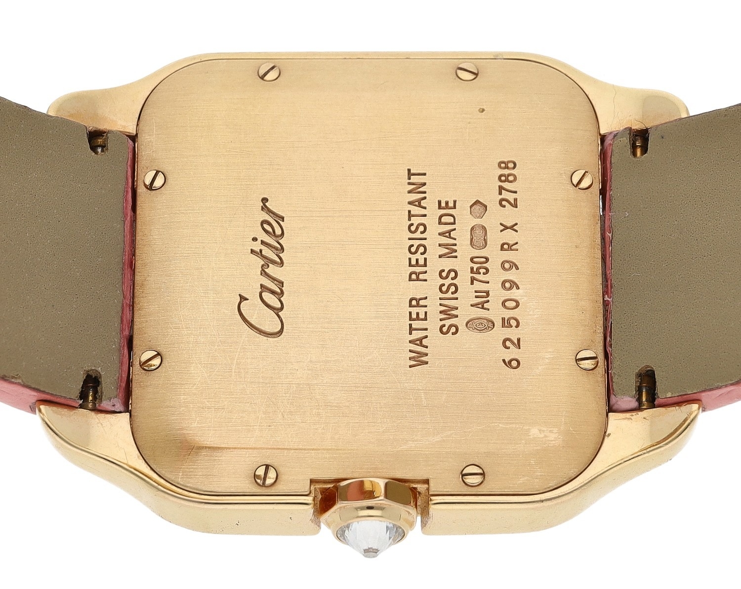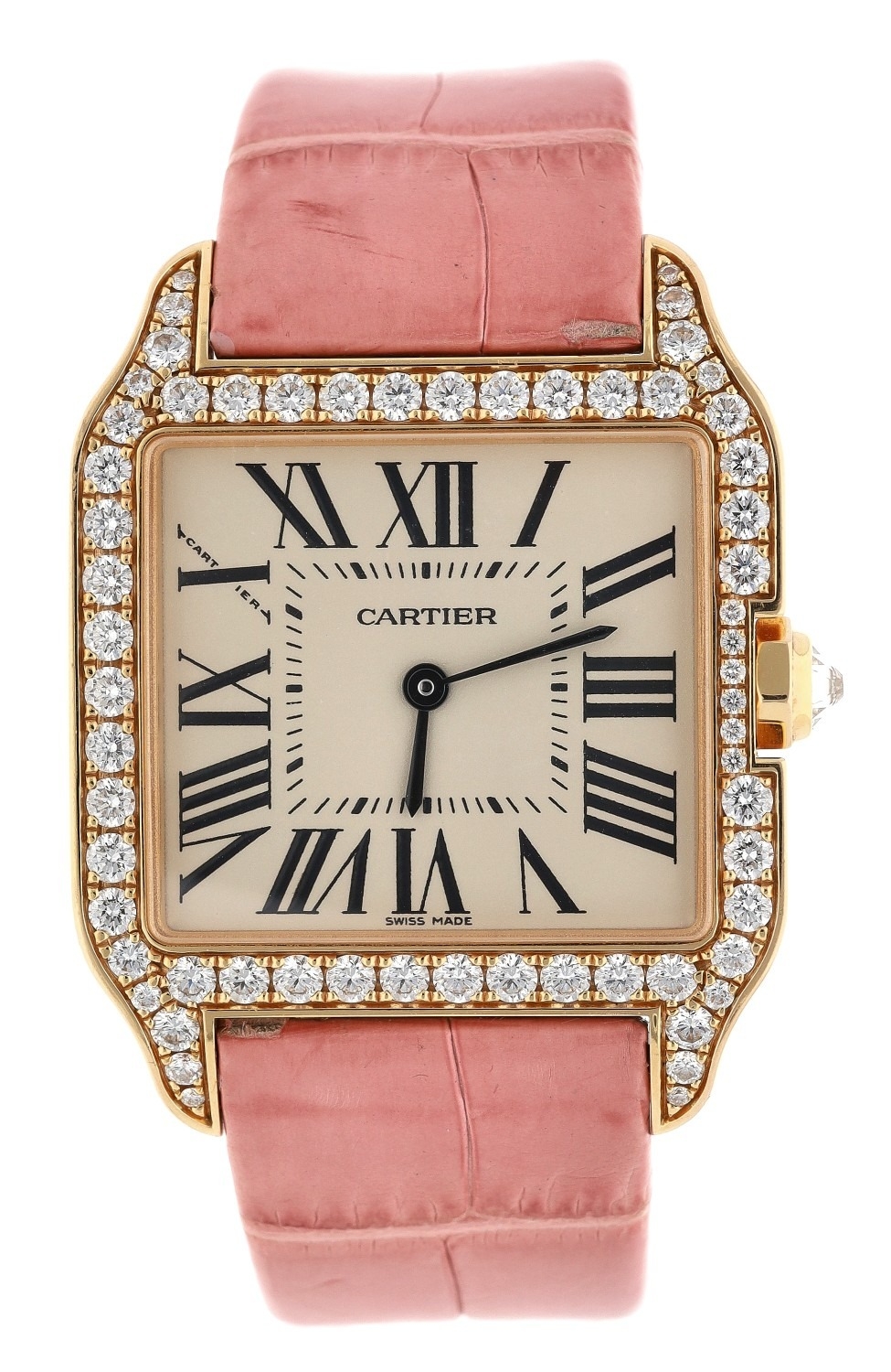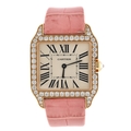 Cartier Santos Dumont 18ct and diamond set lady's wristwatch, reference no. 2788, serial no. 62509xxx, silvered dial, diamond set bezel, diamond crown, Cartier pink leather strap with signed 18ct folding clasp, quartz, 31mm (ref: 205)