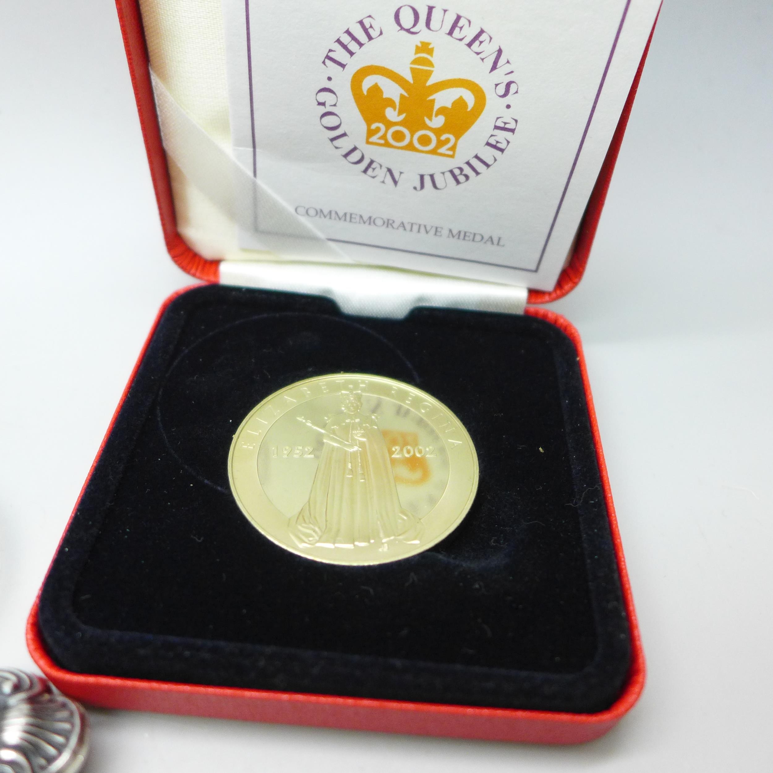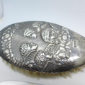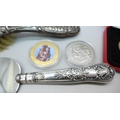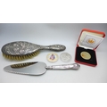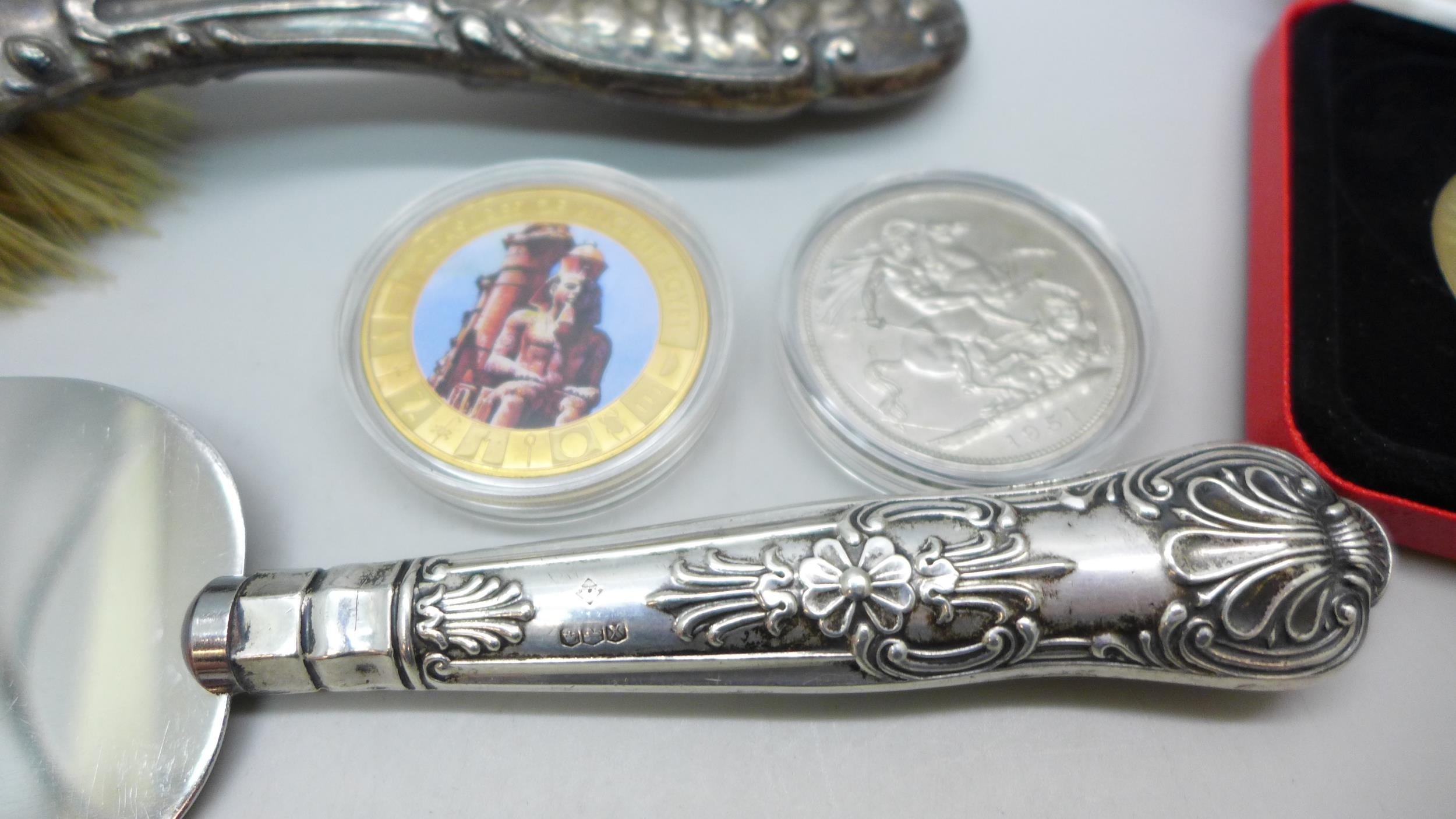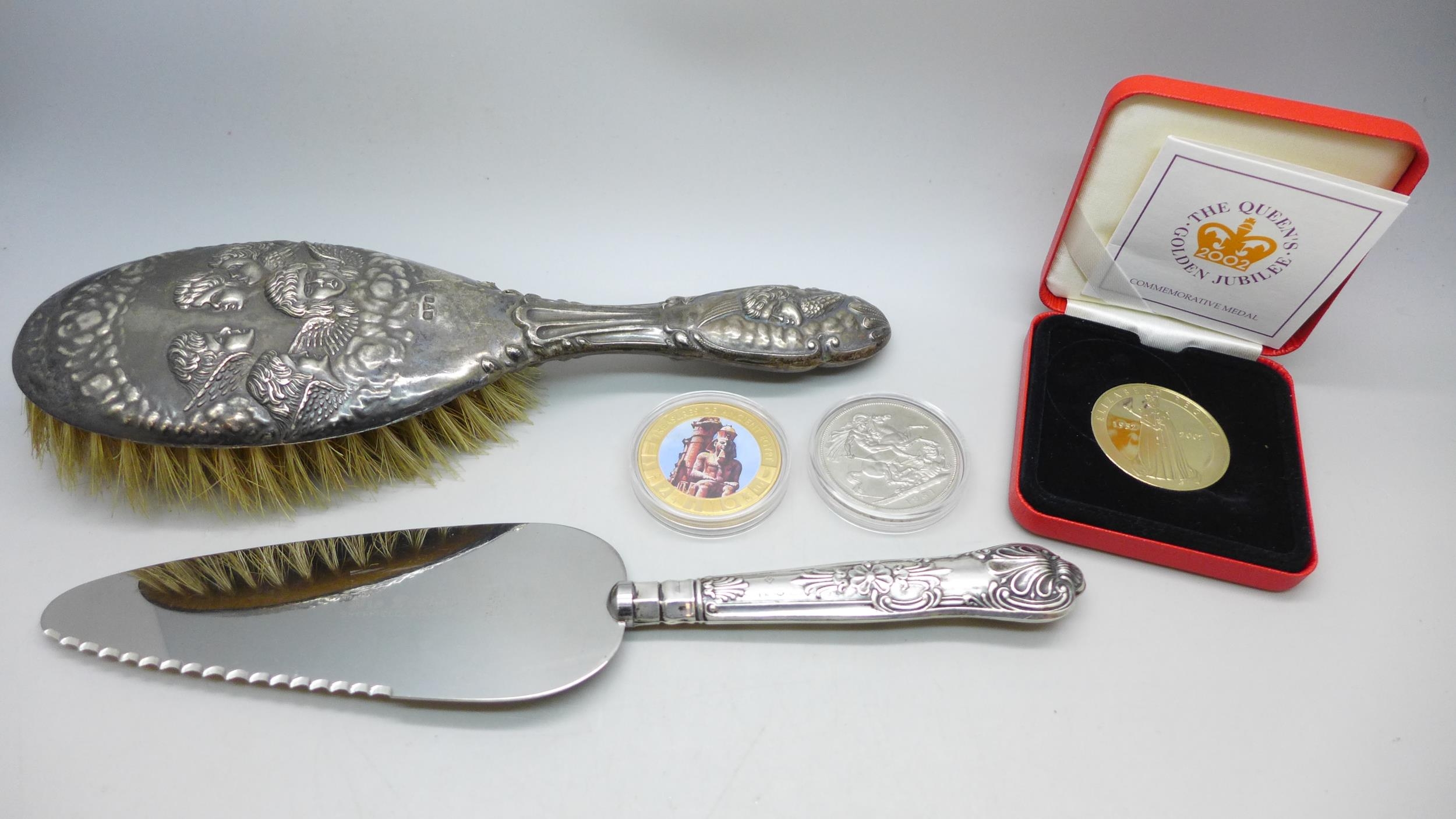Three coins, and two pieces of silver including a silver backed brush with Reynolds Angels design and a silver handled cake slice