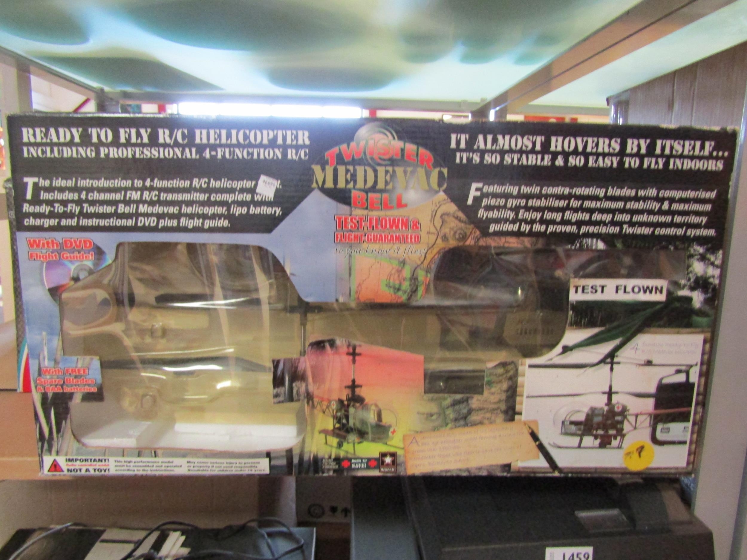 A remote controlled "Twister Bell Medevac" helicopter, boxed, and a remote controlled Ferrari, boxed