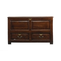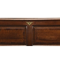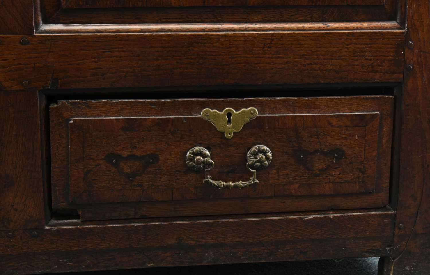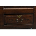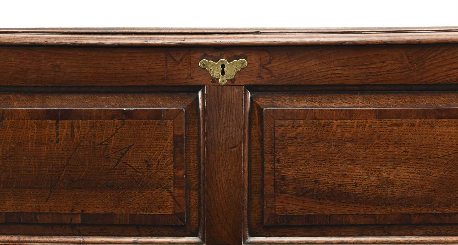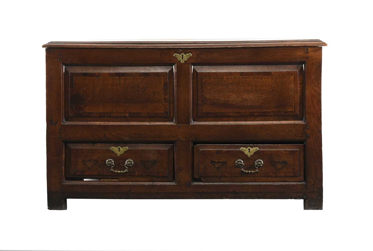 An 18th century elm mule chest The hinged top with moulded edge opening to a plain interior with candle box, above fielded and cross-banded panels and two drawers, raised on extended stiles. 131cm wide x 51cm deep x 78cm high
