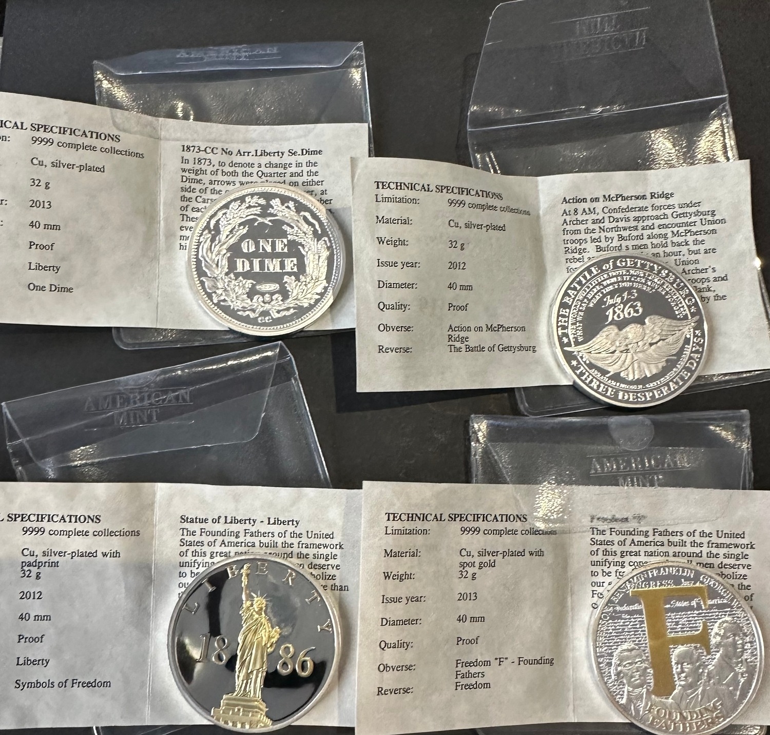 4 American Mint silver plated copper proof coins with COA's in plastic pouches