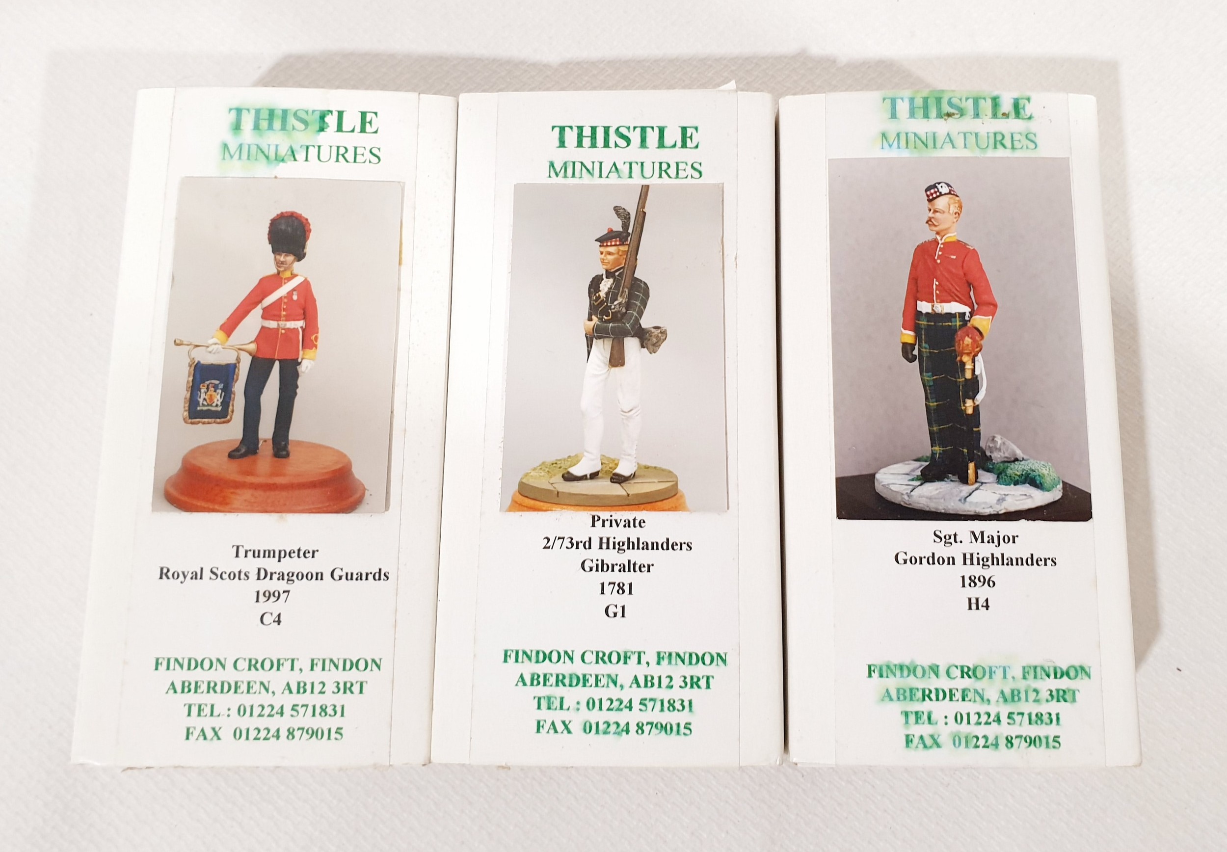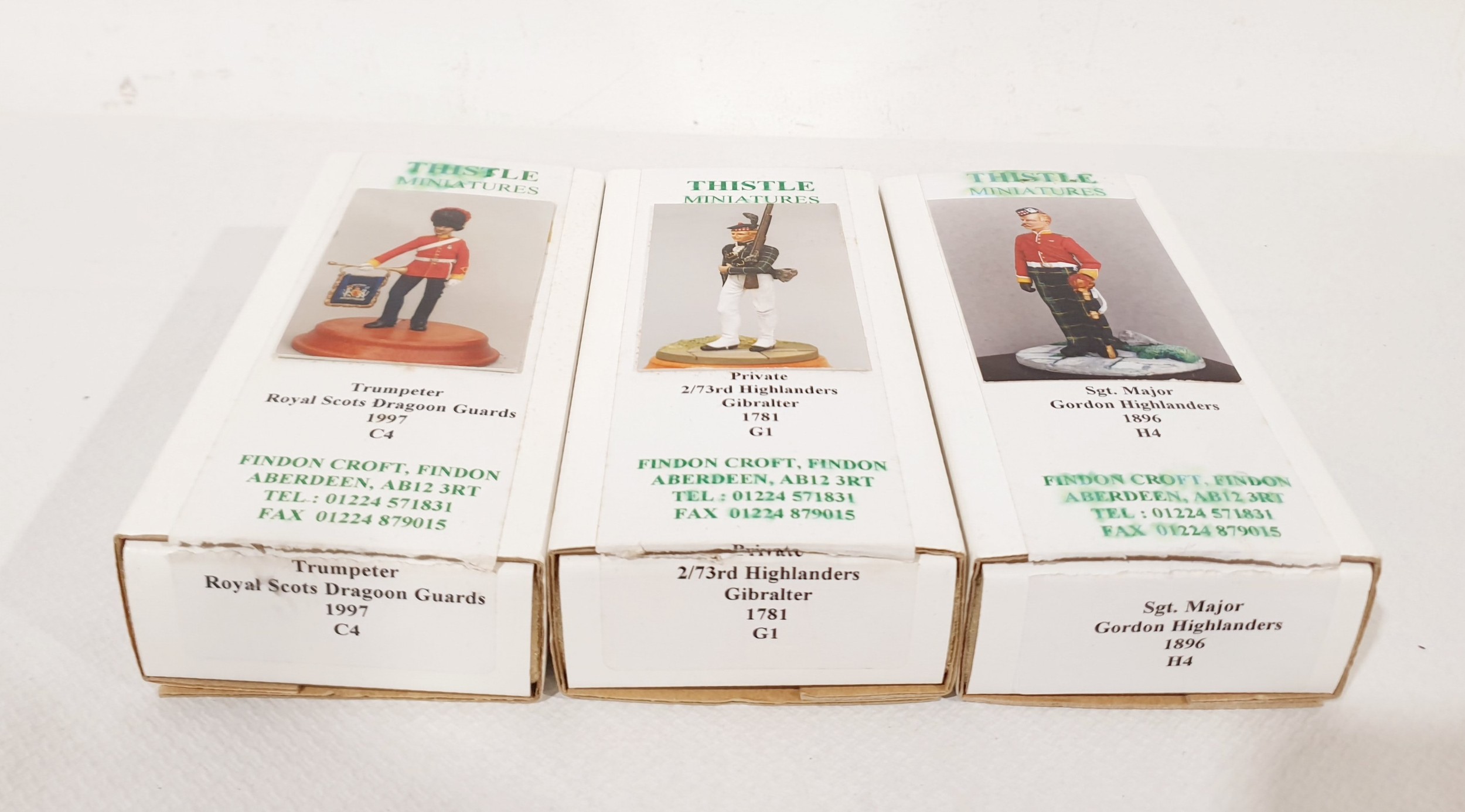 Three Thistle miniatures diecsat figure kits ''Pte 2/73rd Highlanders, Gibralter', Trumpeteer Royal Scots Dragoon Guards' & 'Sgt Major Gordon Hoghlanders'.