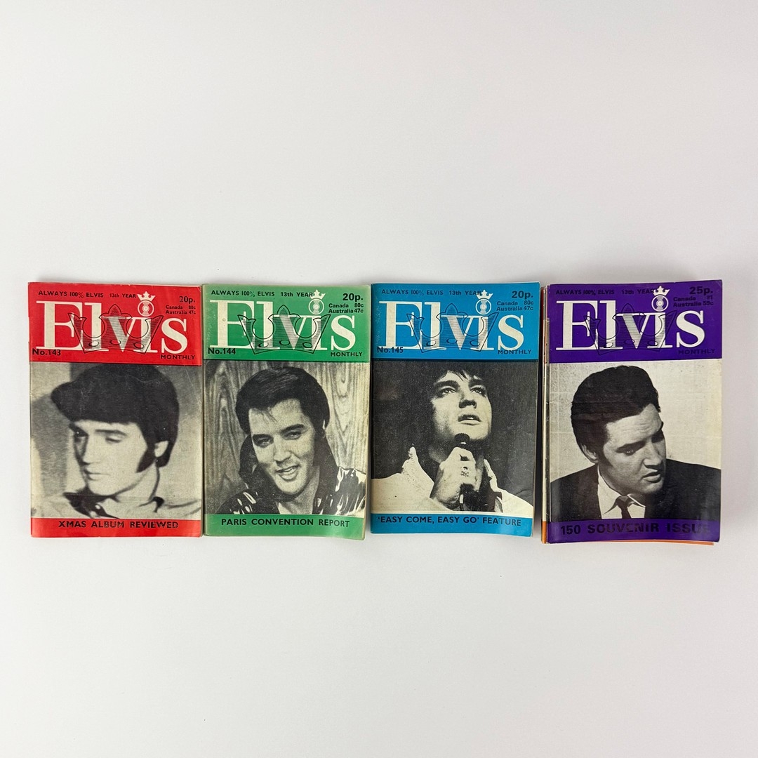 EARLY RUN OF ELVIS MONTHLY MAGAZINE, 1963-1978. A large, broken run of Elvis Monthly, the foremost Elvis Presley fan magazine edited by Albert Hand. This collection contains issues from series 4 (1963) through series 19 (1978). Issues are in mostly very good condition. Some volumes have a slight bend from being stored on their side. Some volumes have previous owners inscription in pencil to rear cover. Overall, an excellent collection of Elvis fan memorabilia.
