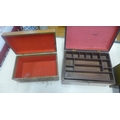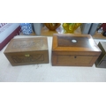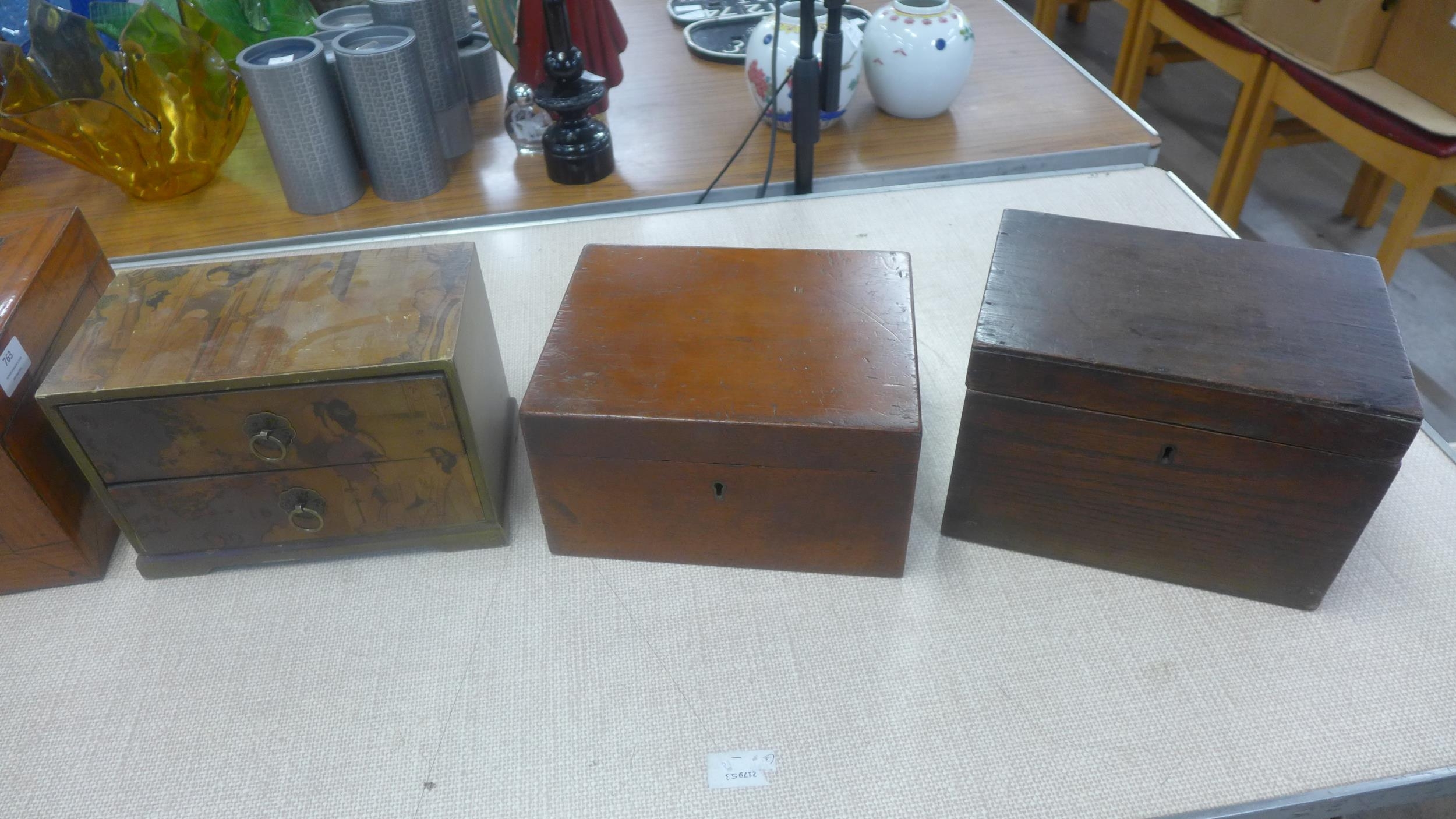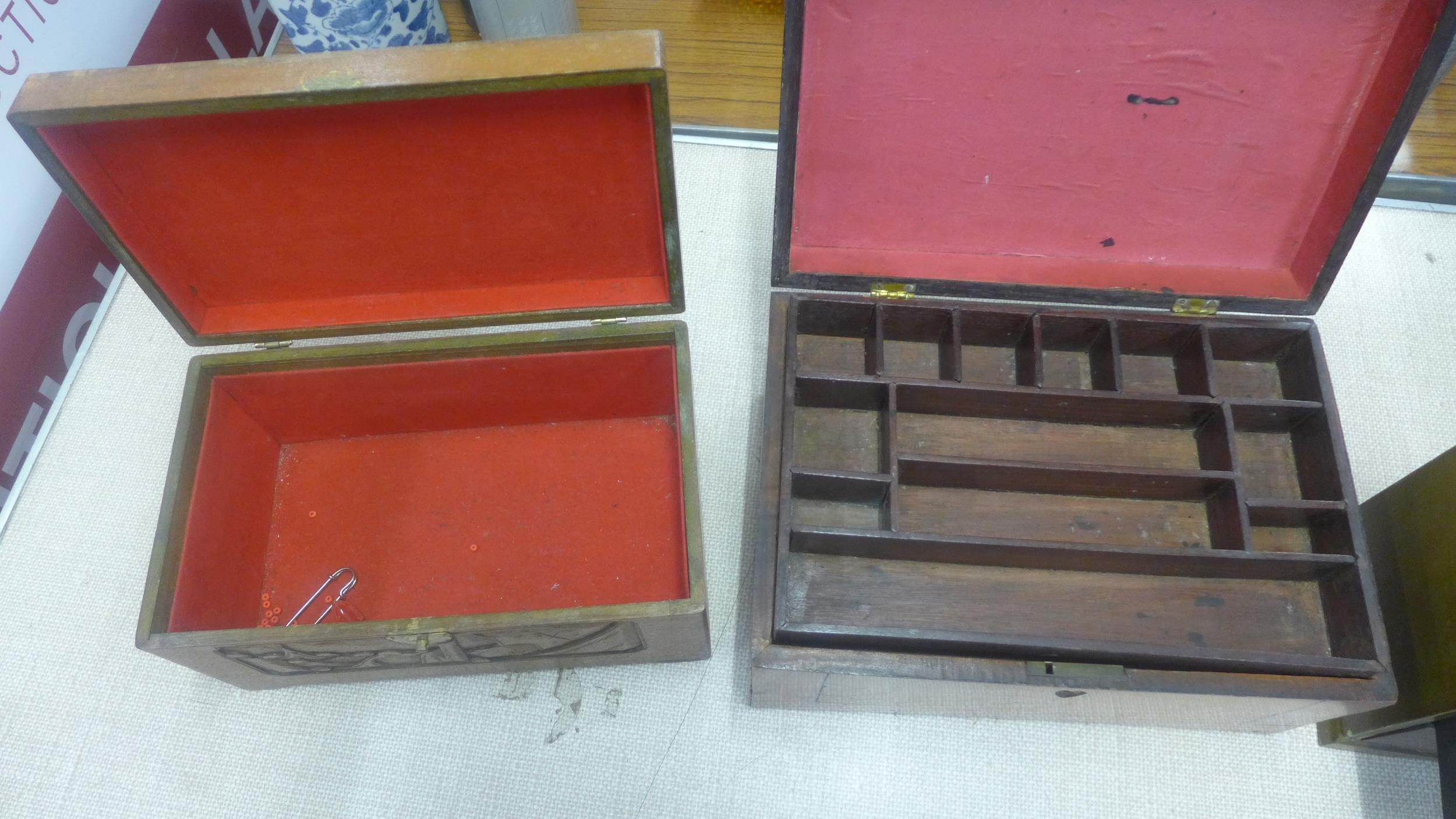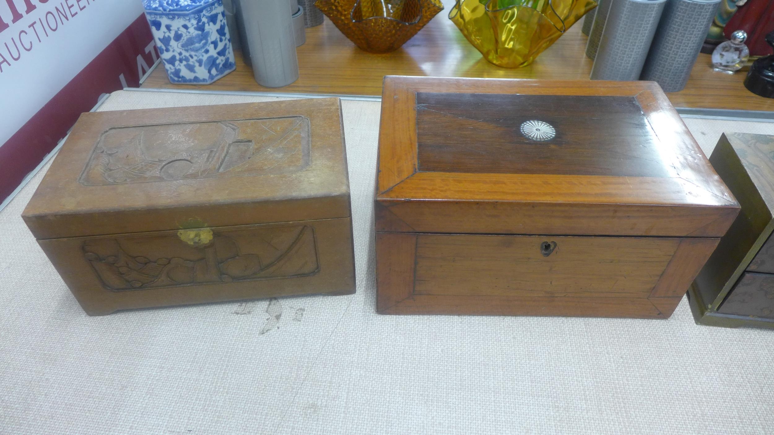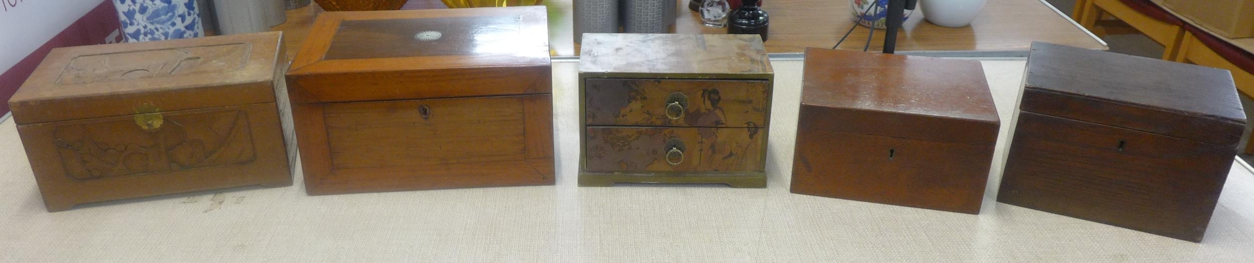 Five wooden boxes; an Edwardian workbox set with mother of pearl, a Chinese two drawer cabinet, carved box and two others